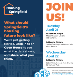 Attend one of three Housing Springfield open houses this April to learn about the project and help shape a citywide plan for housing policy and investment.