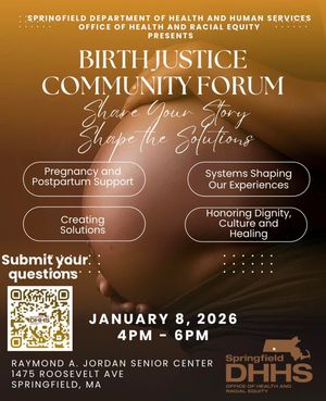Please join the Springfield Dept of Health & Human Services, Office of Health & Racial Equity for a Birth Justice Community Forum focused on centering lived experiences and advancing equitable, community-driven solutions related to pregnancy, birth…
