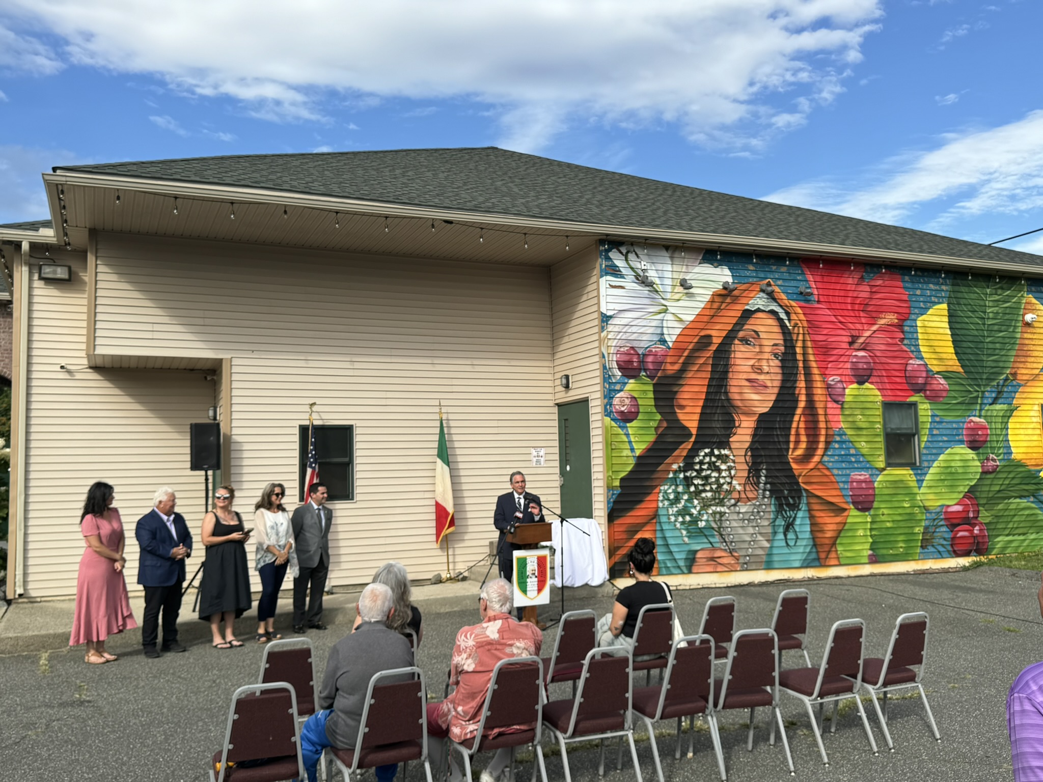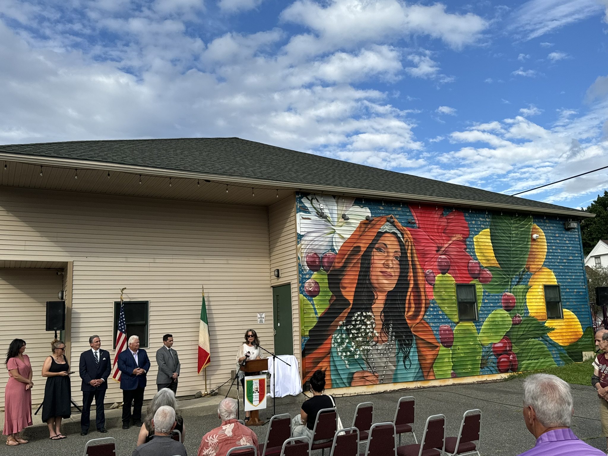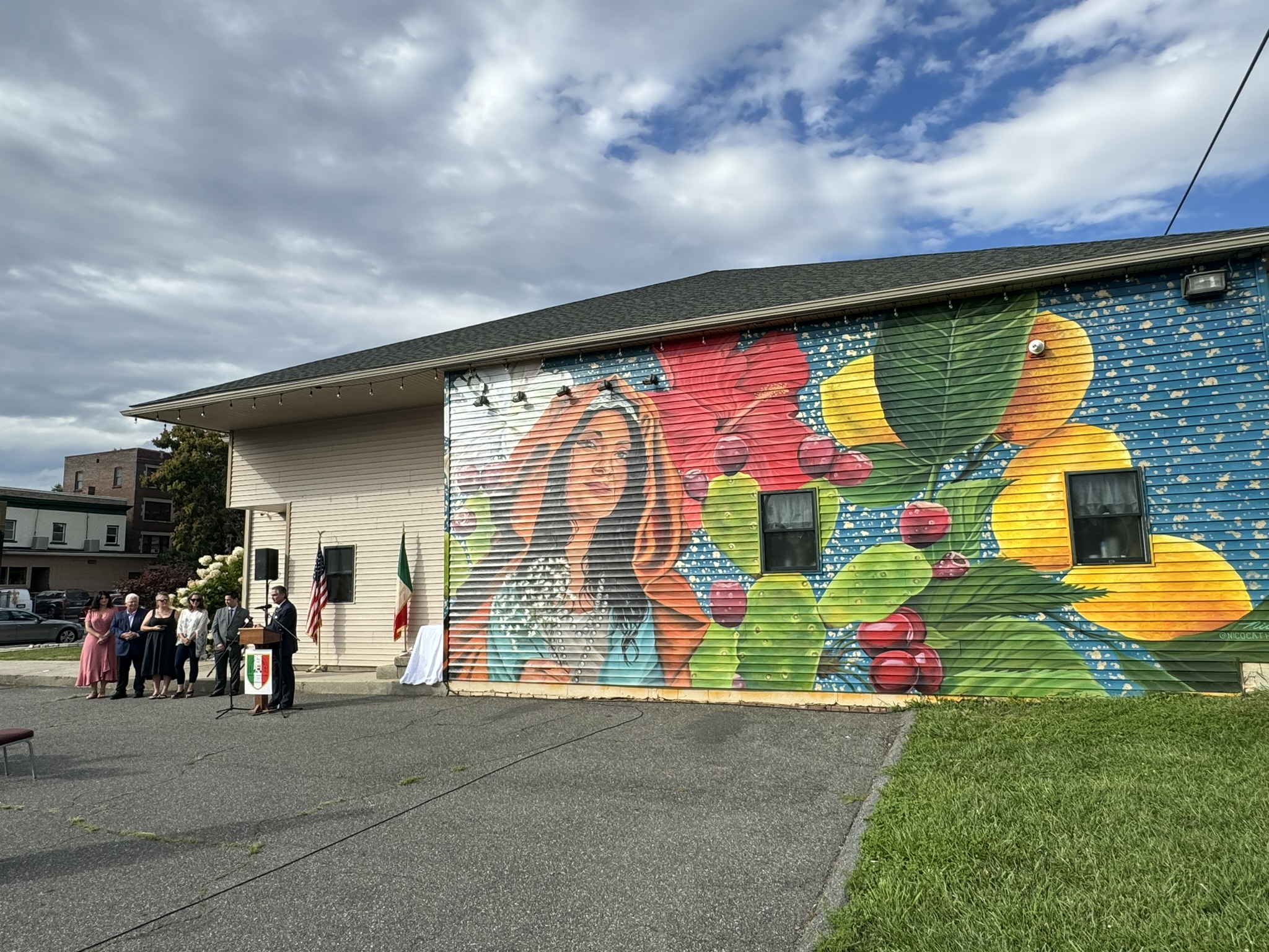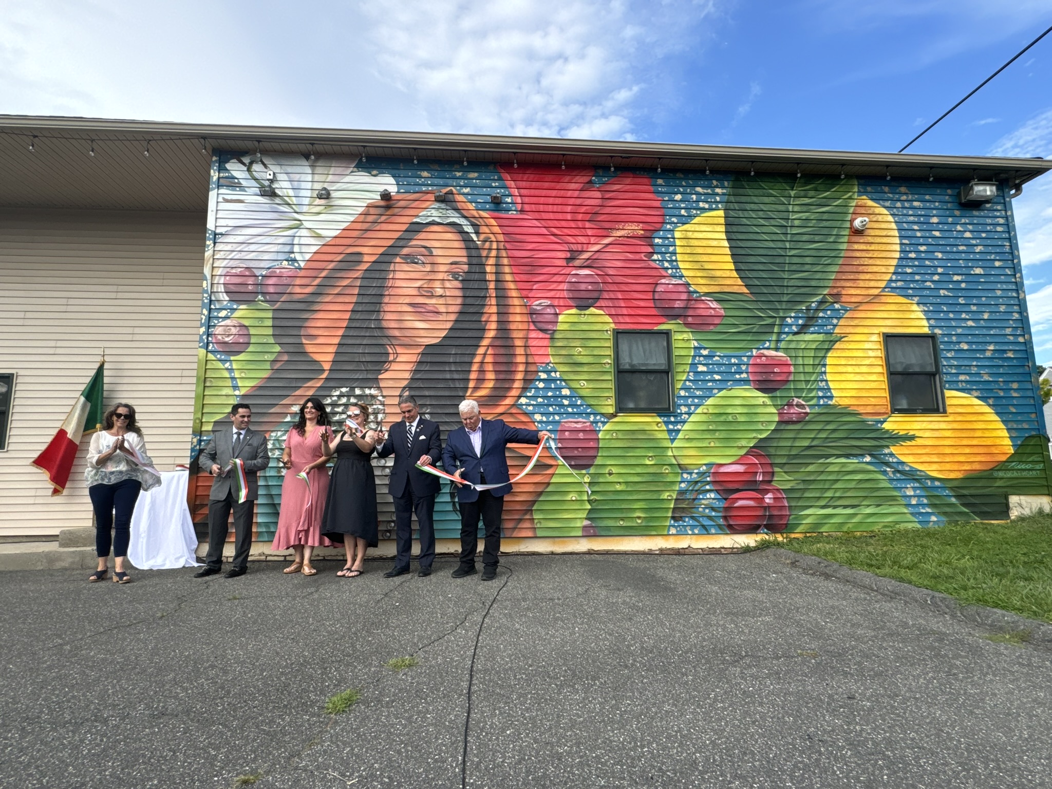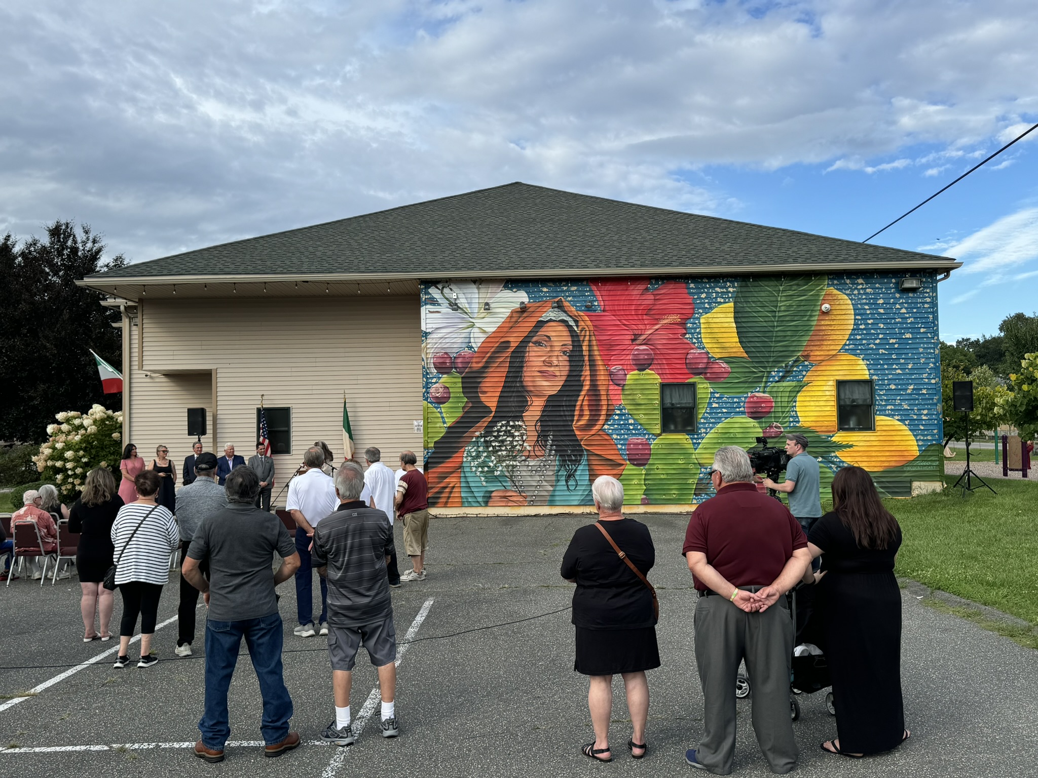 Mayor Domenic J. Sarno and city officials joined with Common Wealth Murals Director Britt Ruhe, Honorary Consul General for the Italian Consulate in Springfield Paul Picknelly, members of the Our Lady of Mt. Carmel Society, members of the Sons and Daughters of Italy led by Salvatore “Sal” Circosta, and the South End Community on Monday for the unveiling and ribbon cutting ceremony of the brand-new mural in the South End. The artist who completed the new mural located at the Mt. Carmel Society, Nico Cathcart, joined and gave remarks. Councilor Brian Santaniello also joined.