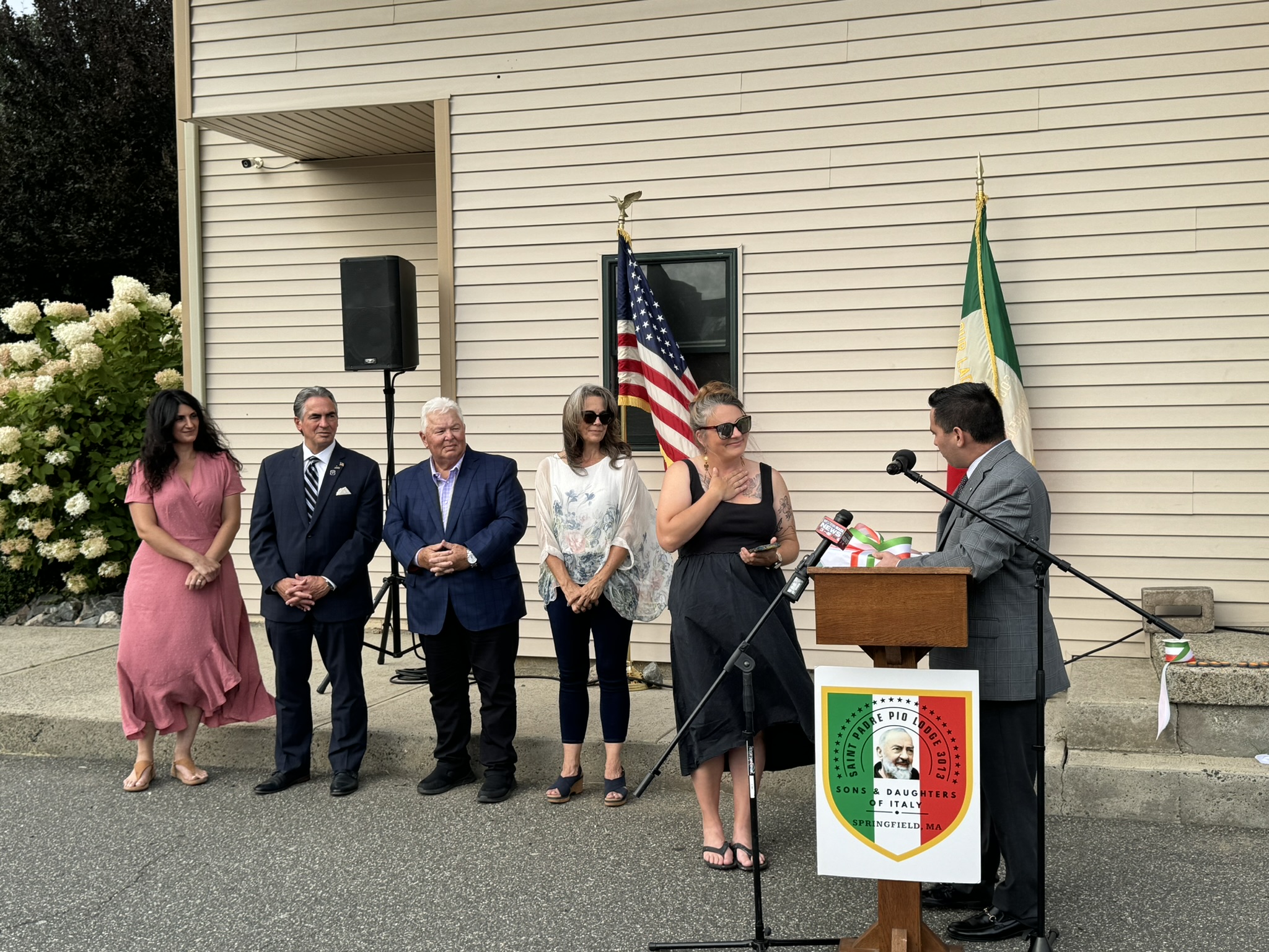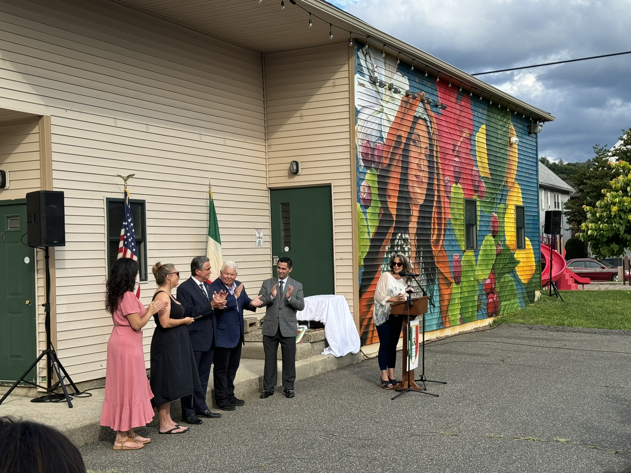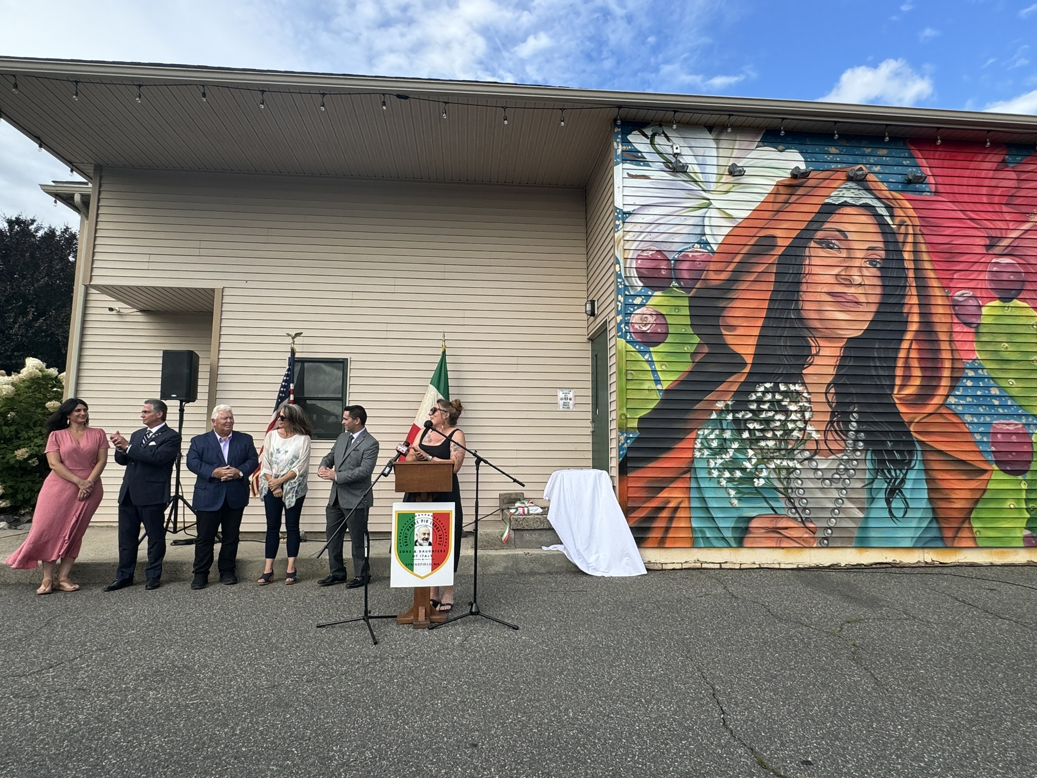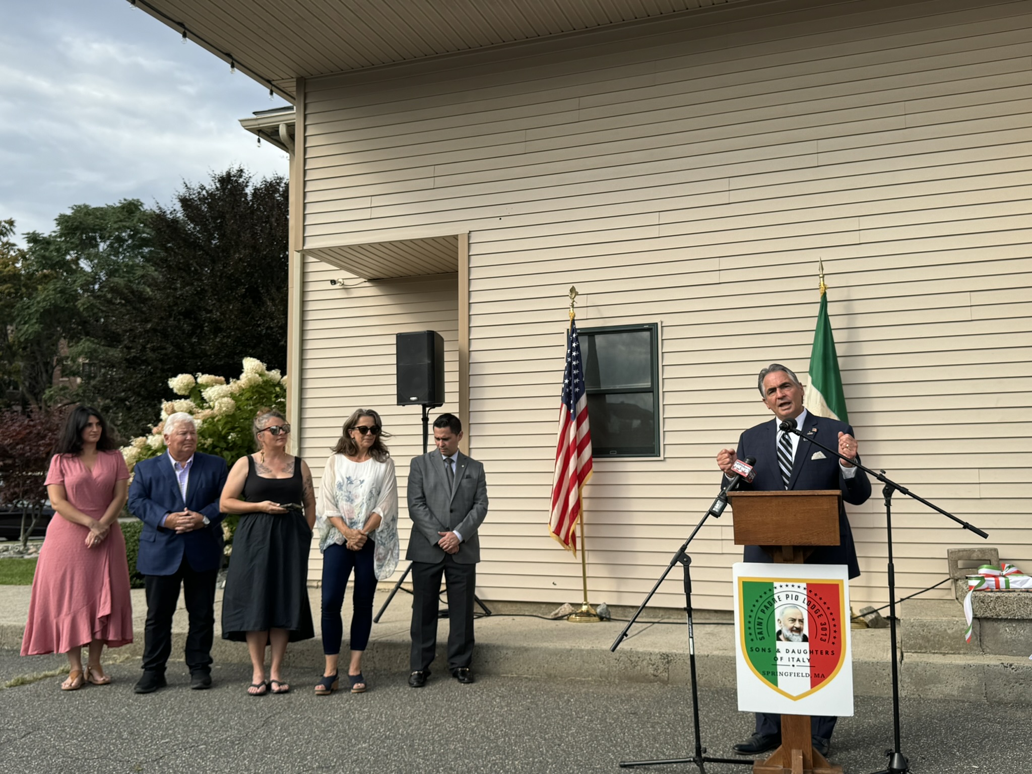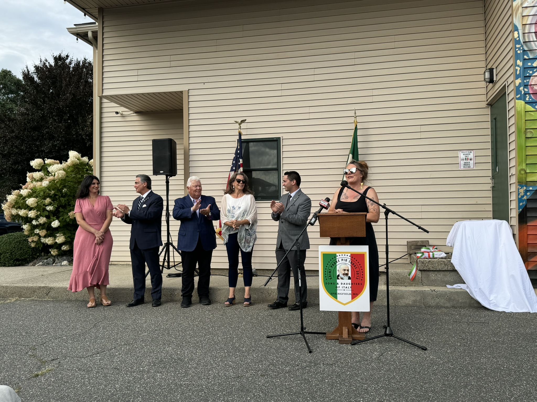Mayor Domenic J. Sarno and city officials joined with Common Wealth Murals Director Britt Ruhe, Honorary Consul General for the Italian Consulate in Springfield Paul Picknelly, members of the Our Lady of Mt. Carmel Society, members of the Sons and Daughters of Italy led by Salvatore “Sal” Circosta, and the South End Community on Monday for the unveiling and ribbon cutting ceremony of the brand-new mural in the South End. The artist who completed the new mural located at the Mt. Carmel Society, Nico Cathcart, joined and gave remarks. Councilor Brian Santaniello also joined.