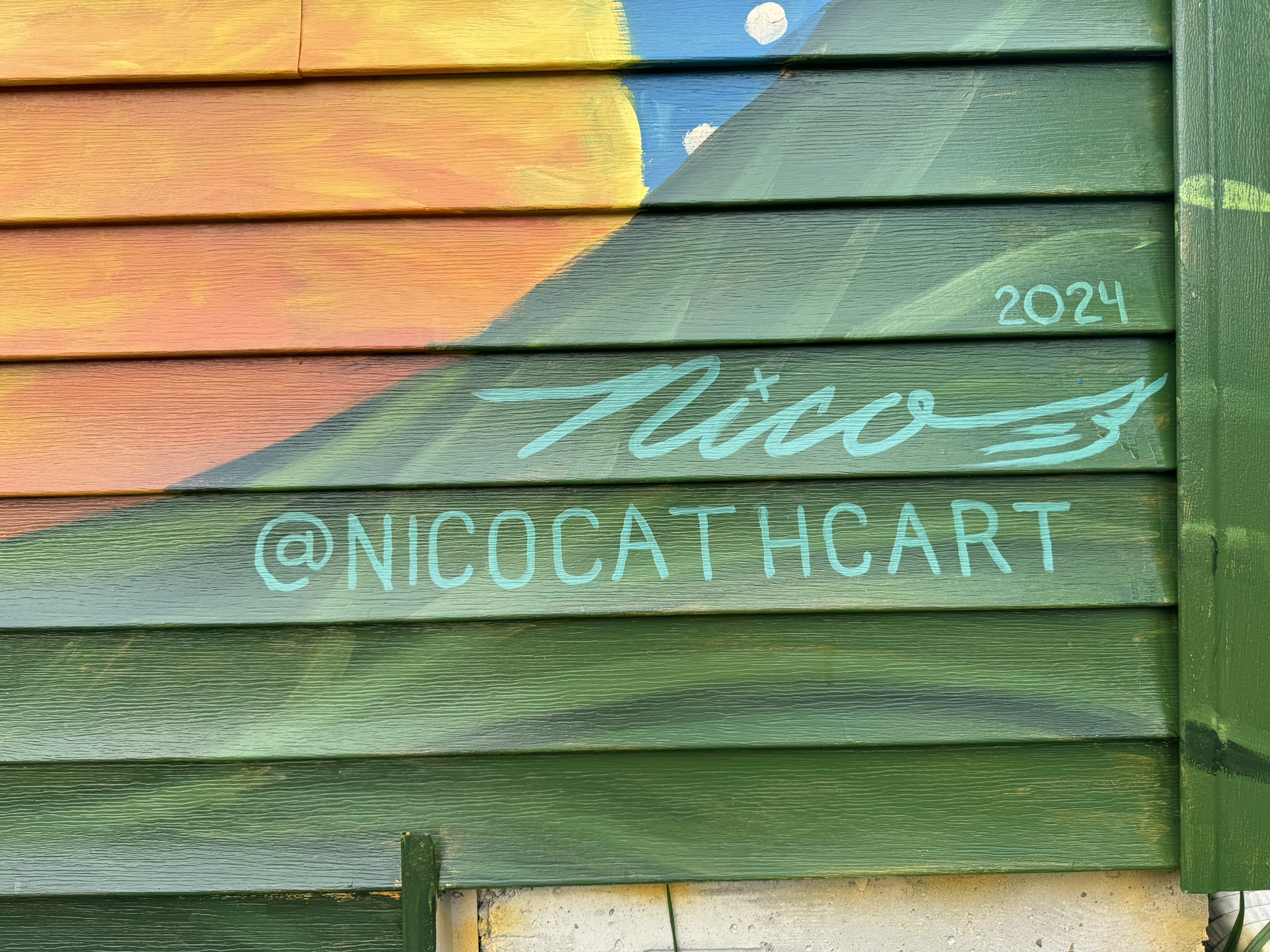 Nico Cathcart was named one of the Top 40 Artists to Watch by Culture Candy and Up Street Art Magazine in 2023, and she was highlighted as one of 50 influential women muralists in the book “Street Art by Women.” Her 2023 mural, “Age and Grace” won a national mural award. She was featured in the emmy-winning documentary Mending Walls, as well as in a TEDTalk about being a Deaf/Hard of Hearing muralist.