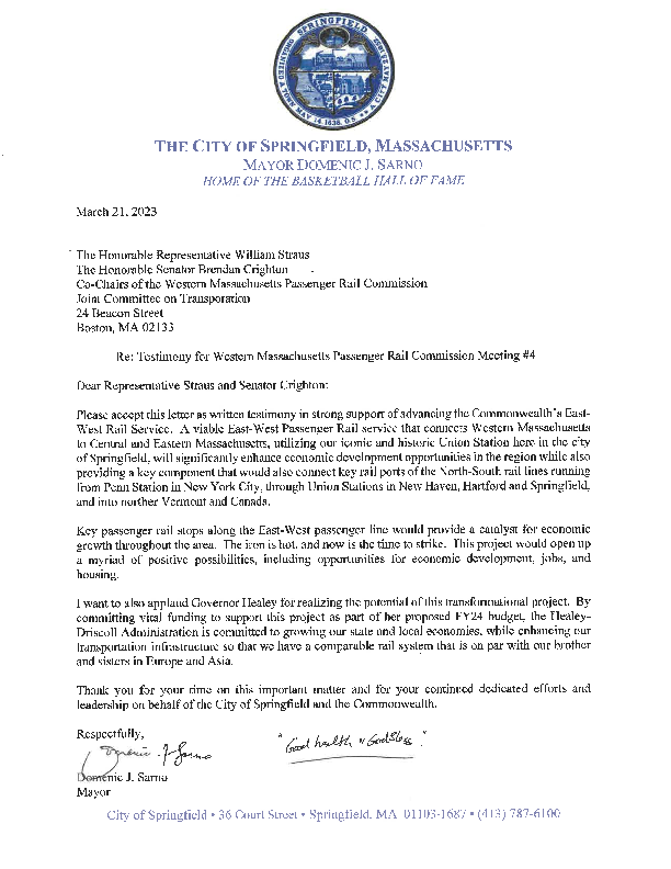 Mayor Sarno stated, “Viable East-West Passenger Rail service that connects Western Massachusetts to Central and Eastern Massachusetts, utilizing our iconic and historic Union Station here in the city of Springfield, will significantly enhance economic development opportunities in the region while also providing a key component that would also connect key rail ports of the North-South rail lines running from Penn Station in New York City, through Union Stations in New Haven, Hartford and Springfield, and into norther Vermont and Canada.”
