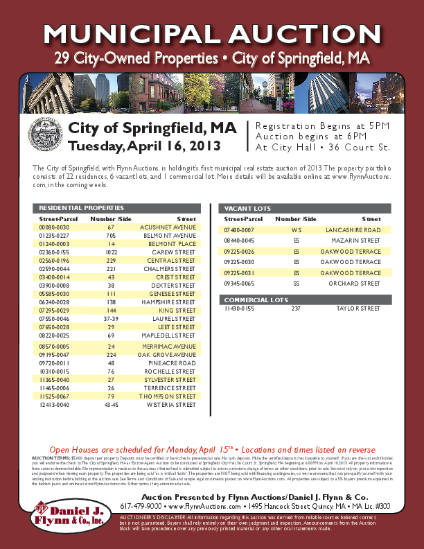 Mayor Sarno stated “The real estate auctions have been a great tool in getting properties occupied and back on the tax rolls. This is another tool that is utilized by the City of Springfield to reduce blight and stabilize neighborhoods. We are looking forward to another successful event and good luck to all the potential bidders.”