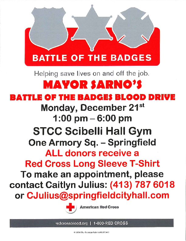 Join our Public Safety Professionals as they continue to help save lives on and off the job. Mayor Sarno's Battle of the Badges Blood Drive takes place n Monday, December 21st from 1:00pm to 6:00pm. The Blood Drive takes place at Springfield Technical College's Scibelli Hall Gymnasium. All donors receive a Red Cross Long Sleeve T-Shirt.