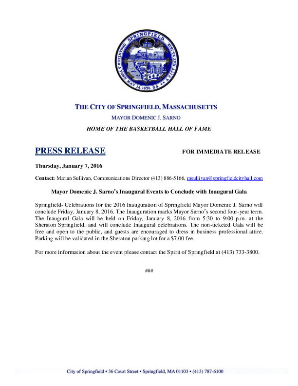 Springfield- Celebrations for the 2016 Inauguration of Springfield Mayor Domenic J. Sarno will conclude Friday, January 8, 2016. The Inauguration marks Mayor Sarno’s second four-year term. The Inaugural Gala will be held on Friday, January 8, 2016 from 5:30 to 9:00 p.m. at the Sheraton Springfield, and will conclude Inaugural celebrations. The non-ticketed Gala will be free and open to the public, and guests are encouraged to dress in business professional attire. Parking will be validated in the Sheraton parking lot for a $7.00 fee.