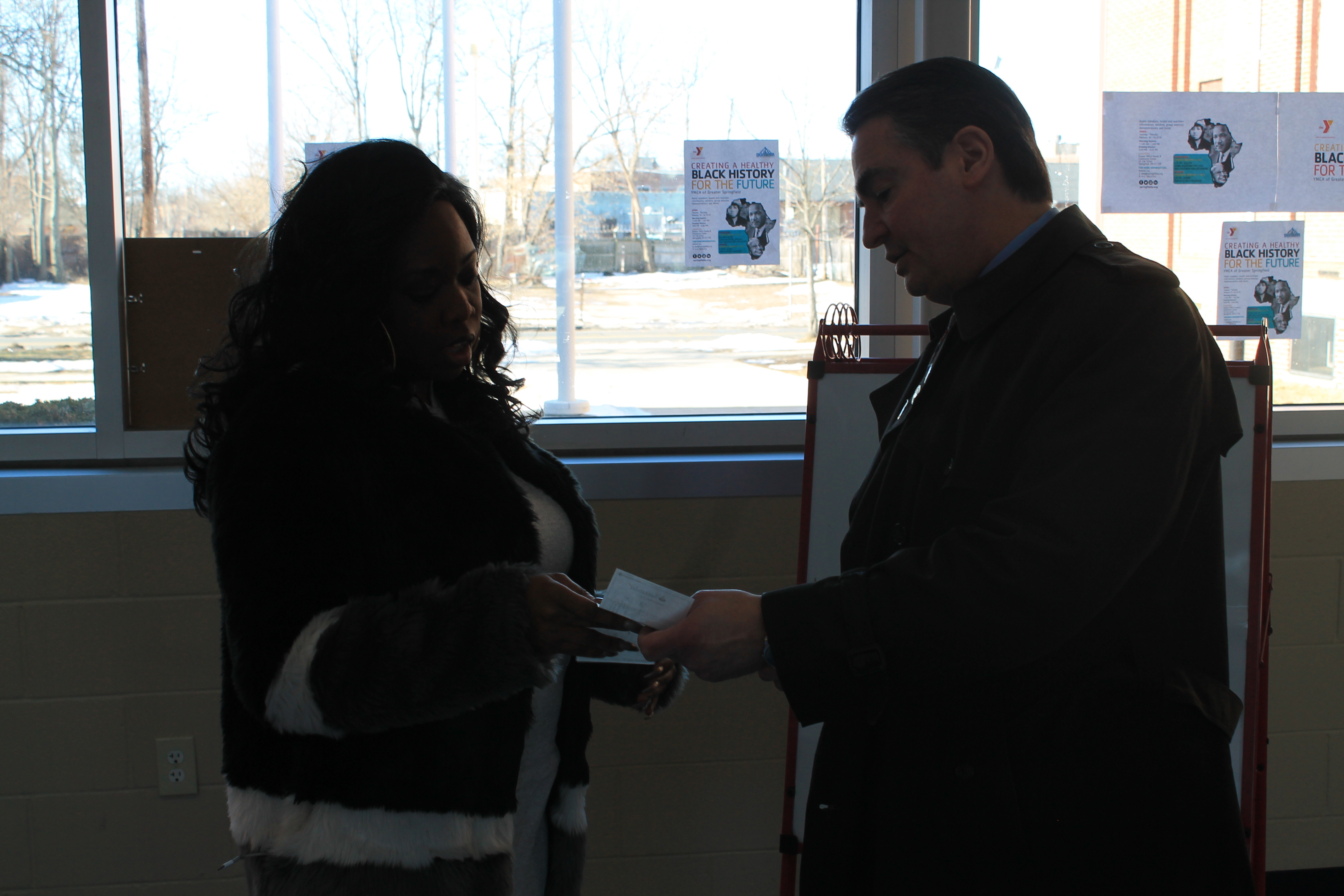 Mayor Sarno thanks Springfield resident Crystal Copeland for her generosity in helping those affected by the ongoing water crisis in Flint, MI, and also made a check donation to assist her efforts. Part of Crystal's family resides in Flint, and after learning about the severity of the situation, began collecting bottled water for a donation. She has since partnered with the Dunbar Y Family & Community Center and nearly has enough to pack a U-Haul, which she will personally drive to Flint on March 8. The water will be distributed through the New Jerusalem Full Baptist Church, where her uncle is a deacon.
