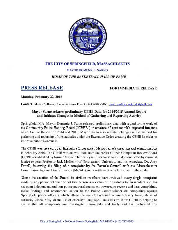 Springfield, MA- Mayor Domenic J. Sarno released preliminary data with regard to the work of the Community Police Hearing Board (“CPHB”) in advance of next month’s expected issuance of an Annual Report for 2014 and 2015. Mayor Sarno also initiated changes in the method for gathering and reporting of the statistics under the Executive Order creating the CPHB in order to improve public awareness