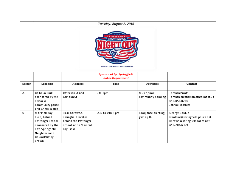 Please see the attached list of National Night Out events, sponsored by the Springfield Police Department.