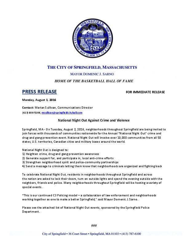 On Tuesday, August 2, 2016, neighborhoods throughout Springfield are being invited to join forces with thousands of communities nationwide for the Annual “National Night Out” crime and drug and gang prevention event. National Night Out will involve over 10,000 communities from all 50 states, U.S. territories, Canadian cities and military bases around the world.