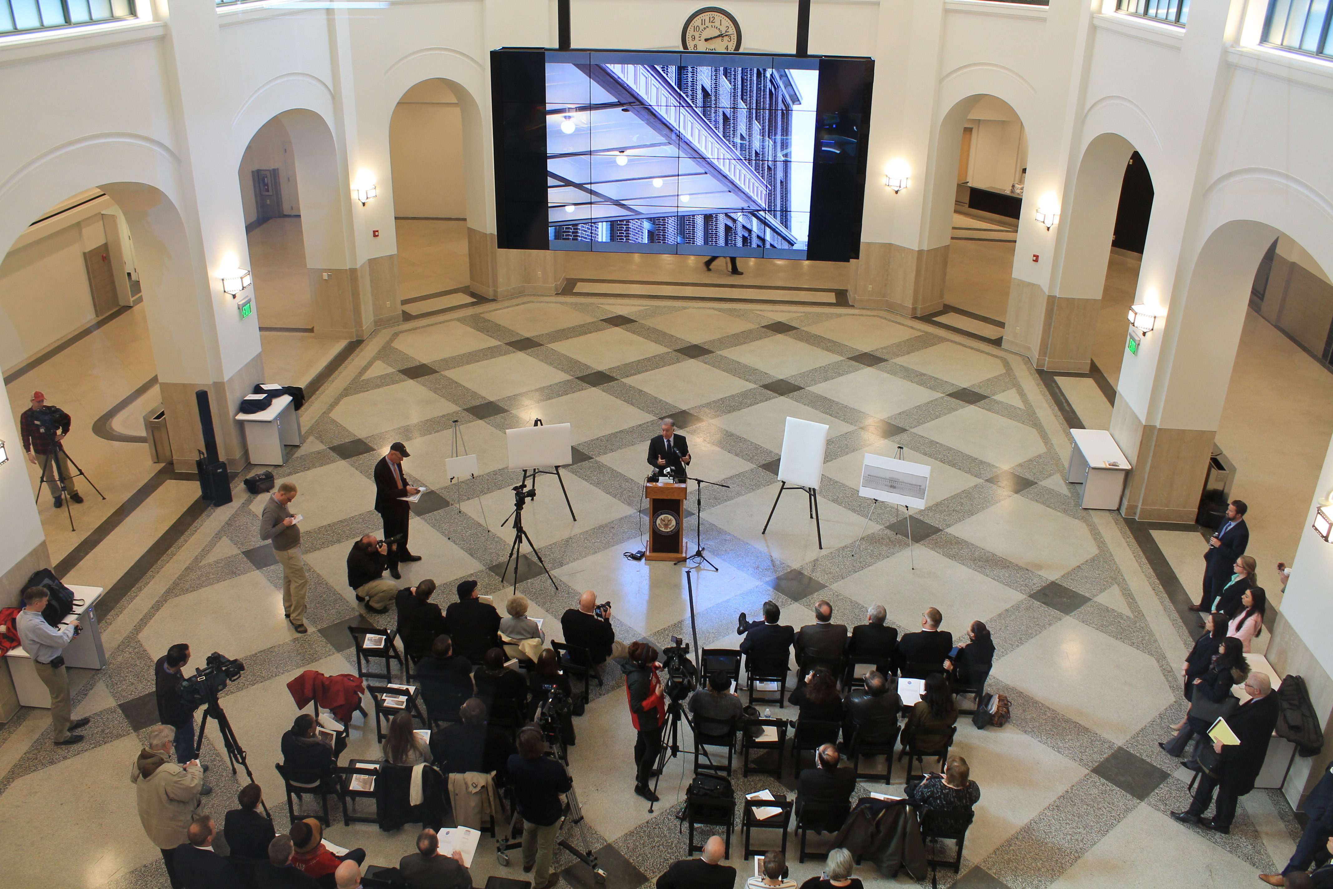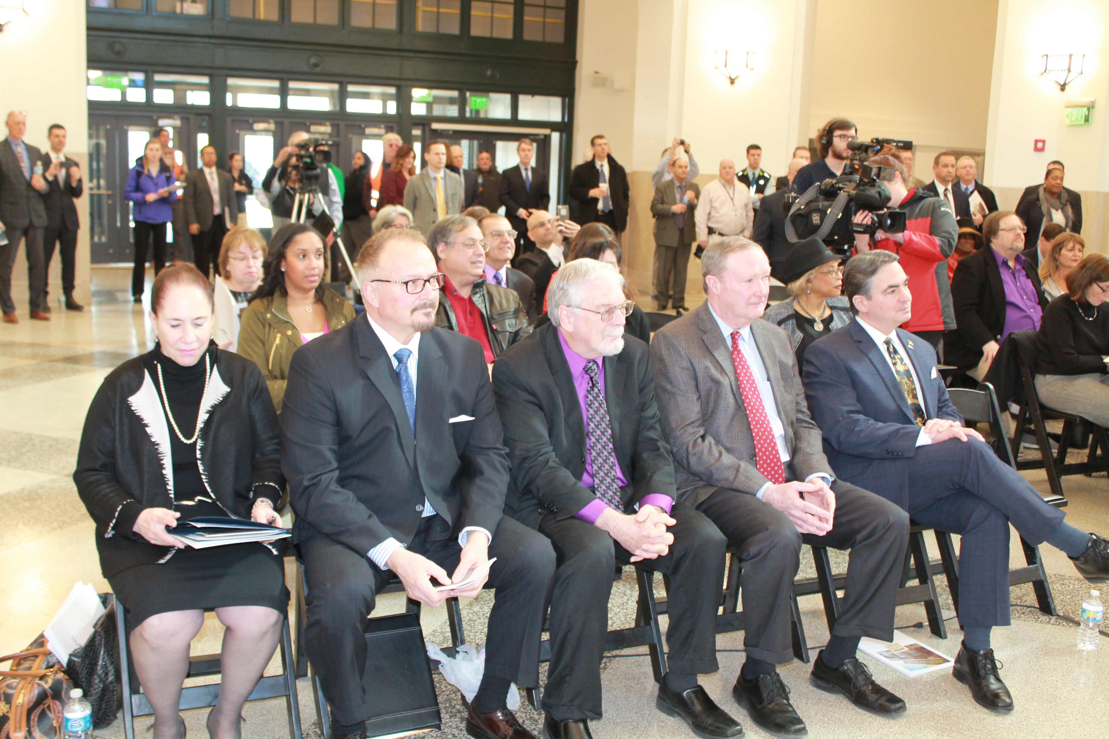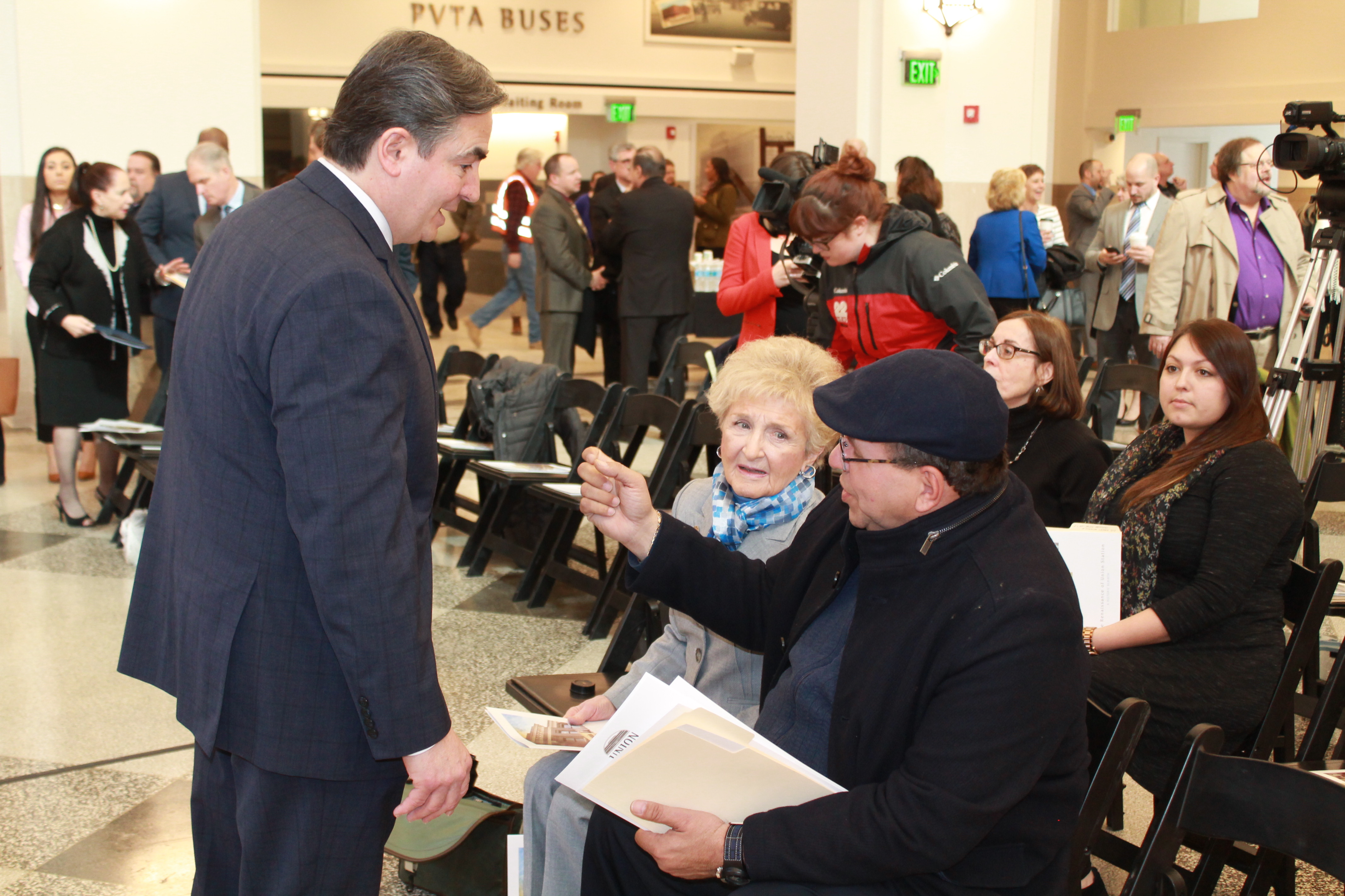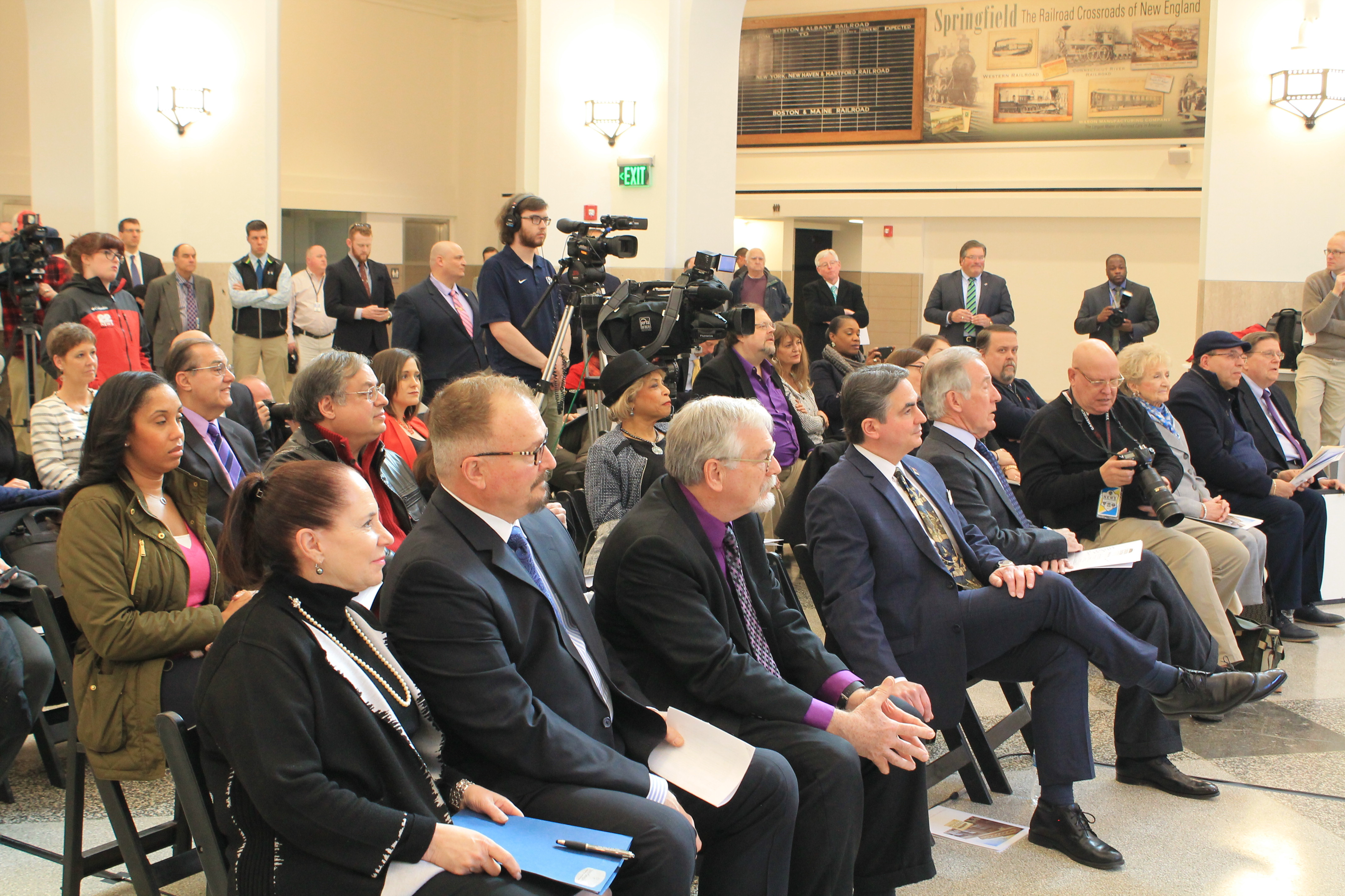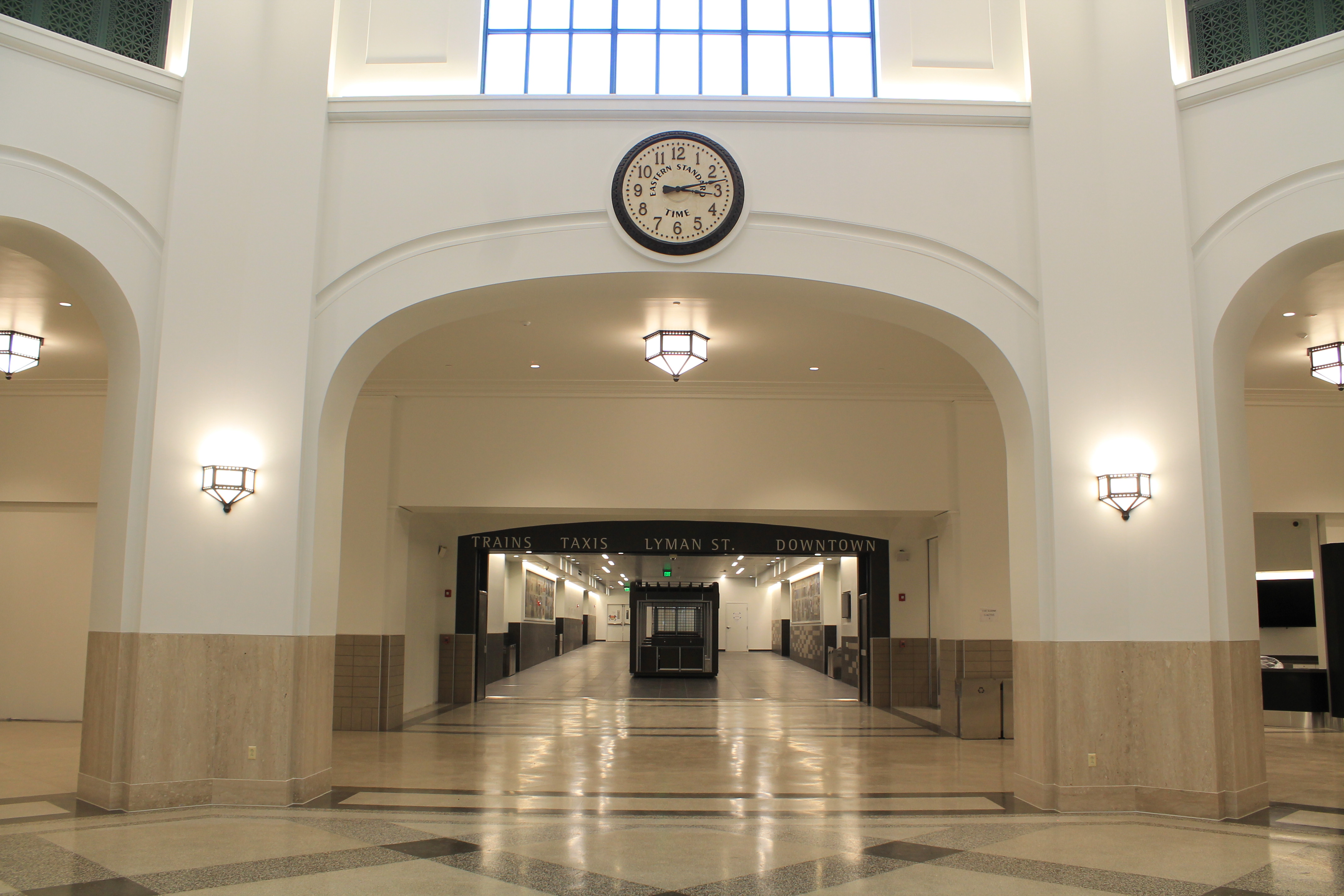 After closing its doors in the 1970’s, the participating members of the news media were the first to see the rebirth and transformation of a structure that has played a significant role in the history of Springfield. In the Grand Concourse alone, the original Eastern Standard Clock has been refurbished, the distinctive Terrazzo floors have been restored, period lighting recreated, an authentic baggage cart has been returned and a series of eight dramatic murals by local artist Ed Pessolano that chronicle Springfield’s rich history along with the importance of rail in the region have been hung throughout the terminal.