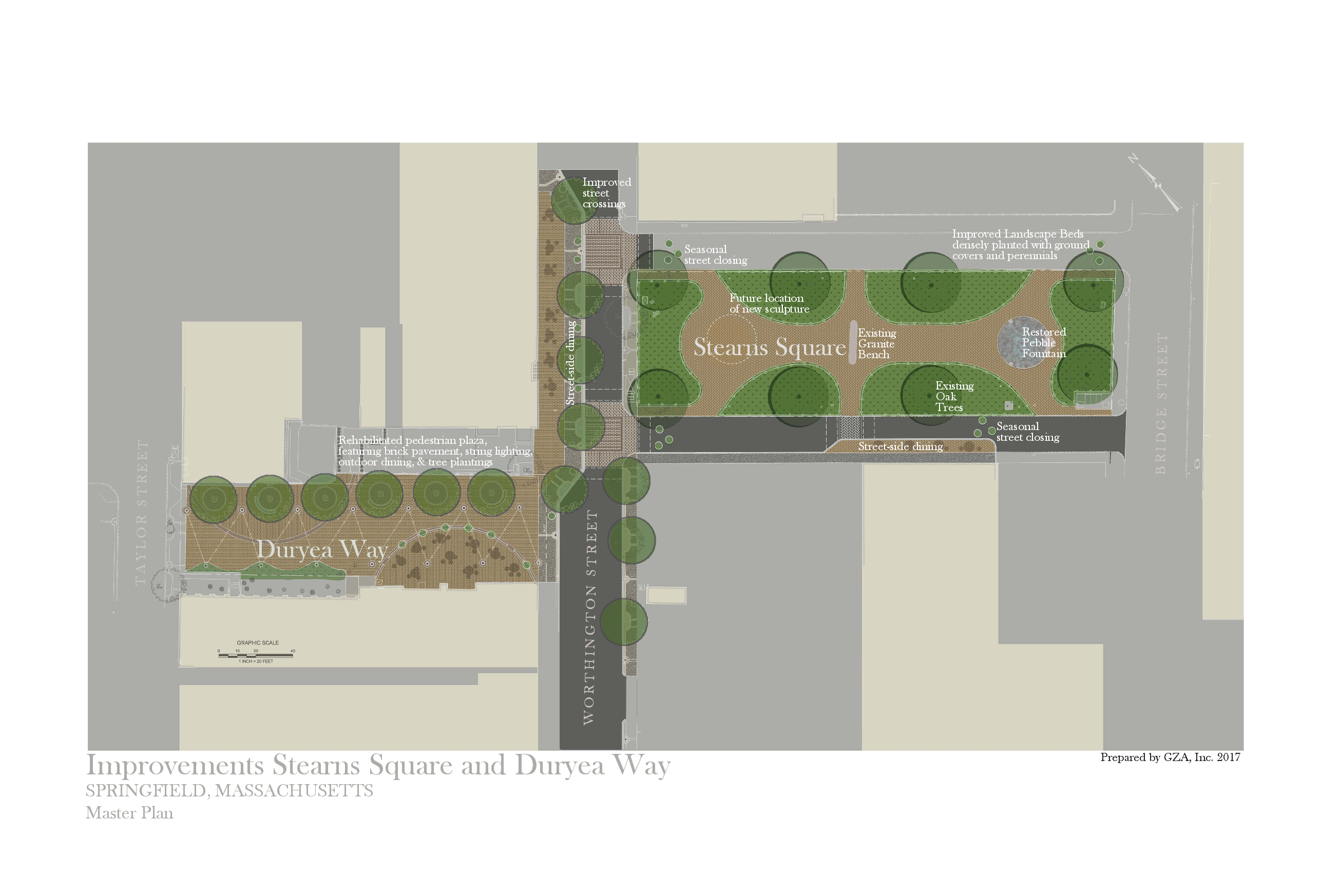 Mayor Sarno stated, “The renovation of Stearns Square and Duryea Way is an integral part of the renaissance of our downtown. The proposed improvements along with significant investments at Union Station and MGM Springfield will market our downtown as a destination to residents and visitors from throughout the Pioneer Valley.”