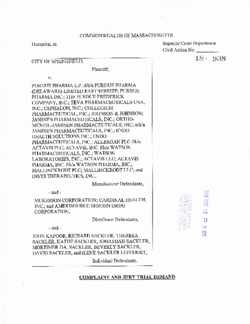 The civil complaint was filed in Hampden Superior Court on December 18, 2018. A copy of the complaint is attached to this release. The complaint alleges that Springfield, along with many other communities, is currently experiencing a stark increase in the number of residents who have become addicted to prescription opioids and heroin that has caused an increase in opioid overdoses. The complaint references a report that prescription opioids are now known to be the “gateway” drug to heroin; approximately 80% of current heroin users got their start with prescription opioids. According to the complaint, unlike any other epidemic, the opioid epidemic is not natural, nor typical, but largely man-made. It has been created, fueled, and continues to expand by the persistent unlawful conduct of the defendant pharmaceutical manufacturers and pharmaceutical wholesale distributors.
