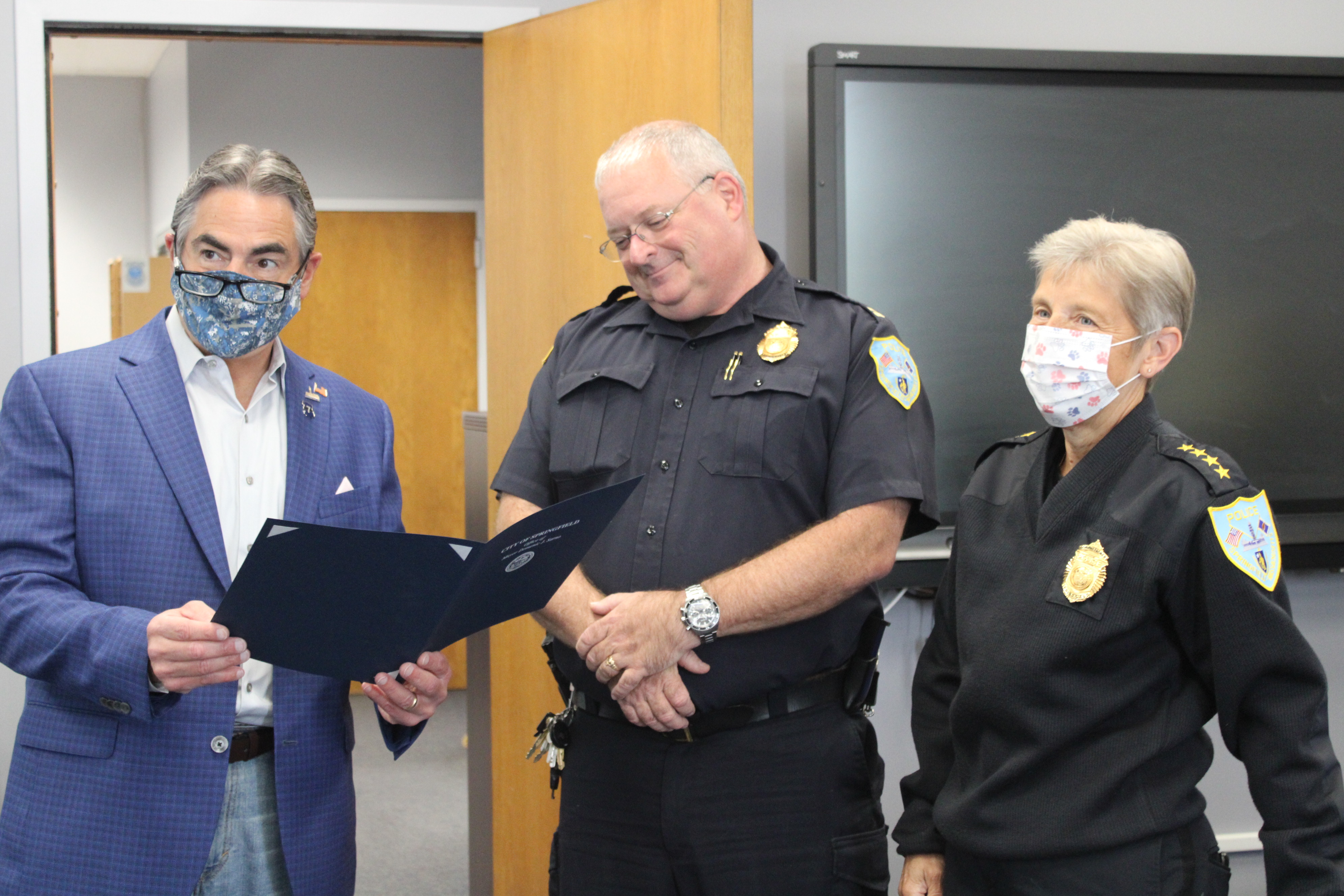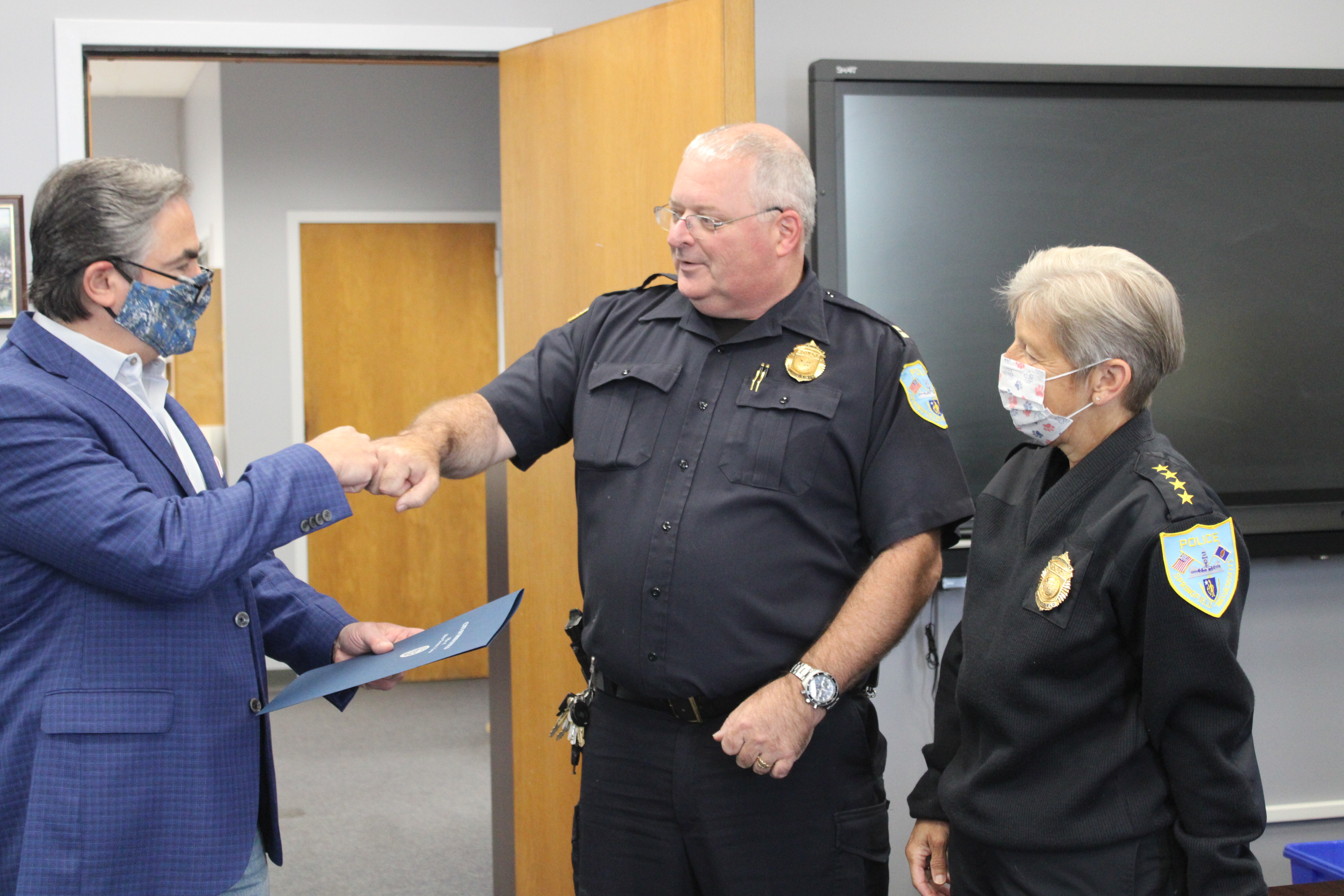 Mayor Domenic J. Sarno joined with Commissioner Clapprood today to recognize and thank Captain Phil Tarpey for his years of brave and dedicated service to the City of Springfield and wish him a very happy and healthy retirement.