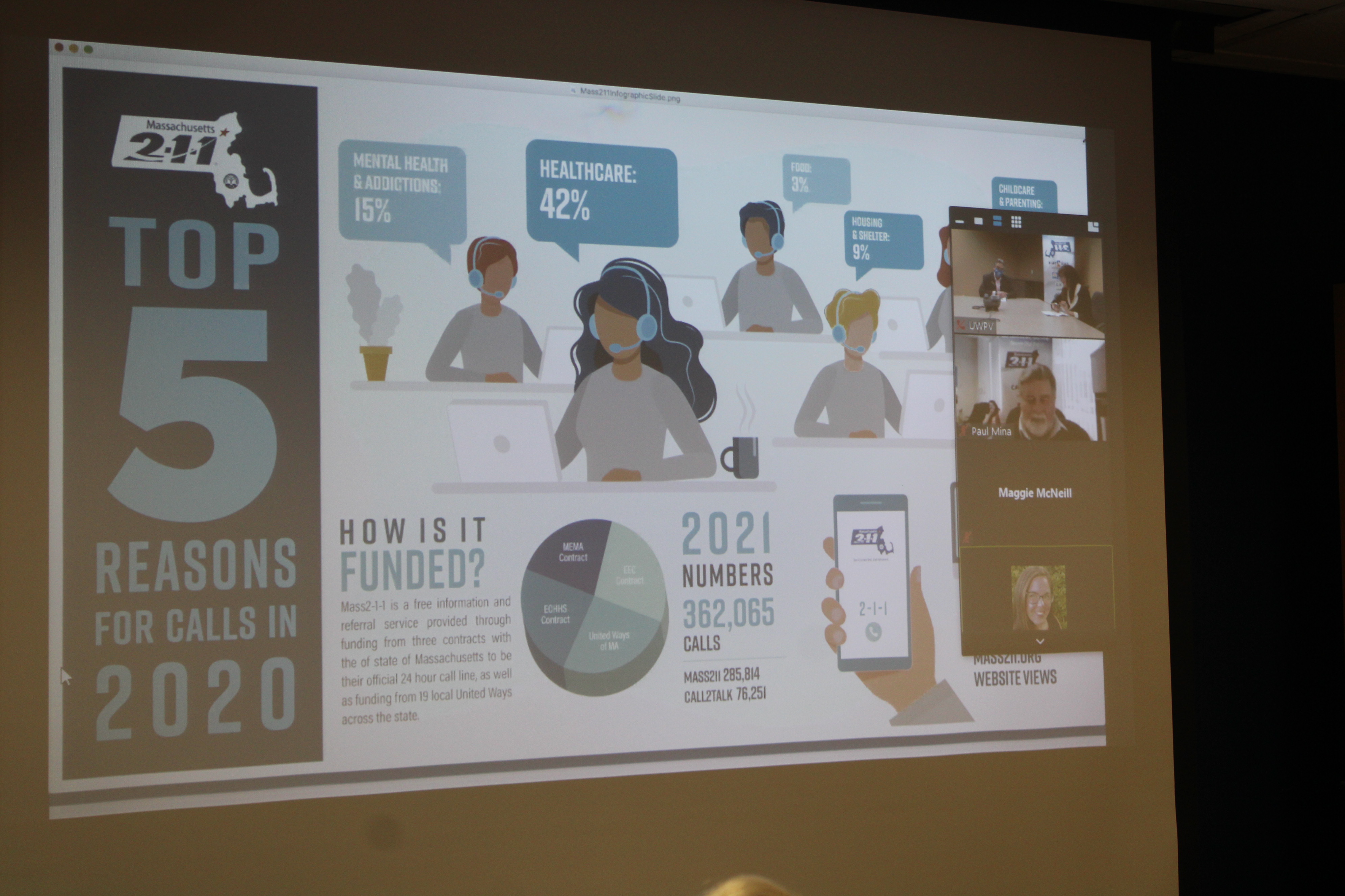 The Mass211 Call2Talk Springfield satellite office is located at the United Way of Pioneer Valley (UWPV) at 1441 Main Street, Springfield, MA 01103. The office will be staffed by students in the Springfield College master’s degree program.