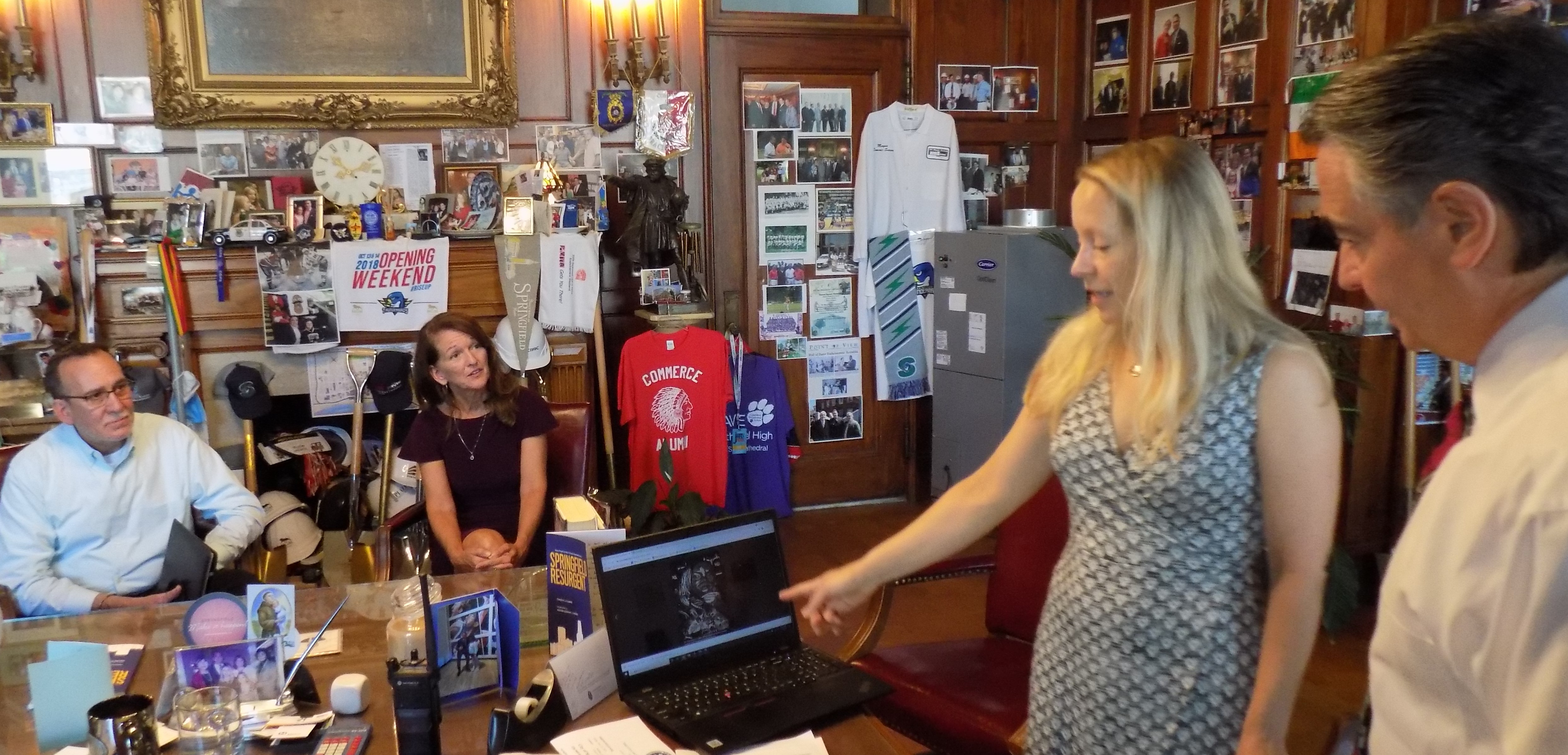 Mayor Domenic J. Sarno met with the Springfield Cultural Partnership to discuss the administrations continued initiatives to benefit the arts that contribute economic vitality and cultural enrichment to our community. Attending the meeting were Executive Director of the Springfield Cultural Partnership Karen Finn, Chair of the Board for the Cultural Partnership and Executive Director of the Community Music School Eileen McCaffery, and Board Member for the Cultural Partnership and Principal Planner for the City of Springfield Scott Hanson.
