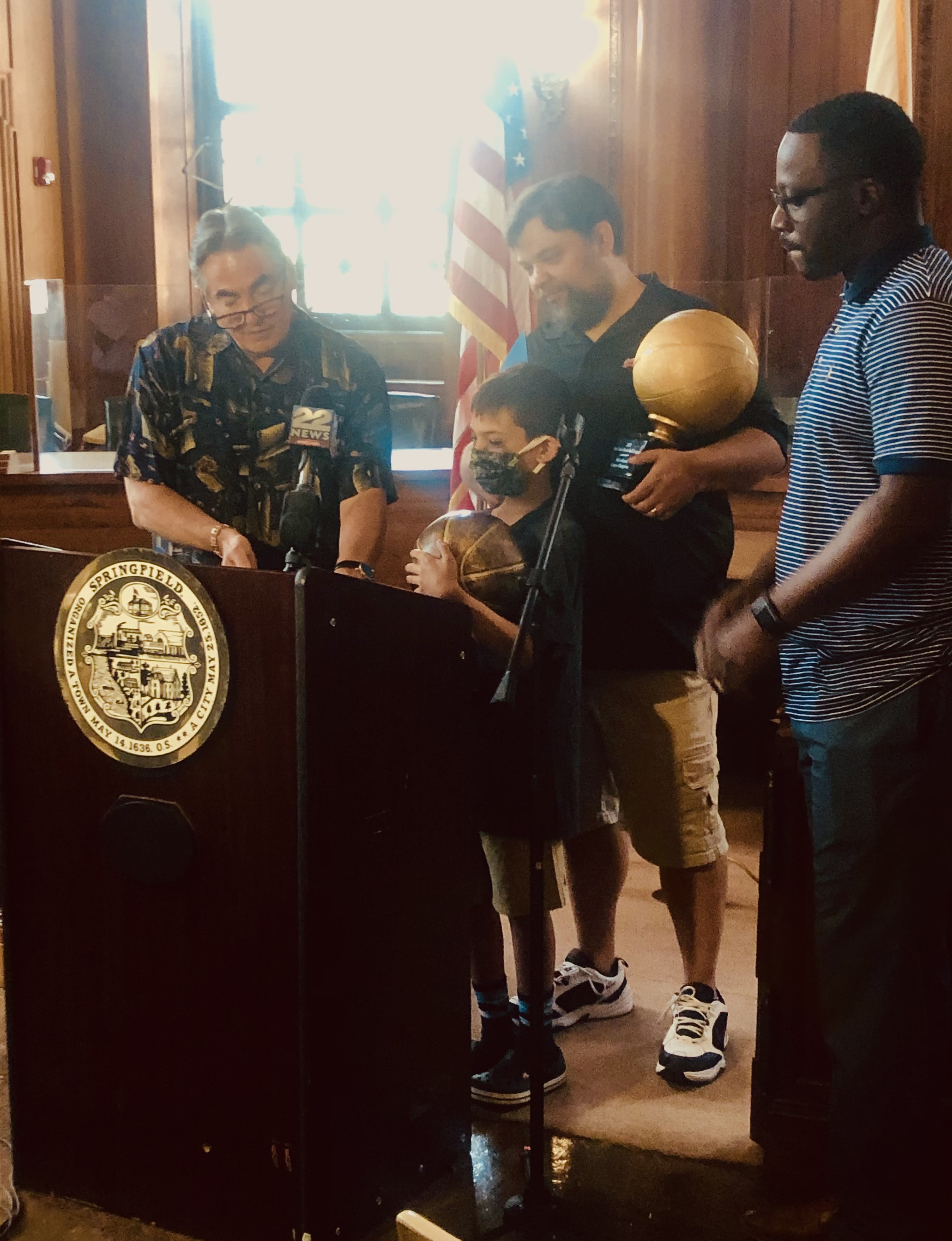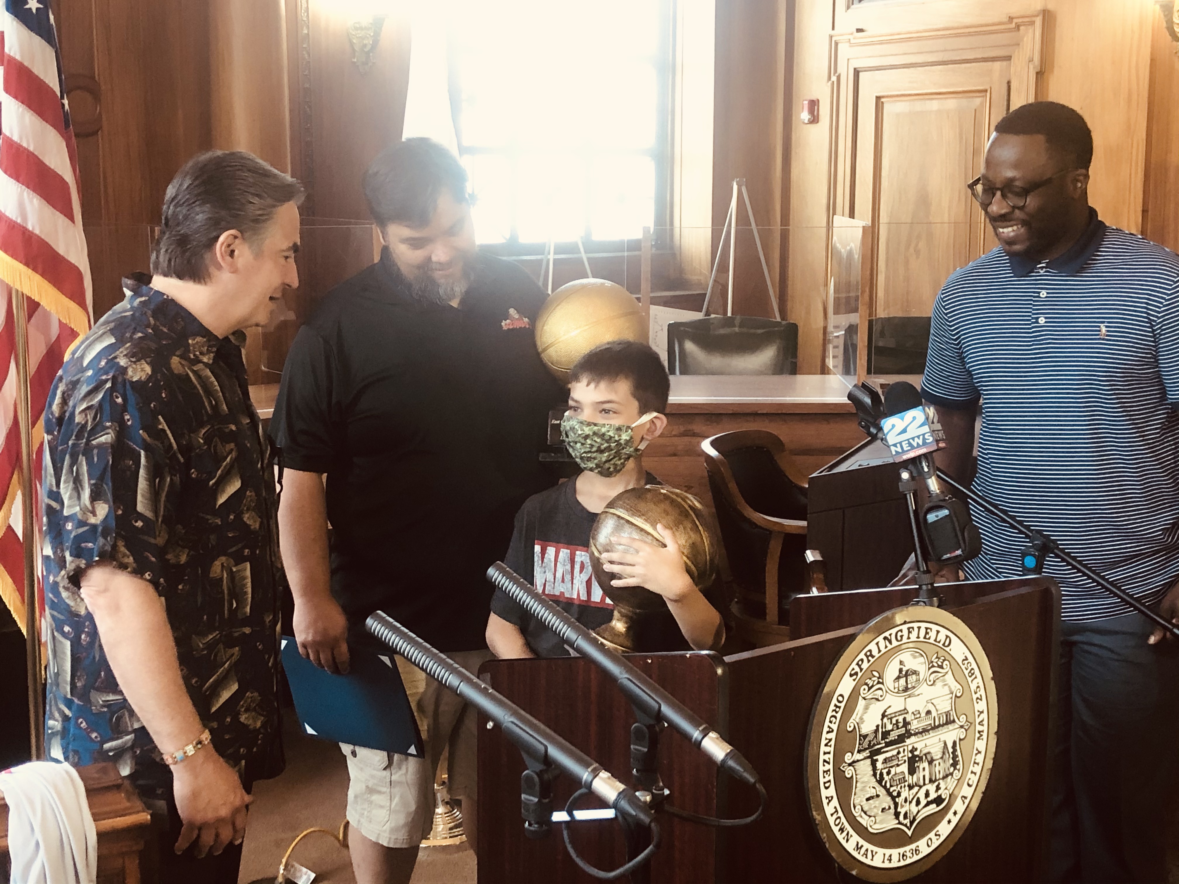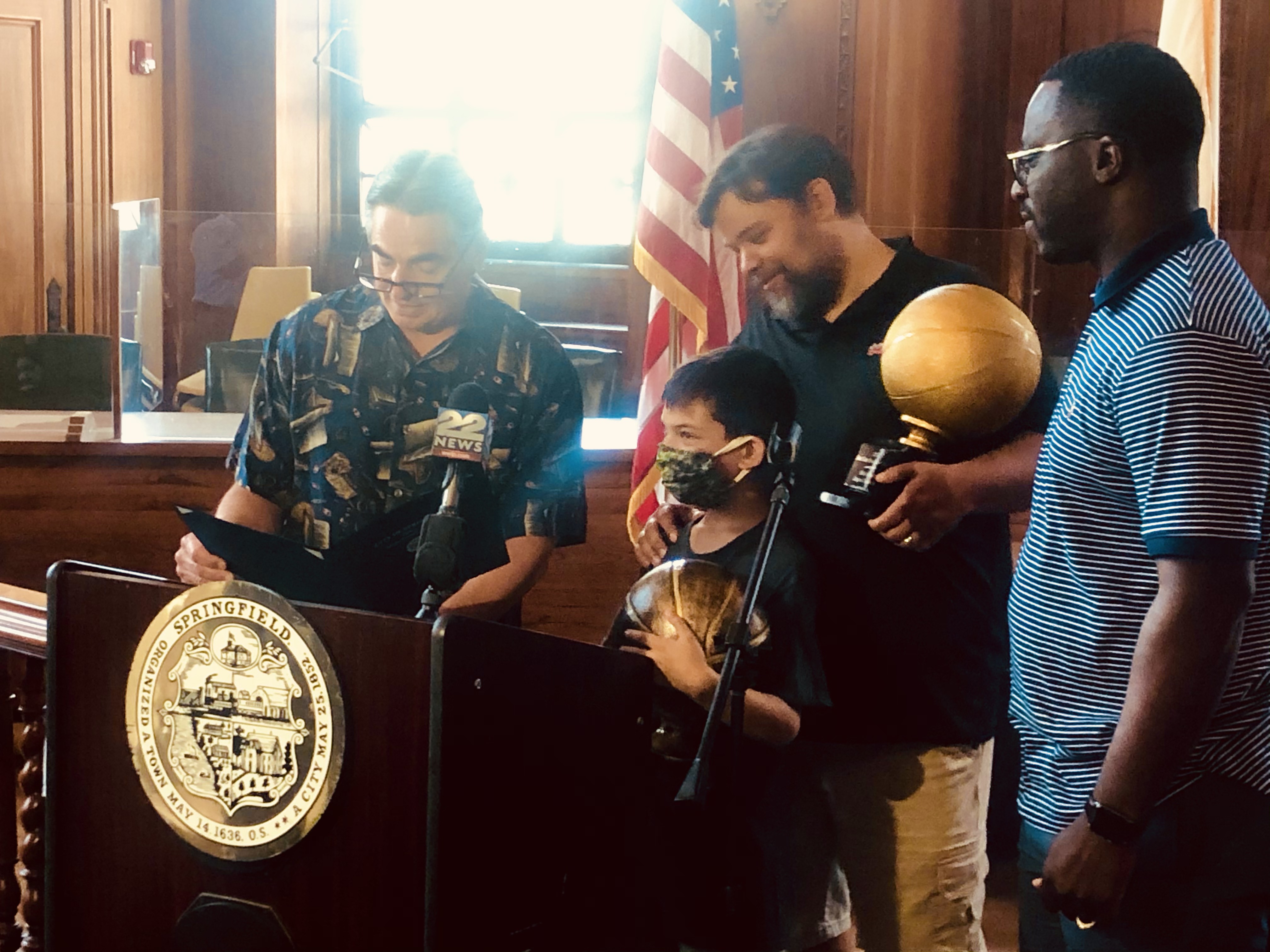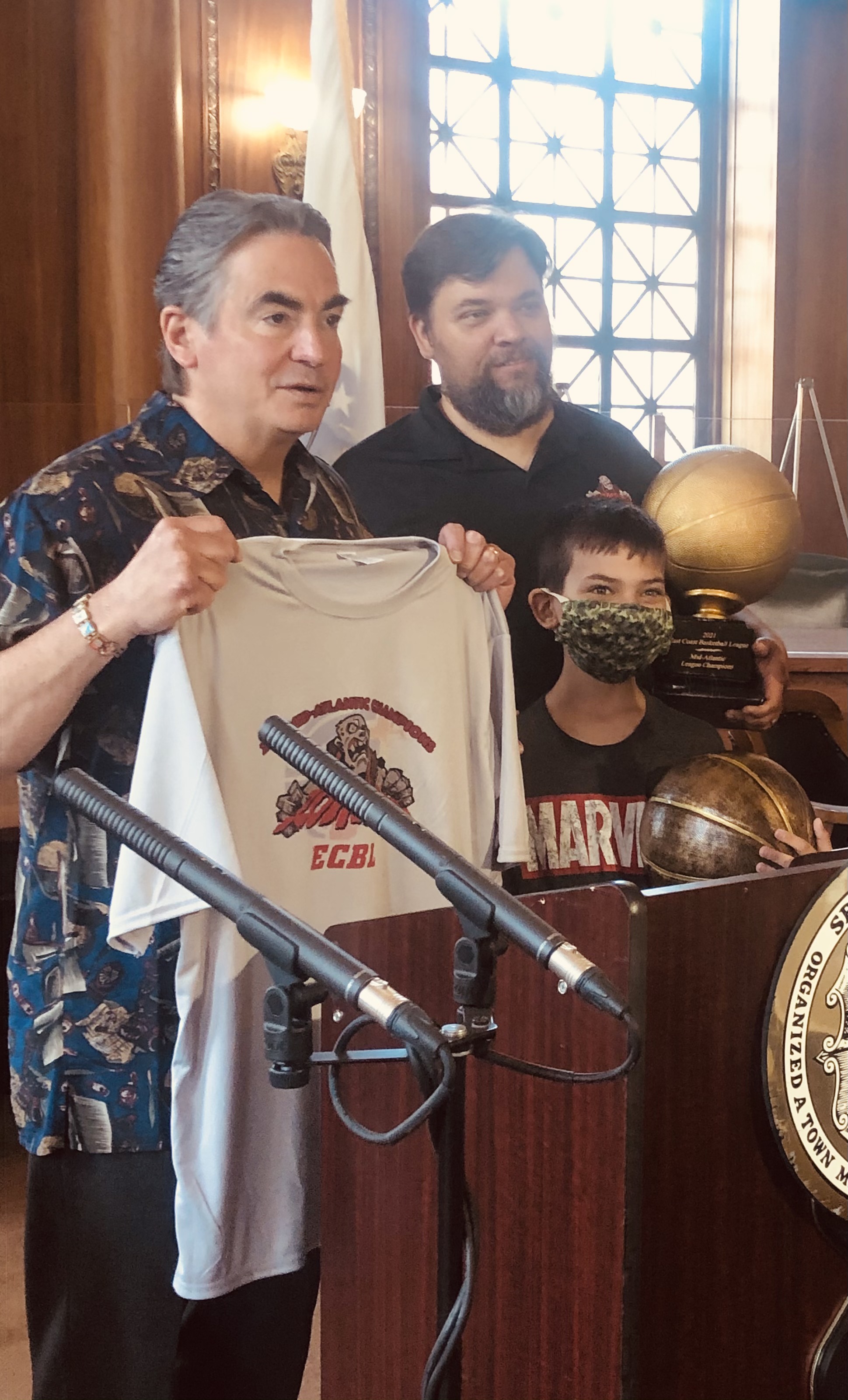 Mayor Domenic J. Sarno and Mayoral Aide Lavar “Coach” Click joined today with Bill Bullock, owner of Western Mass Zombies Basketball team, and his son Nicholas, as well as South End Community Center Executive Director Wesley Jackson to congratulate the Zombies players and coaches on winning their first ever East Coast Basketball League (ECBL) Mid-Atlantic Basketball Title.