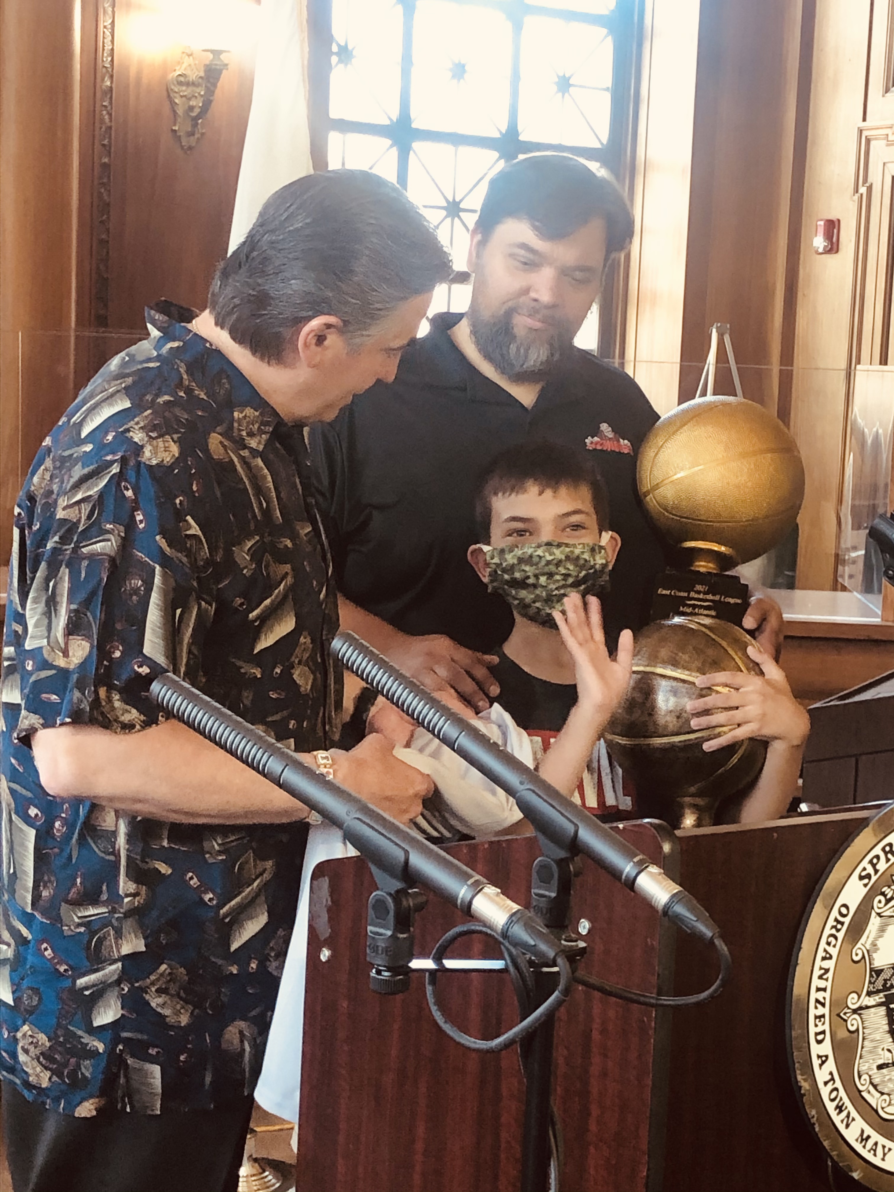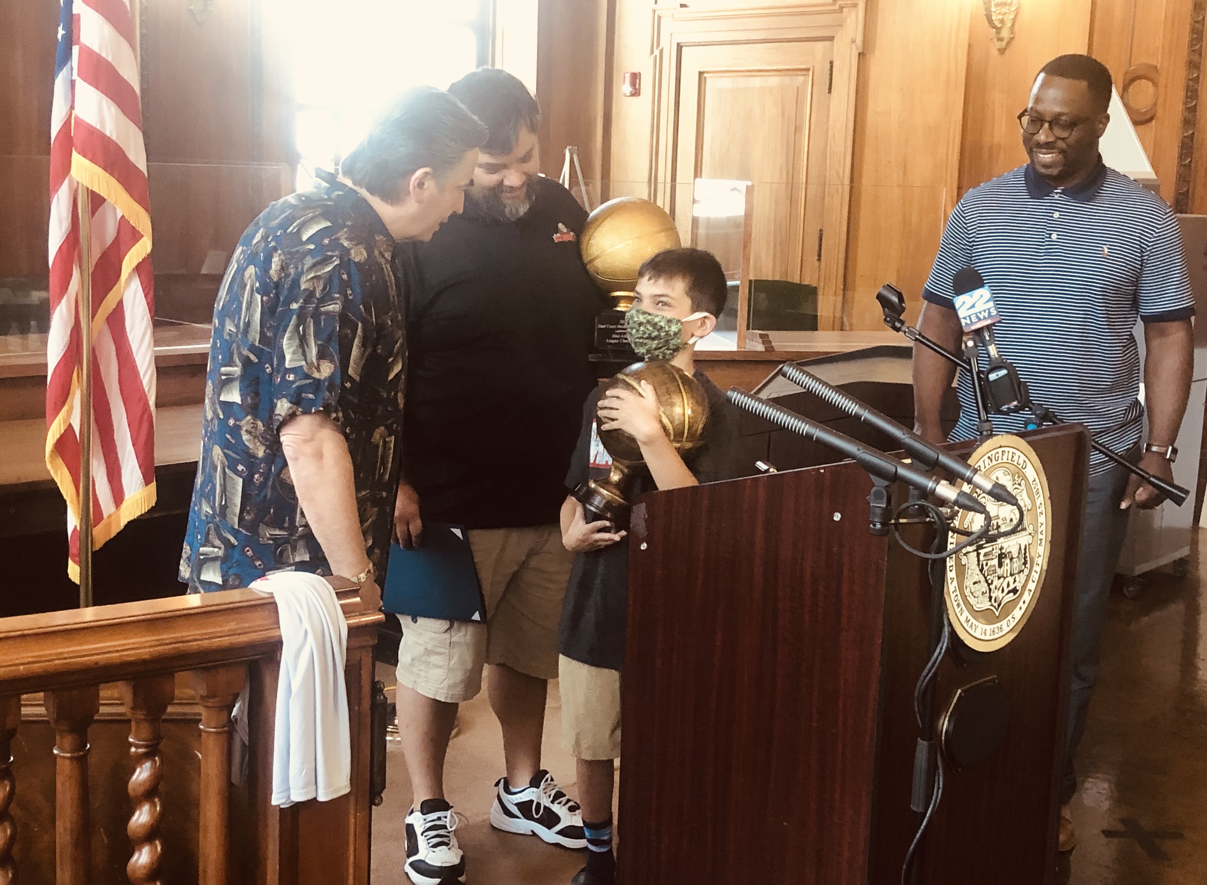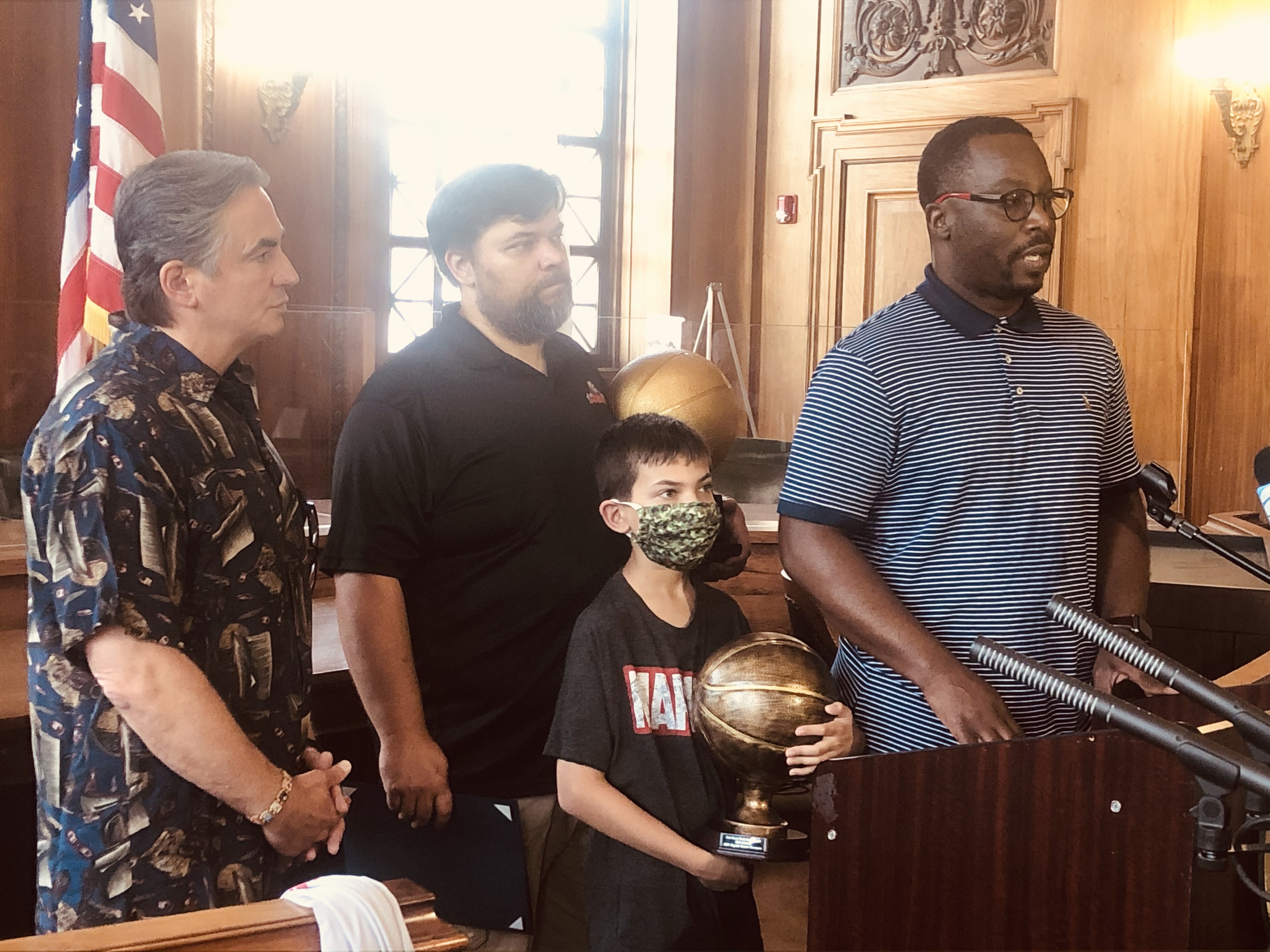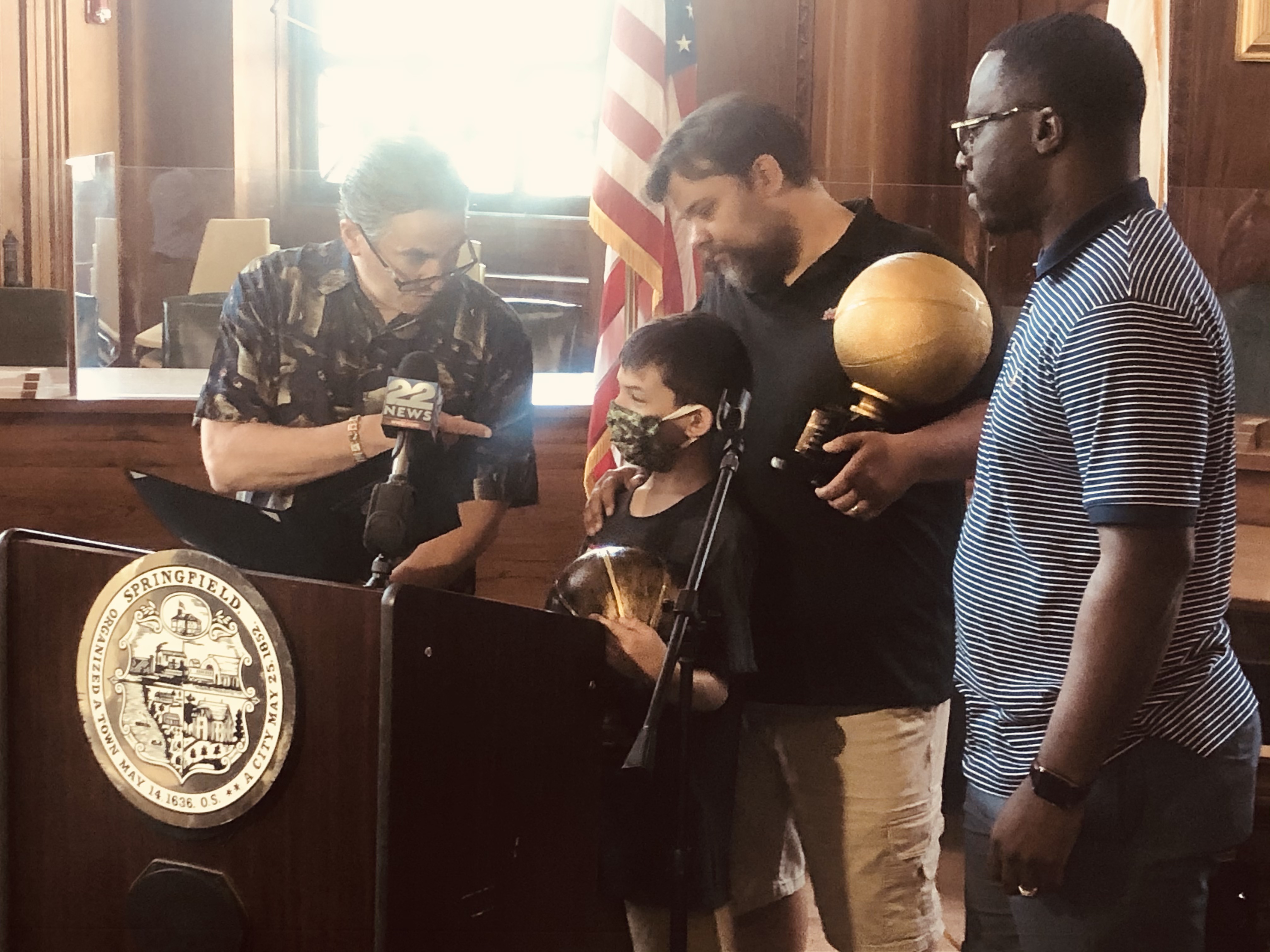 Mayor Domenic J. Sarno and Mayoral Aide Lavar “Coach” Click joined today with Bill Bullock, owner of Western Mass Zombies Basketball team, and his son Nicholas, as well as South End Community Center Executive Director Wesley Jackson to congratulate the Zombies players and coaches on winning their first ever East Coast Basketball League (ECBL) Mid-Atlantic Basketball Title.