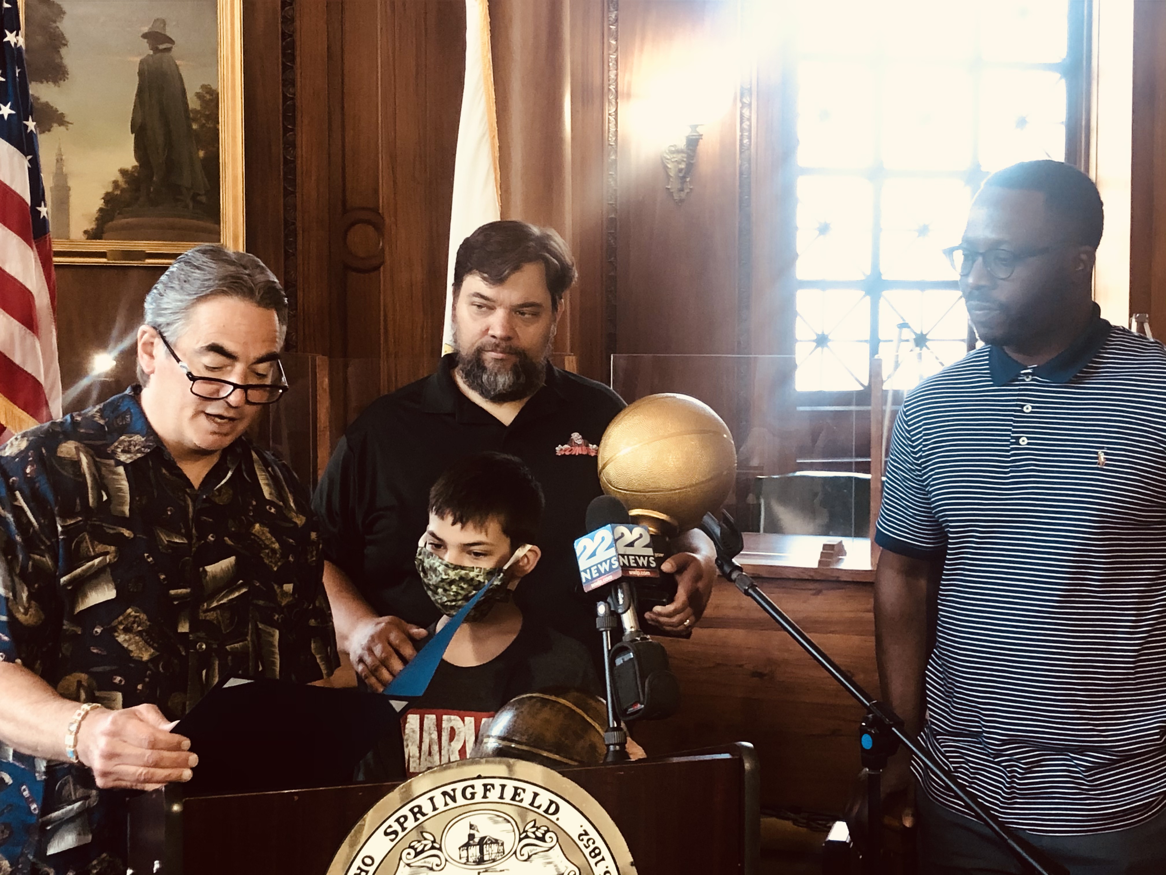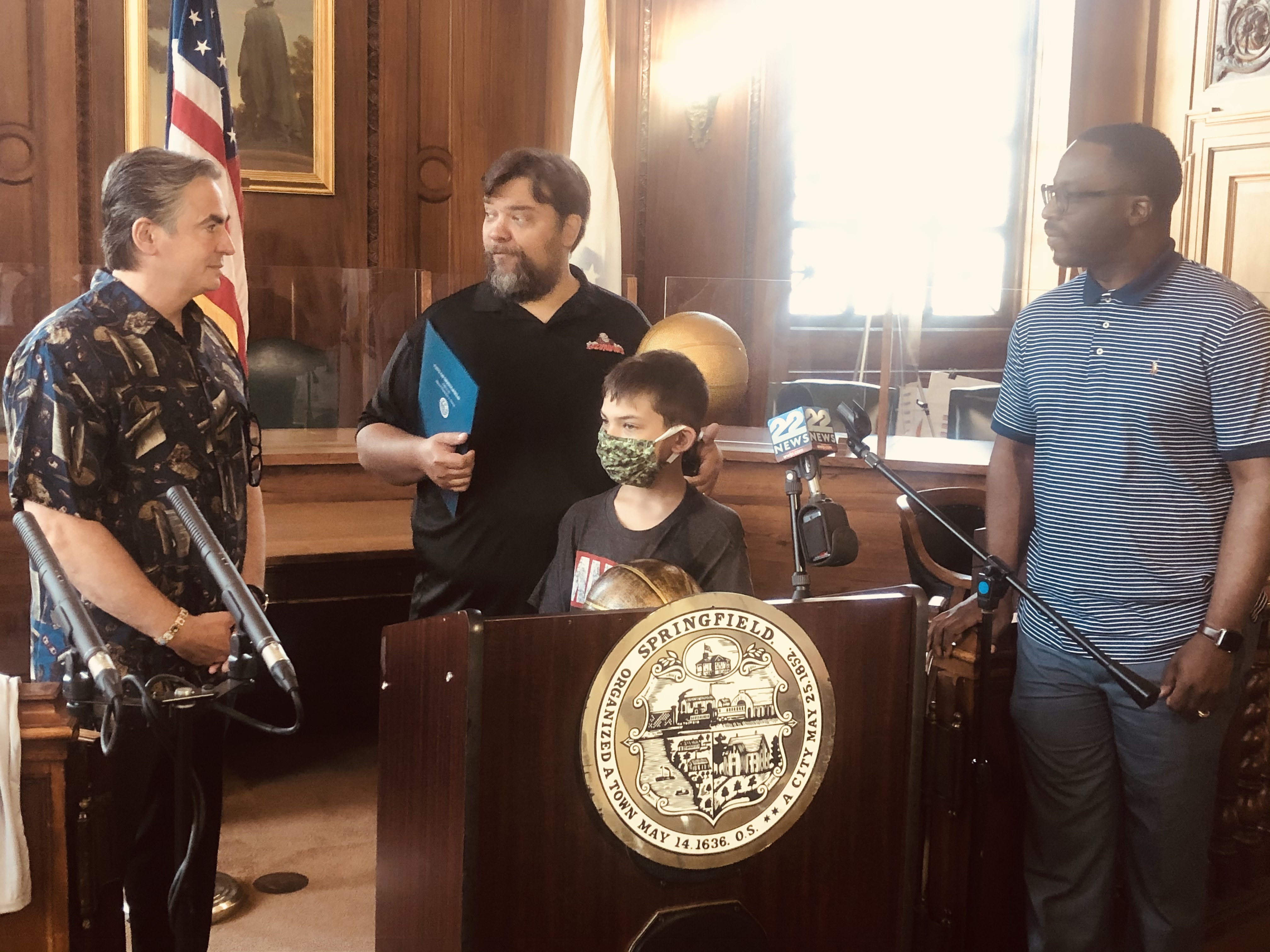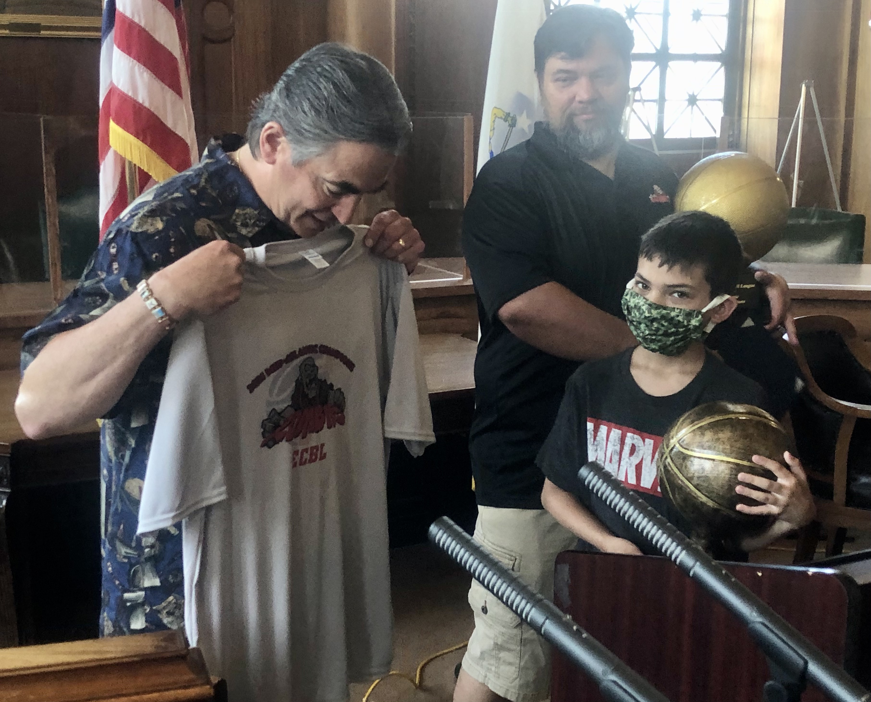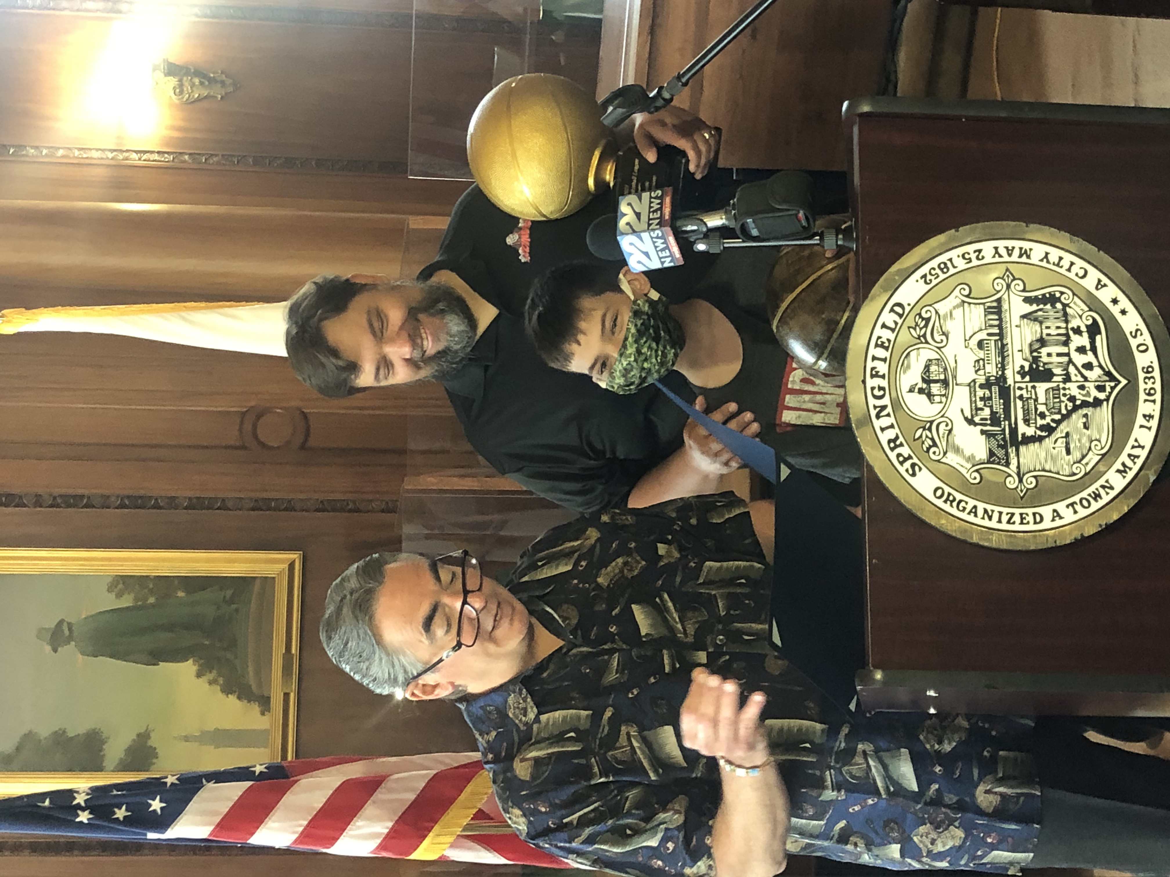 Mayor Domenic J. Sarno and Mayoral Aide Lavar “Coach” Click joined today with Bill Bullock, owner of Western Mass Zombies Basketball team, and his son Nicholas, as well as South End Community Center Executive Director Wesley Jackson to congratulate the Zombies players and coaches on winning their first ever East Coast Basketball League (ECBL) Mid-Atlantic Basketball Title.