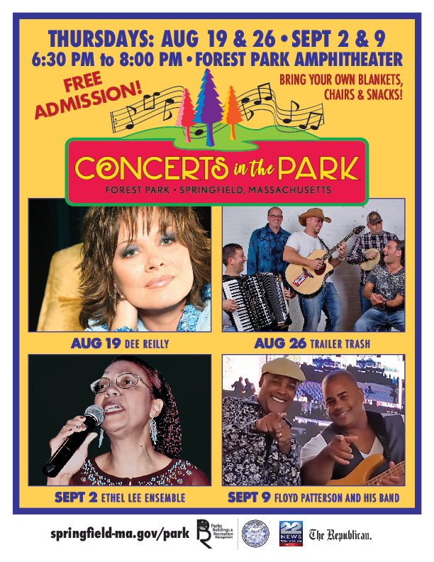 Attendees may enter Forest Park through the Sumner Avenue or Route 5 entrances for free after 5:30 p.m. on the nights of concerts. For complete details, please visit the Park Department website at www.springfield-ma.gov/park or call 787-6435.