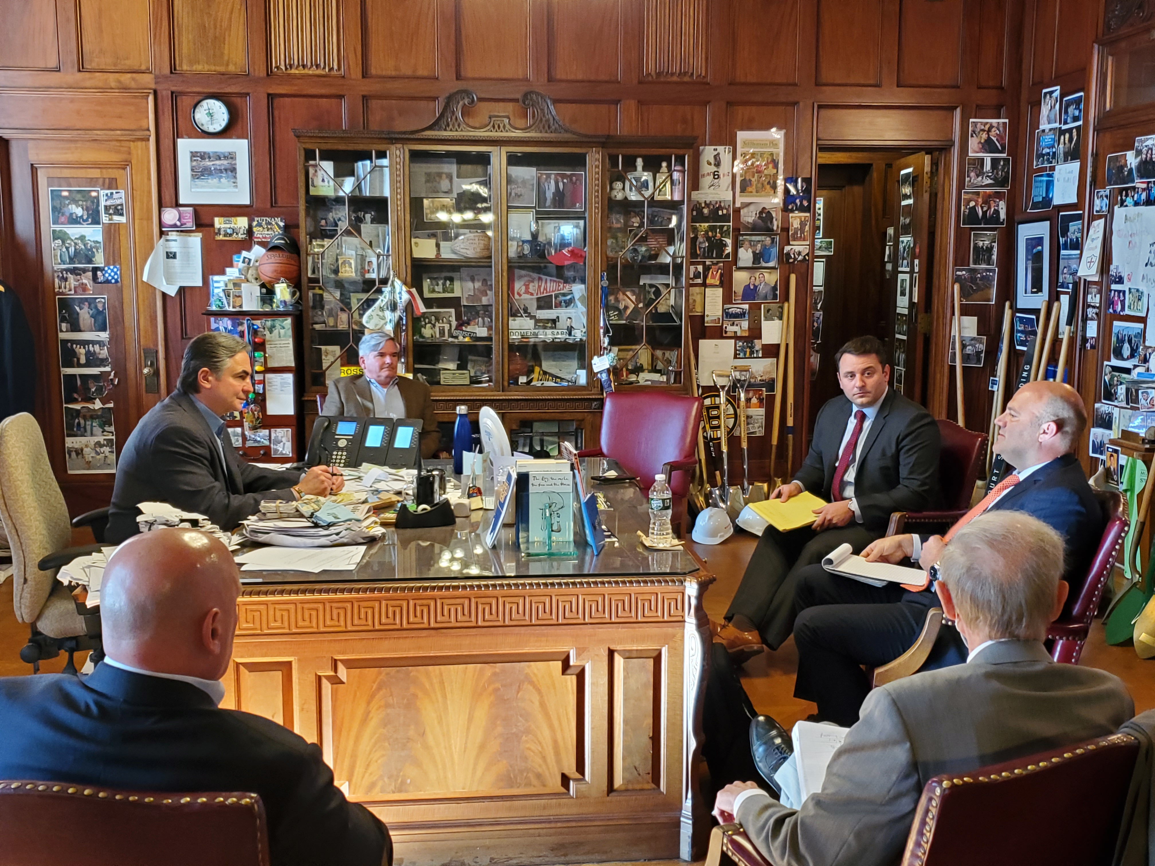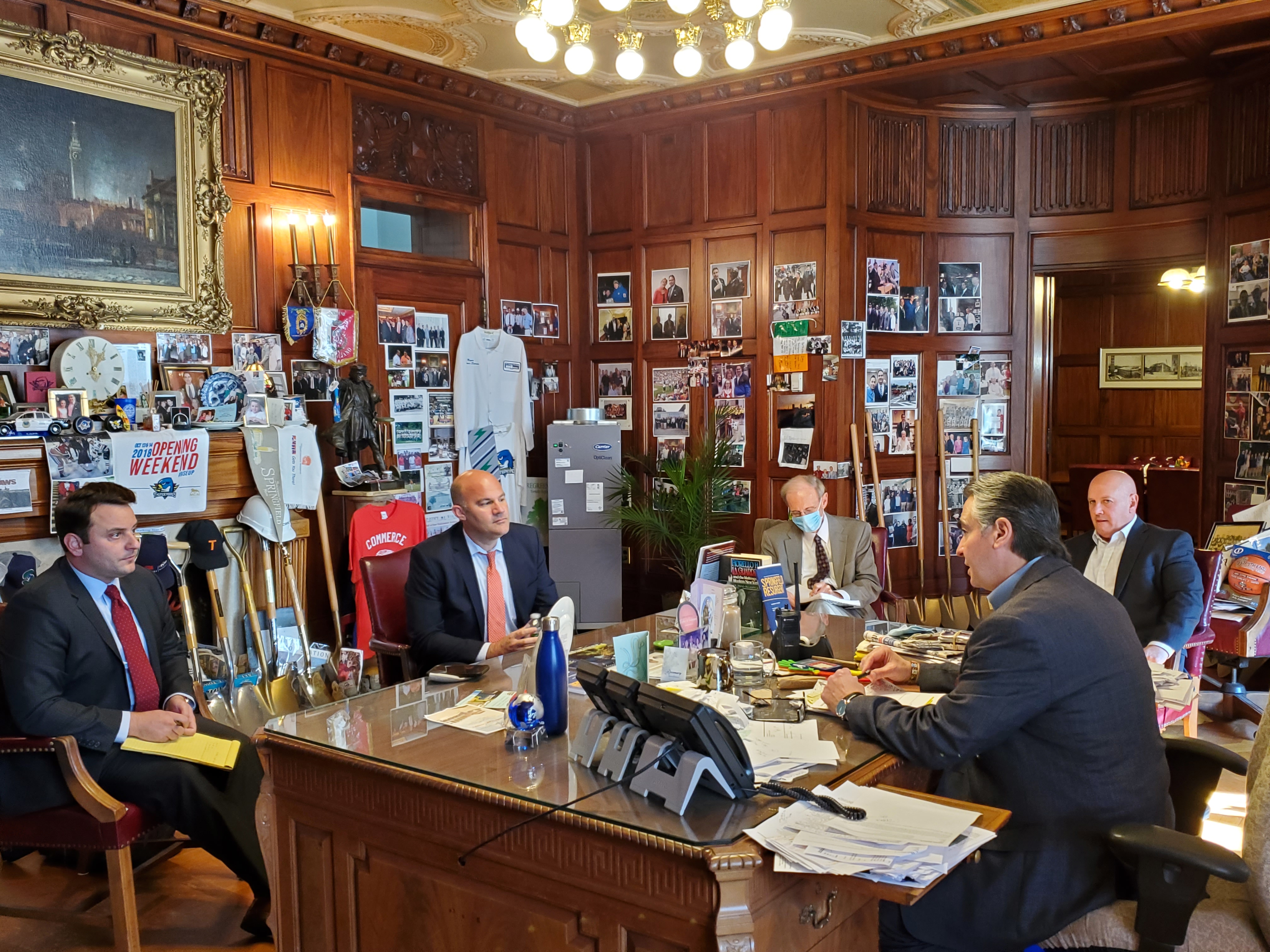 Mayor Domenic J. Sarno, working with Congressman Richard E. Neal, met today with MassMEDIC President Brian Johnson and Director of Government Relations for ML Strategies Anthony DeMaio to discuss re-employment efforts for Smith & Wesson employees and expanding their industry right here in Springfield. Chief Development Officer Tim Sheehan, MassHire Executive Director David Cruise and Chief of Staff Tom Ashe were also in attendance.