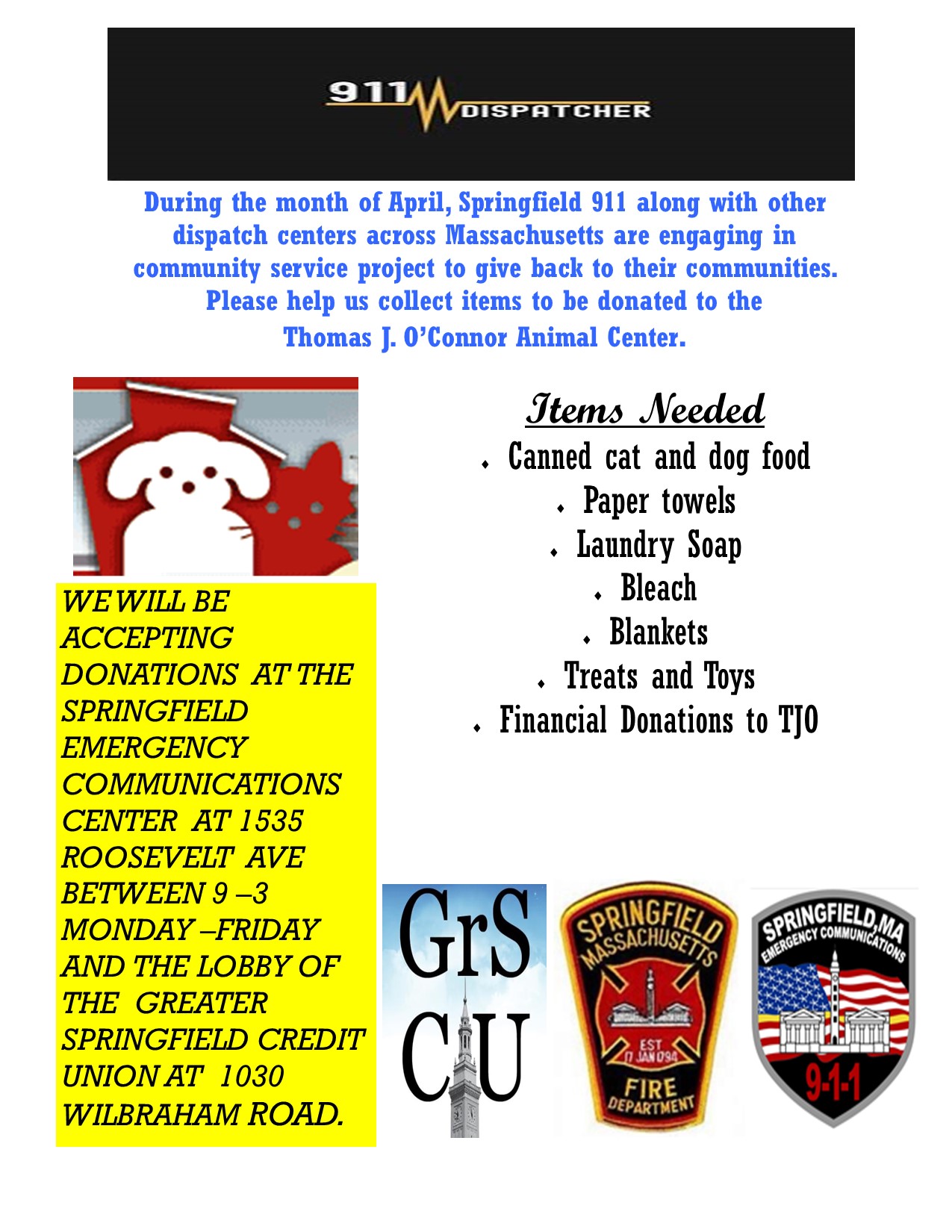 In addition to the critical service they provide every day, 911 Dispatchers from across the state are engaging in community service projects to give back to their communities. Mayor Domenic J. Sarno, Fire Commissioner BJ Calvi and Deputy Chief David Wells announced earlier this month that the Springfield Emergency Communications Office will be collecting donations for the Thomas J. O'Connor Animal Control and Adoption Center during the month of April.