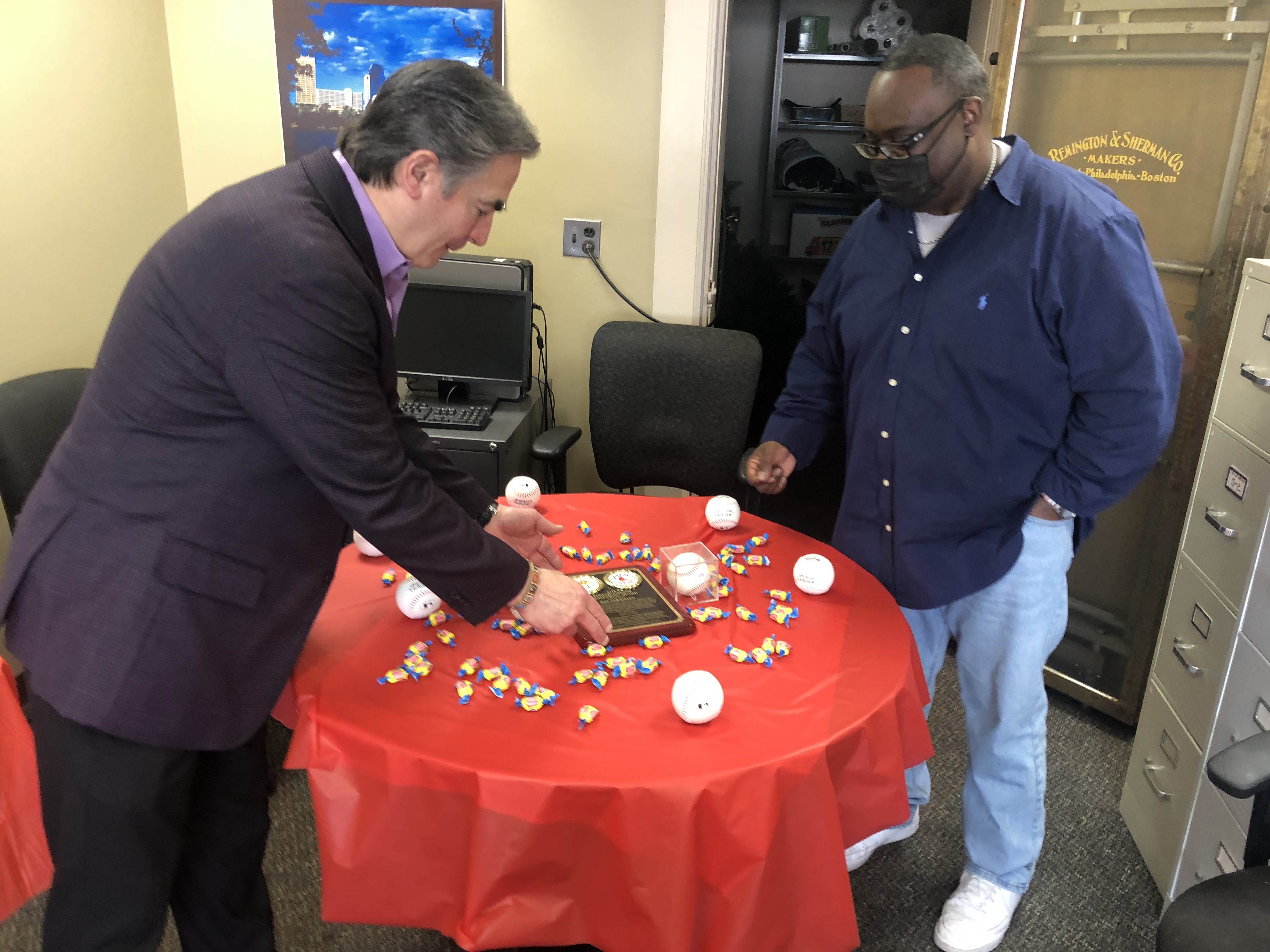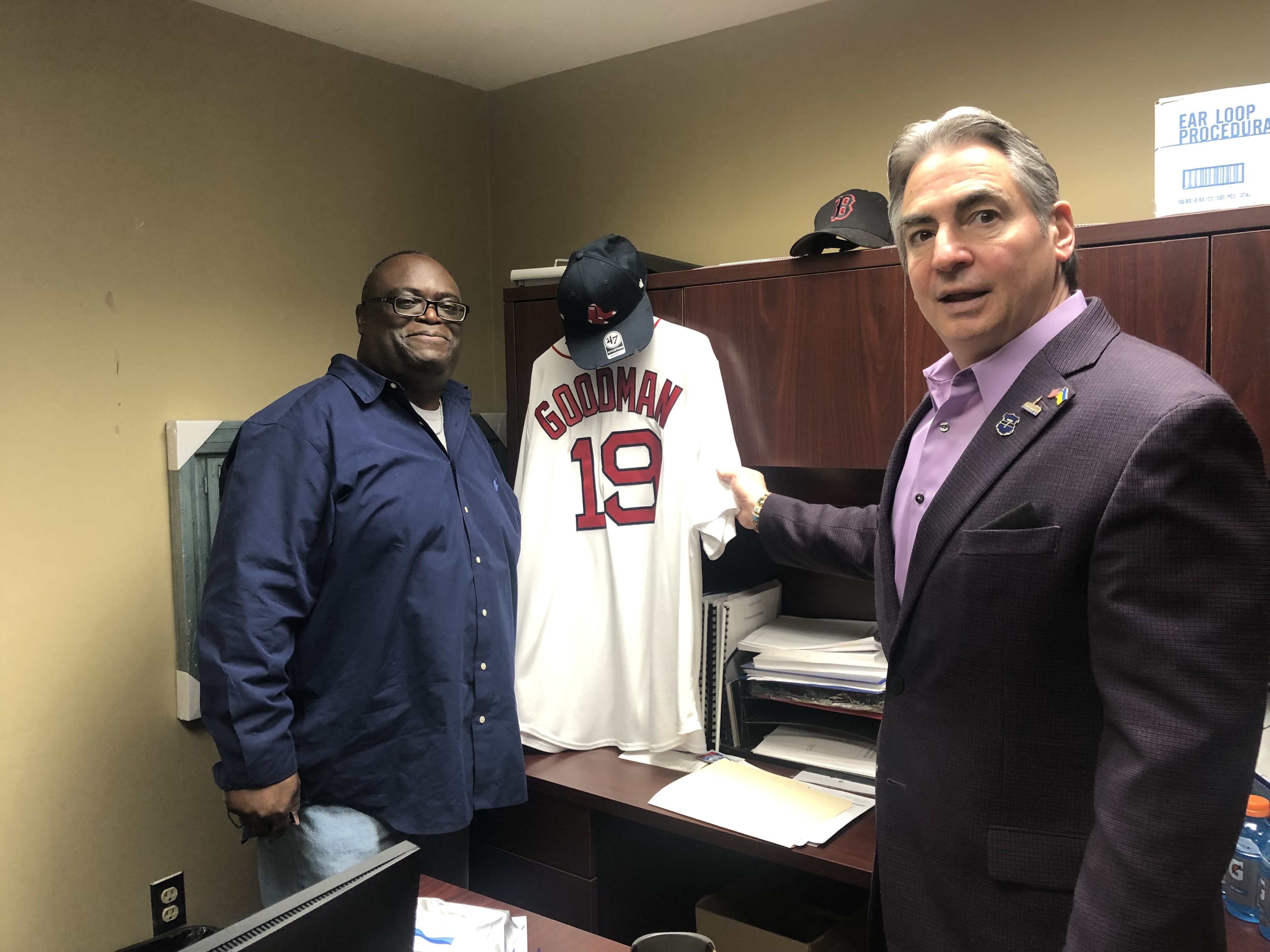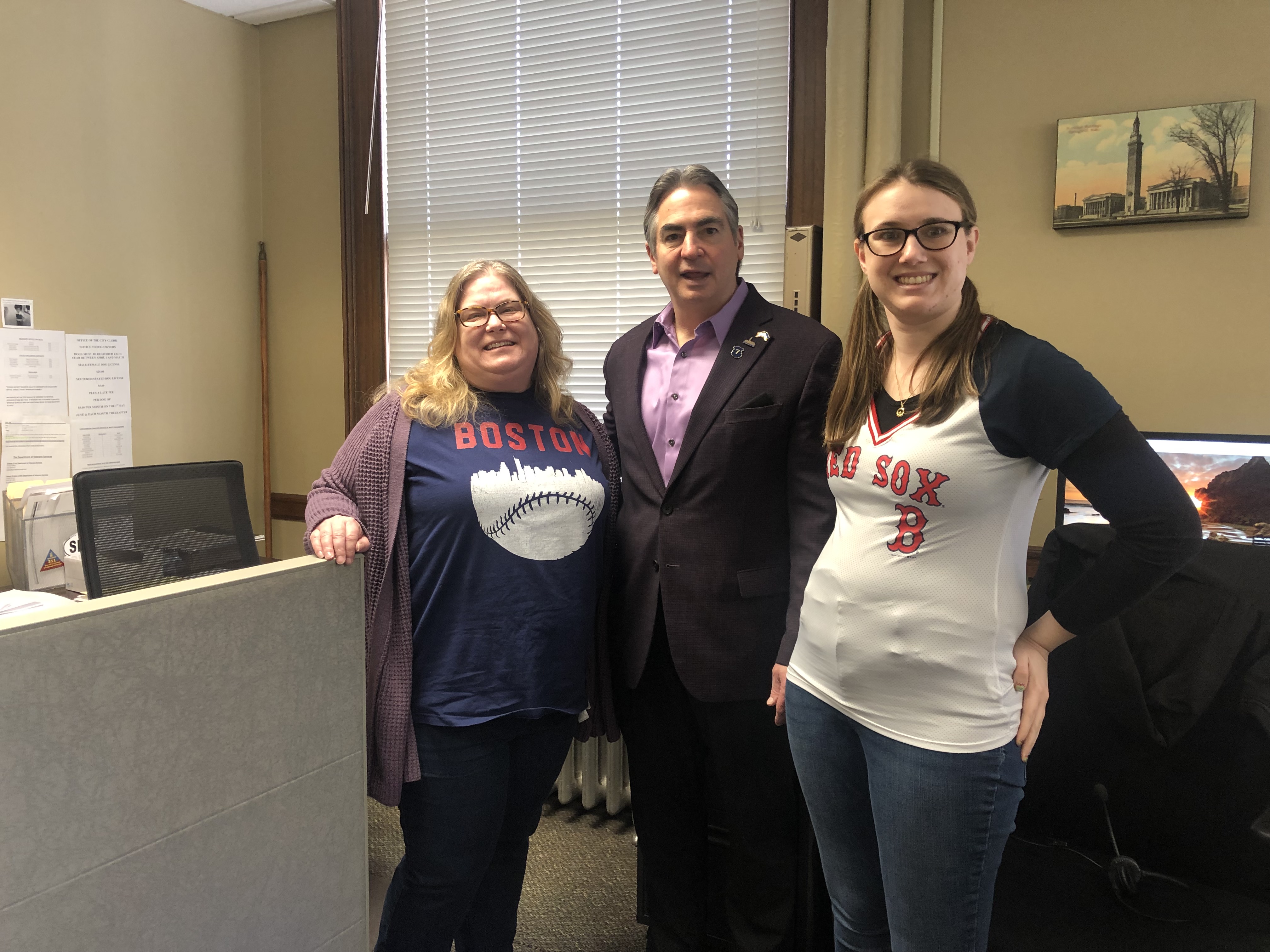 Mayor Sarno stated, “What a great way to welcome Spring and baseball season! It was nice to stop in and see Roy and our dedicated 311 team decked out in their Red Sox gear getting ready to cheer them on for their home opener. I know Roy’s grandmother Viola Goodman would be so proud. Thank you to the 311 team – who do an excellent job providing customer service assistance to our residents – for inviting me to visit today, and go Red Sox!”