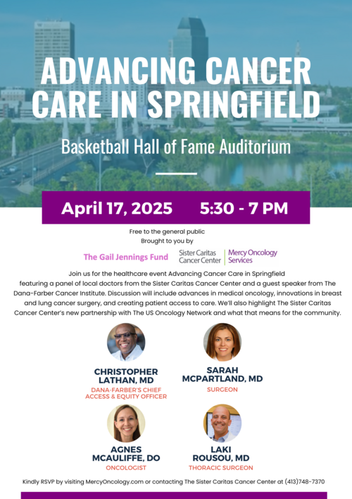 This program is free and open to the public. Please RSVP at www.MercyOncology.com or by contacting the Sister Caritas Cancer center at 413-748-7370.