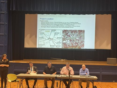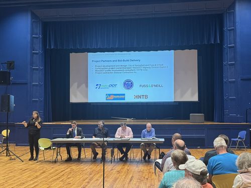 City of Springfield Department of Public Works Director Chris Cignoli joined Public Involvement Lead Billy Parent, Design Consultant Steven Savaria, and MassDOT officials for the Public Information Meeting hosted by the Massachusetts Department of Transportation (MassDOT) on The Springfield “X” Intersection Reconstruction project that took place Wednesday, May 14, 2025 at 6:30 p.m. at the Forest Park Middle School Auditorium.