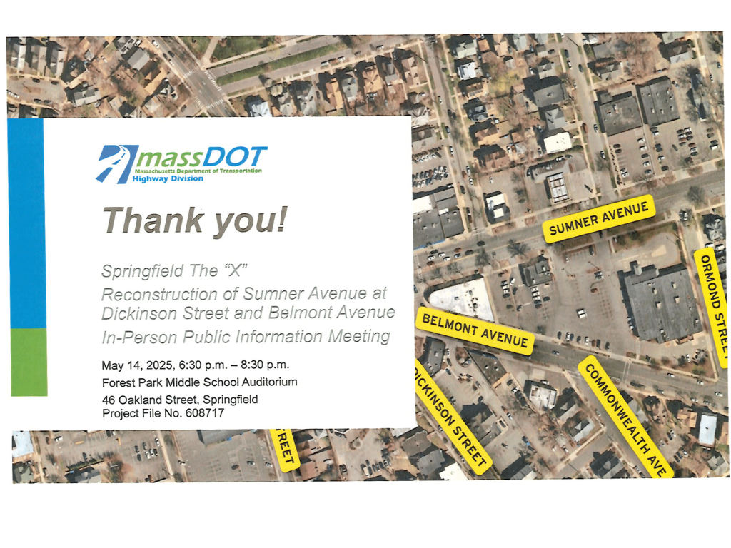 MassDOT held the Public Information Meeting to update the public on the status of the reconstruction of Sumner Avenue at the intersection of Dickinson Street and Belmont Avenue, The “X” Intersection, in Springfield, MA. The meeting was recorded and will be available thanks to Focus Springfield.