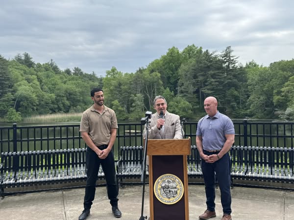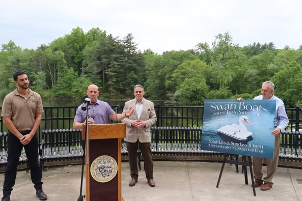 Mayor Domenic J. Sarno, Director of Parks, Buildings, and Recreation Management (PBRM) Thomas Ashe, and Aquatics Director Joe Federico and team joined on Friday morning at Forest Park to announce the return of a beloved recreational pastime to Porter Lake inside Forest Park this summer: paddle boats! At Forest Park’s Porter Lake, the city will once again offer pedal-style Swan Boat rentals this summer.