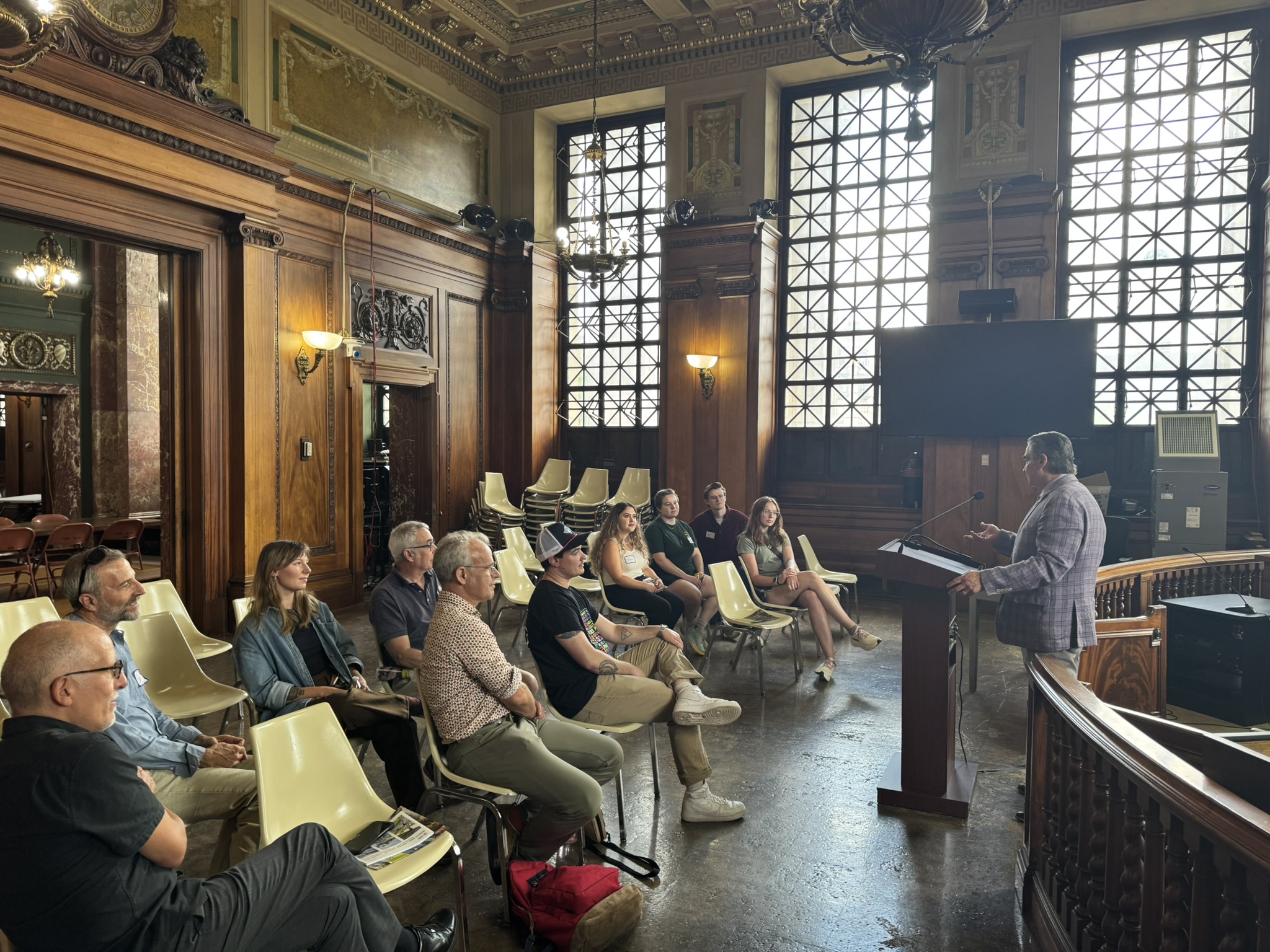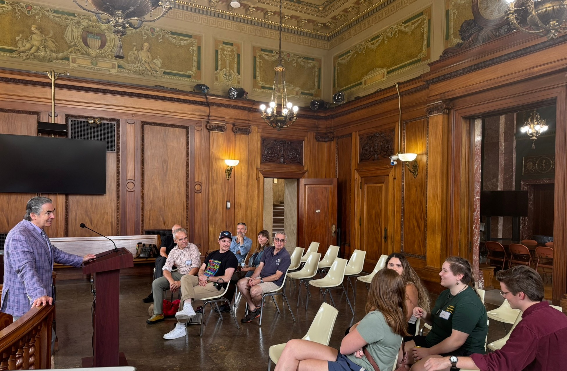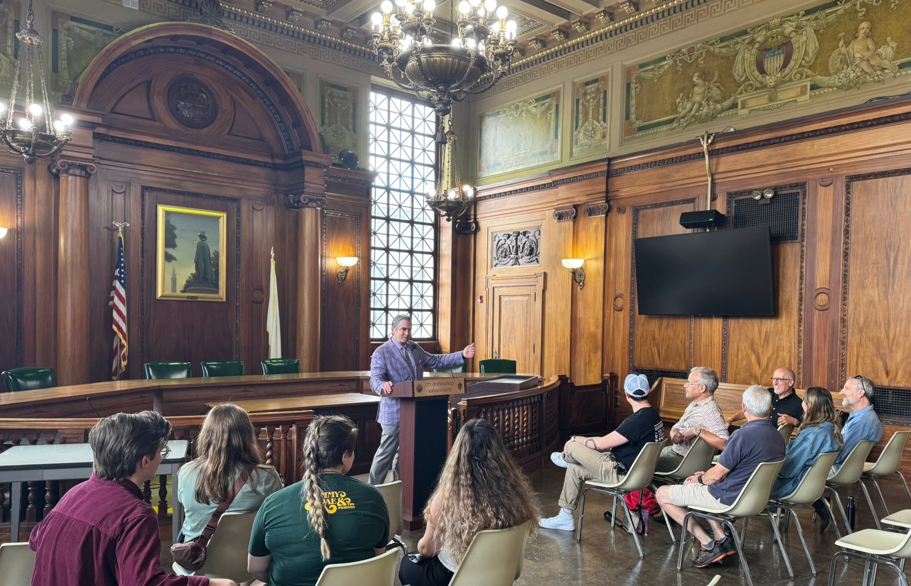 Mayor Domenic J. Sarno and Wilson Darbin, Project Manager for the Office of Planning and Economic Development, joined to welcome students and staff from the University of Massachusetts Amherst (UMass) to Springfield City Hall. Mayor Sarno chatted with Masters of Landscape Architecture Director and Professor Frank Sleegers, Professor Michael Perla Di Pasquale, and graduate students in the Landscape Architecture and Regional Planning program within UMass Amherst’s College of Social & Behavioral Sciences on Wednesday inside City Hall’s school committee chambers. City Hall was one stop on the students’ walking tour of Springfield yesterday as they kick-off a new semester.