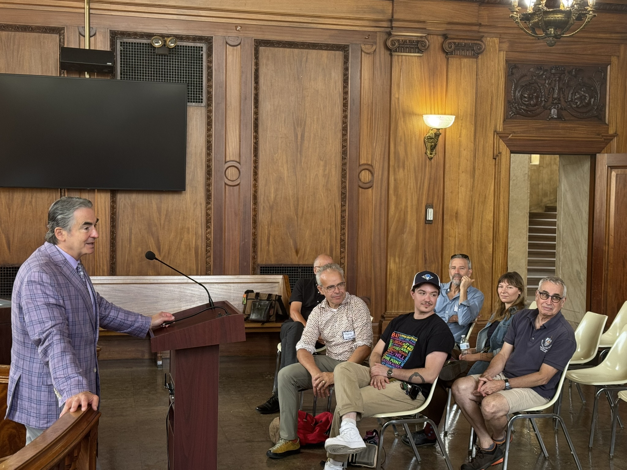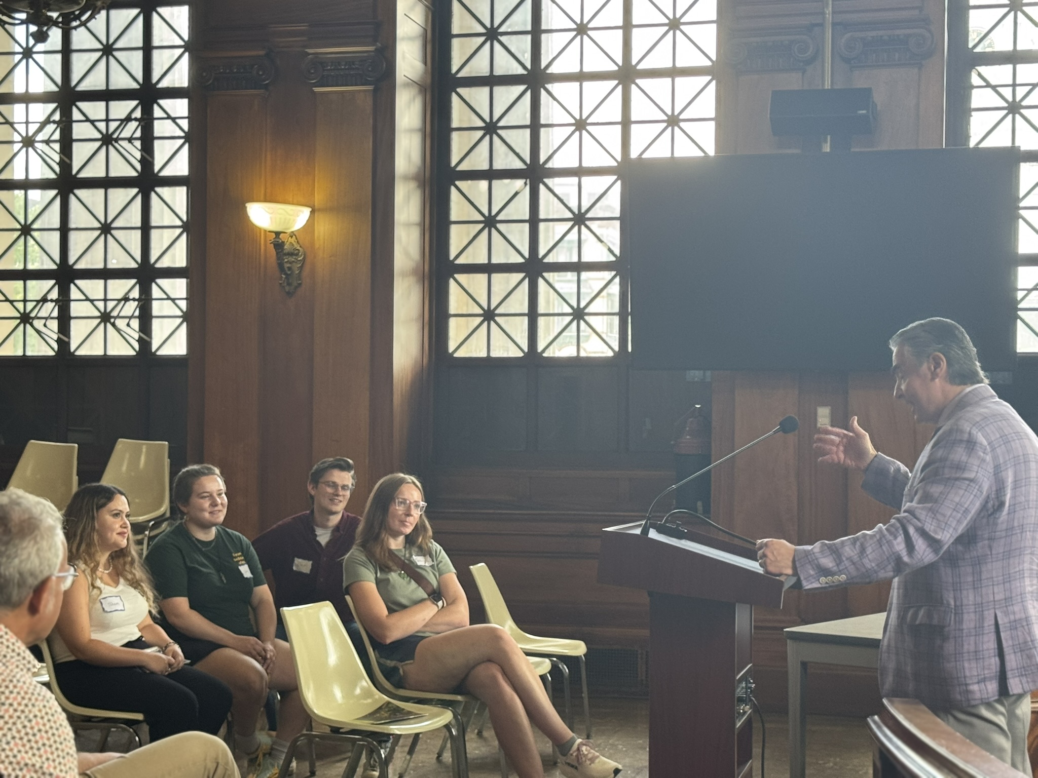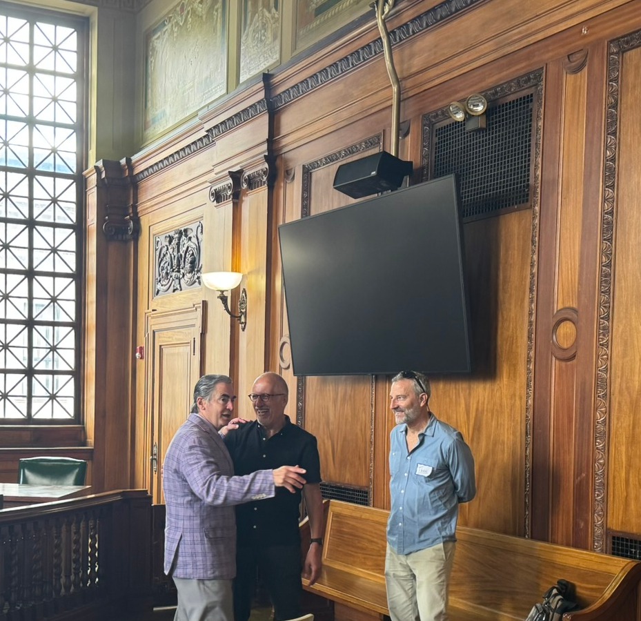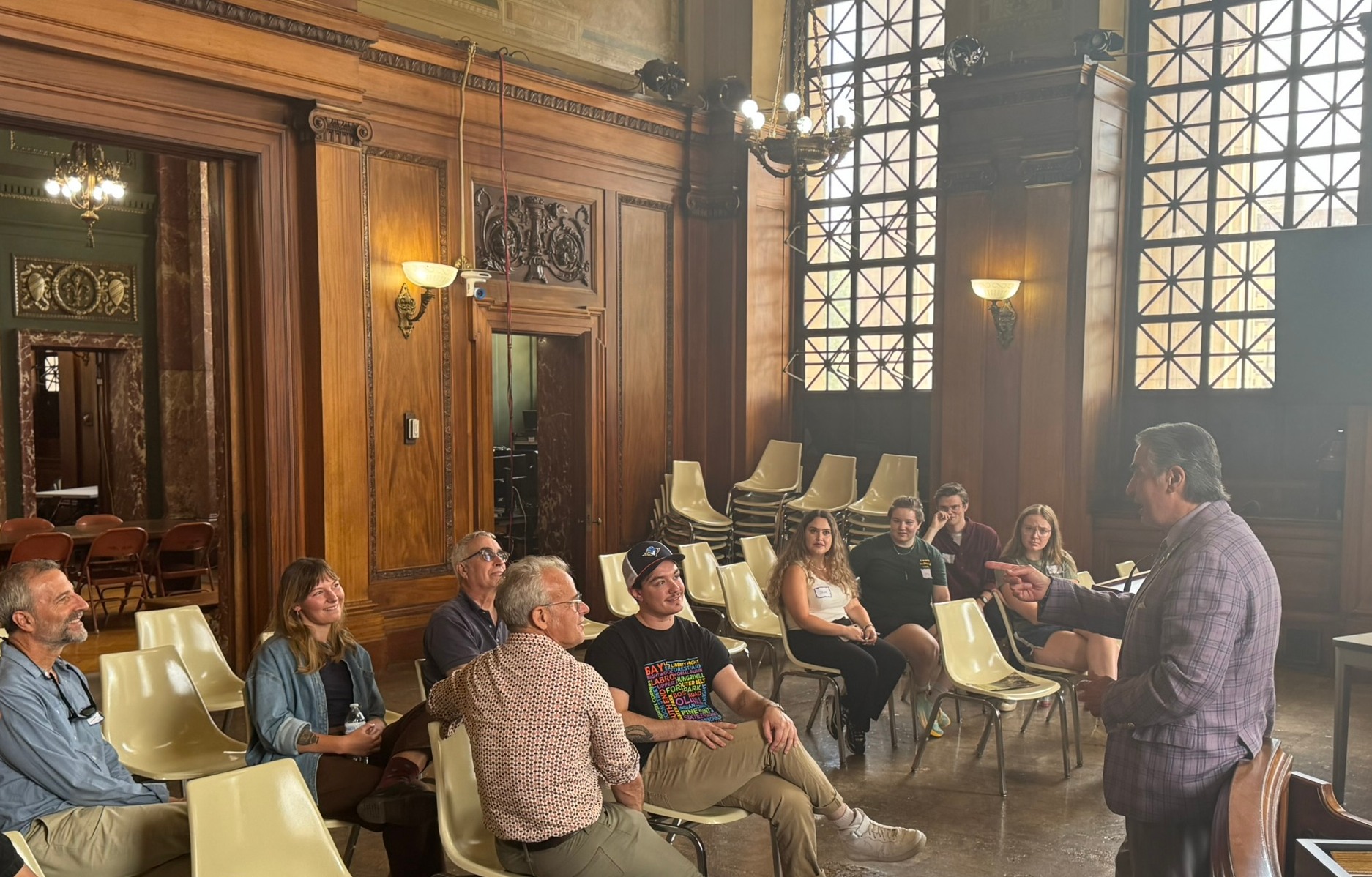 Mayor Domenic J. Sarno and Wilson Darbin, Project Manager for the Office of Planning and Economic Development, joined to welcome students and staff from the University of Massachusetts Amherst (UMass) to Springfield City Hall. Mayor Sarno chatted with Masters of Landscape Architecture Director and Professor Frank Sleegers, Professor Michael Perla Di Pasquale, and graduate students in the Landscape Architecture and Regional Planning program within UMass Amherst’s College of Social & Behavioral Sciences on Wednesday inside City Hall’s school committee chambers. City Hall was one stop on the students’ walking tour of Springfield yesterday as they kick-off a new semester.