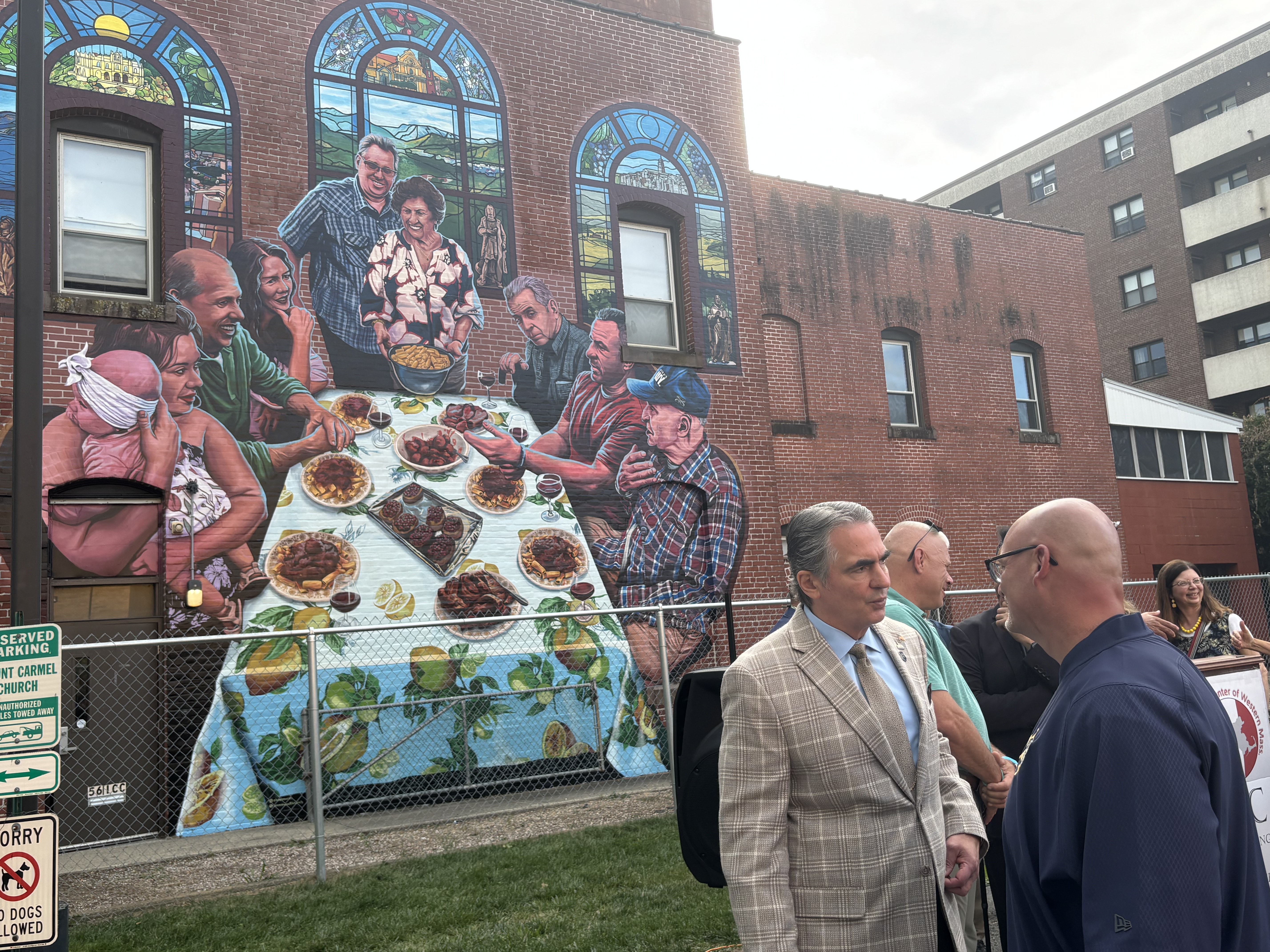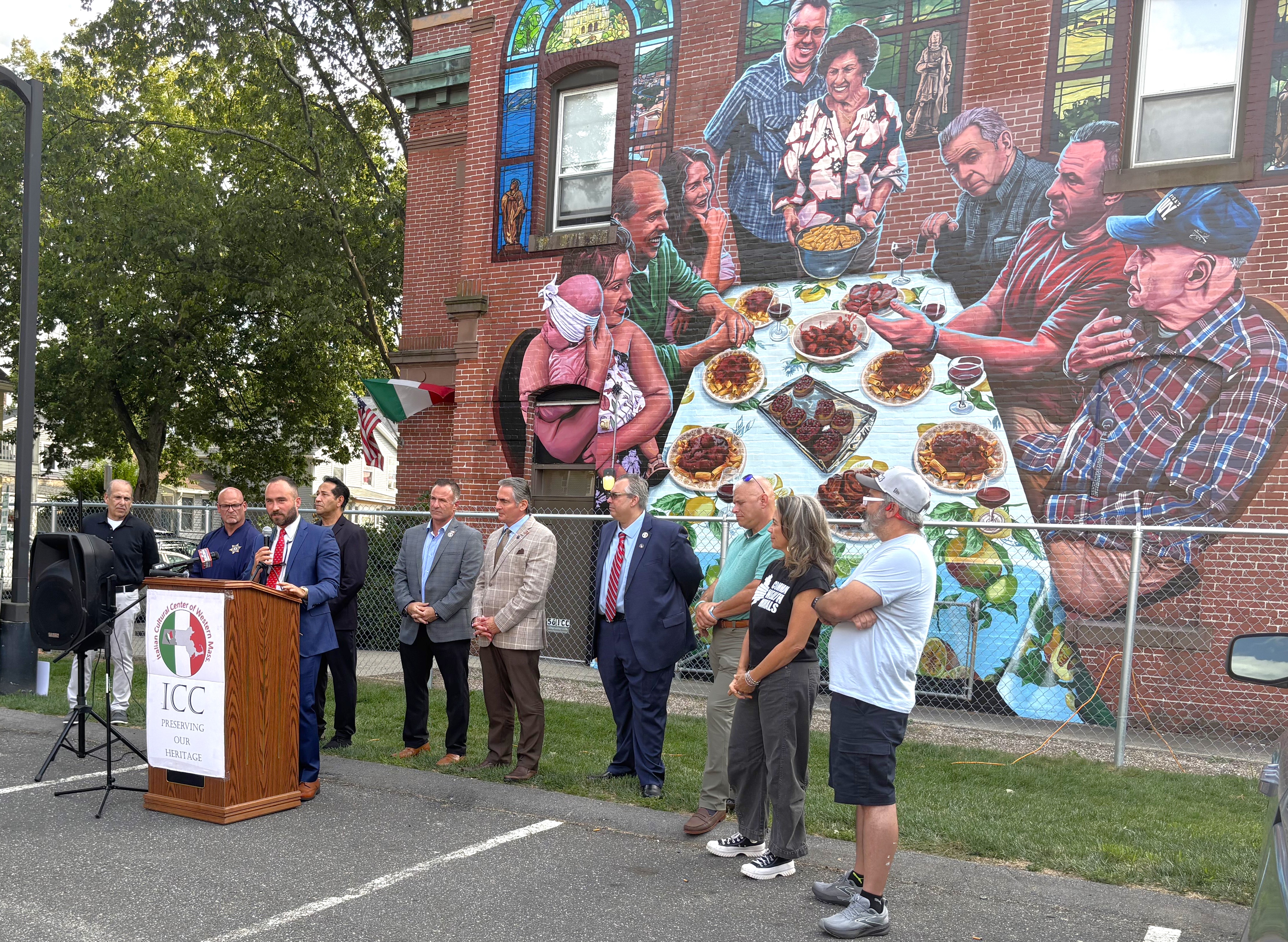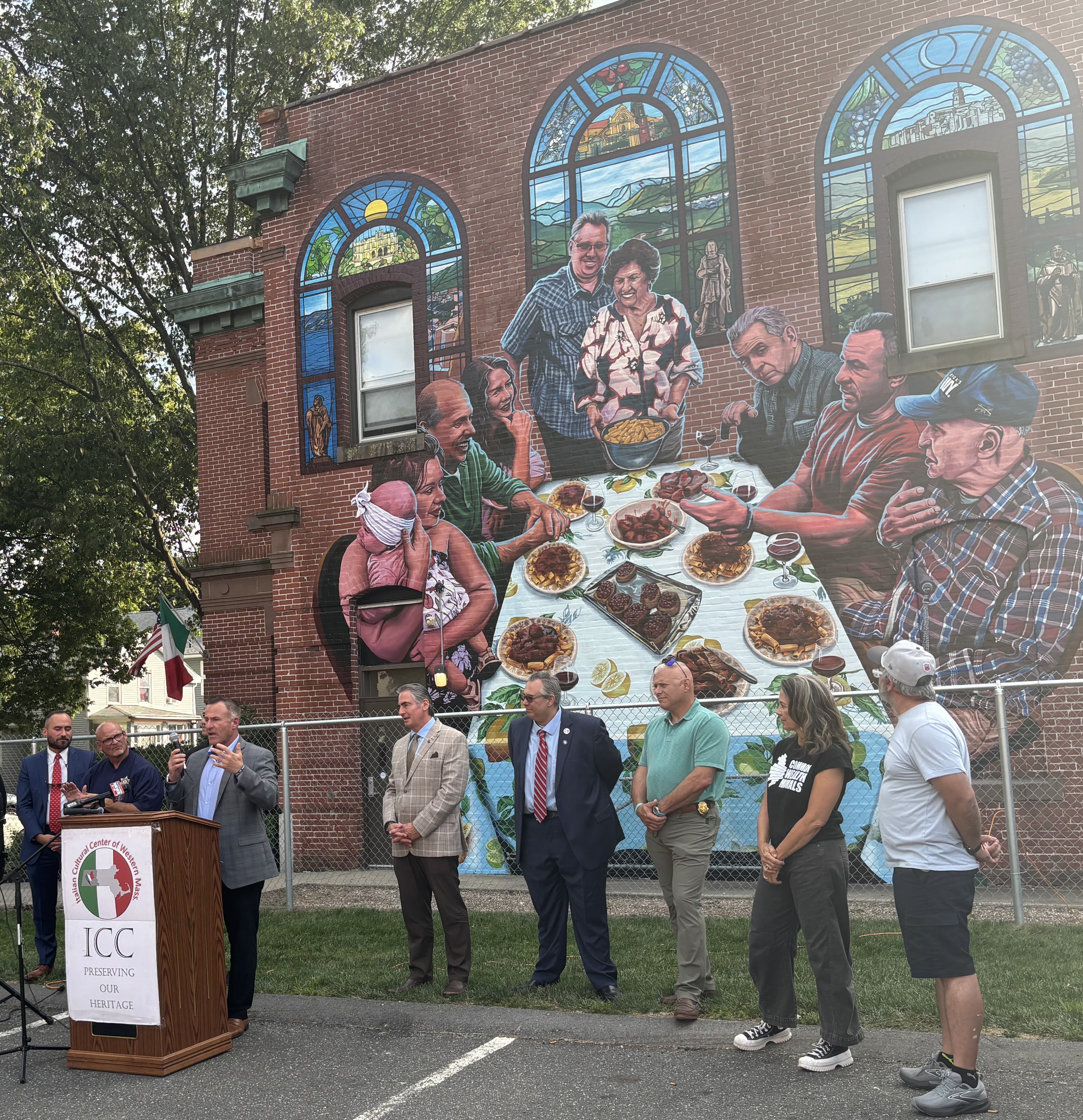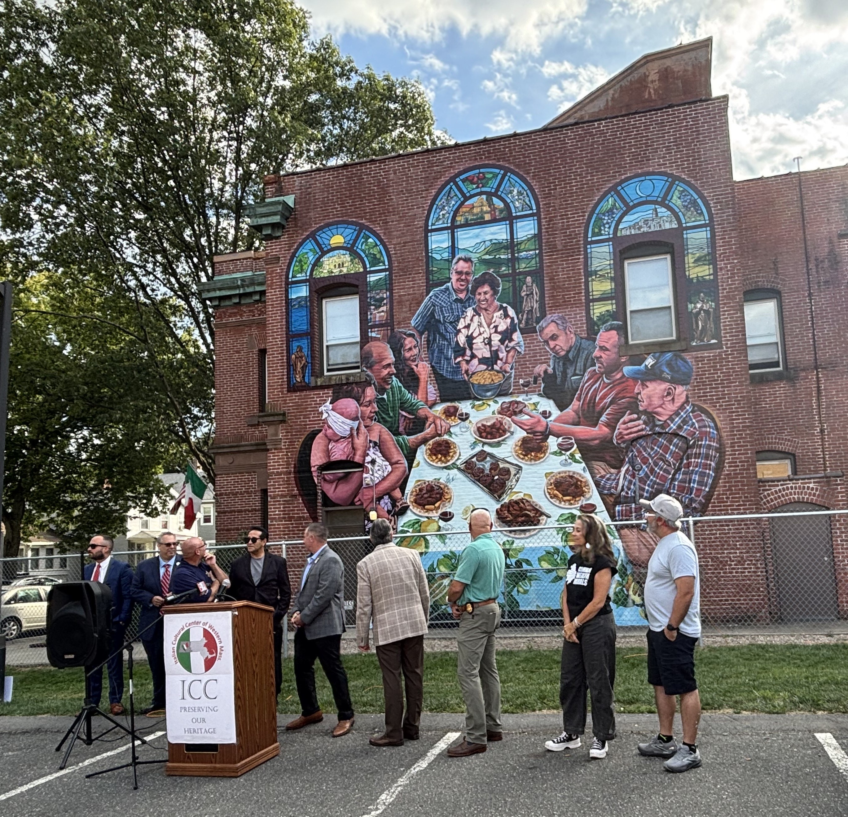 “As a first generation Italian-American and proud member of the ICC, this mural at the ICC building means a lot to the community. It was a proud and exciting moment to see the completed “Sunday Dinner” mural by Eric Okdeh depicting some of our very own ICC members celebrating faith, familia, and food. Sunday dinner and coming together with family is so important and what a beautiful tradition to memorialize here,” continued Mayor Sarno. “As with all their mural projects, Common Wealth Murals gets the community directly involved in enhancing our city’s aesthetics and pedestrian experience, which makes our city look good and people feel good, leading to spin off effects of people spending money by patronizing our business and cultural amenities.”
