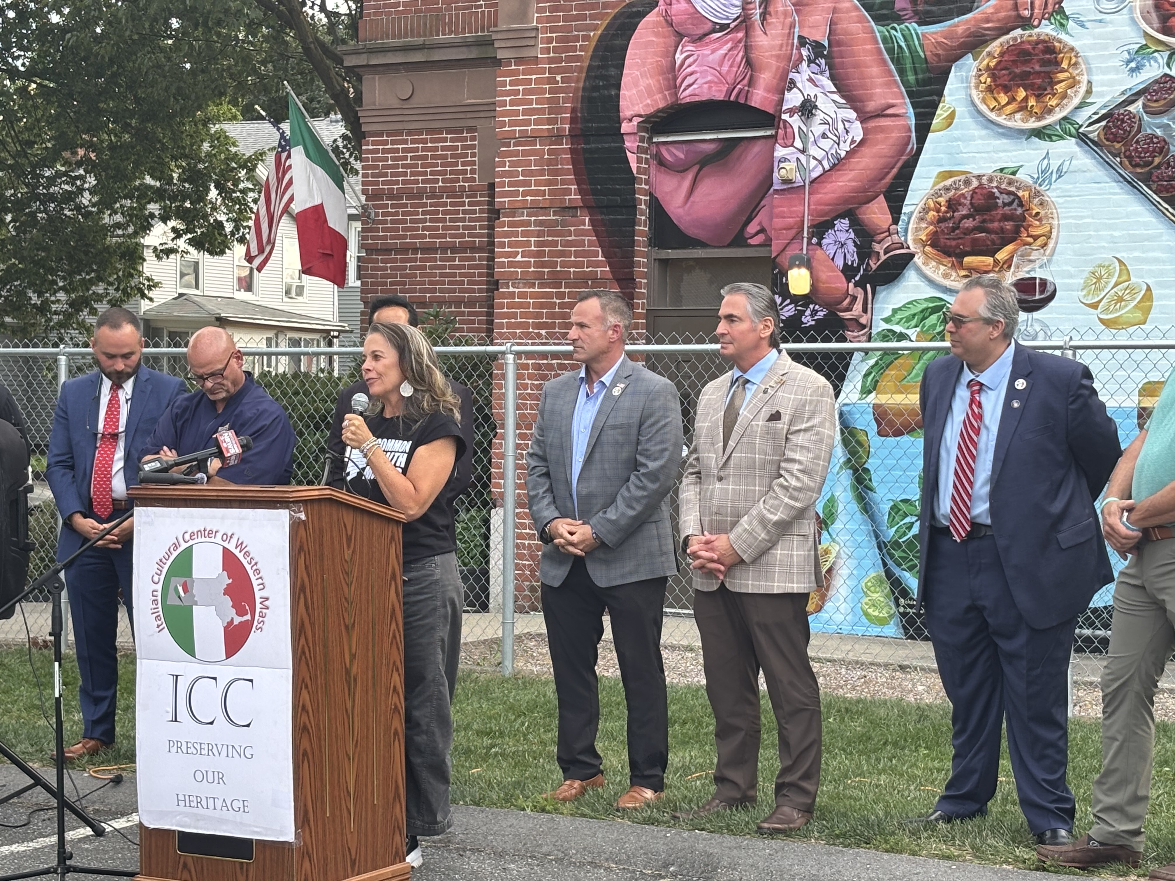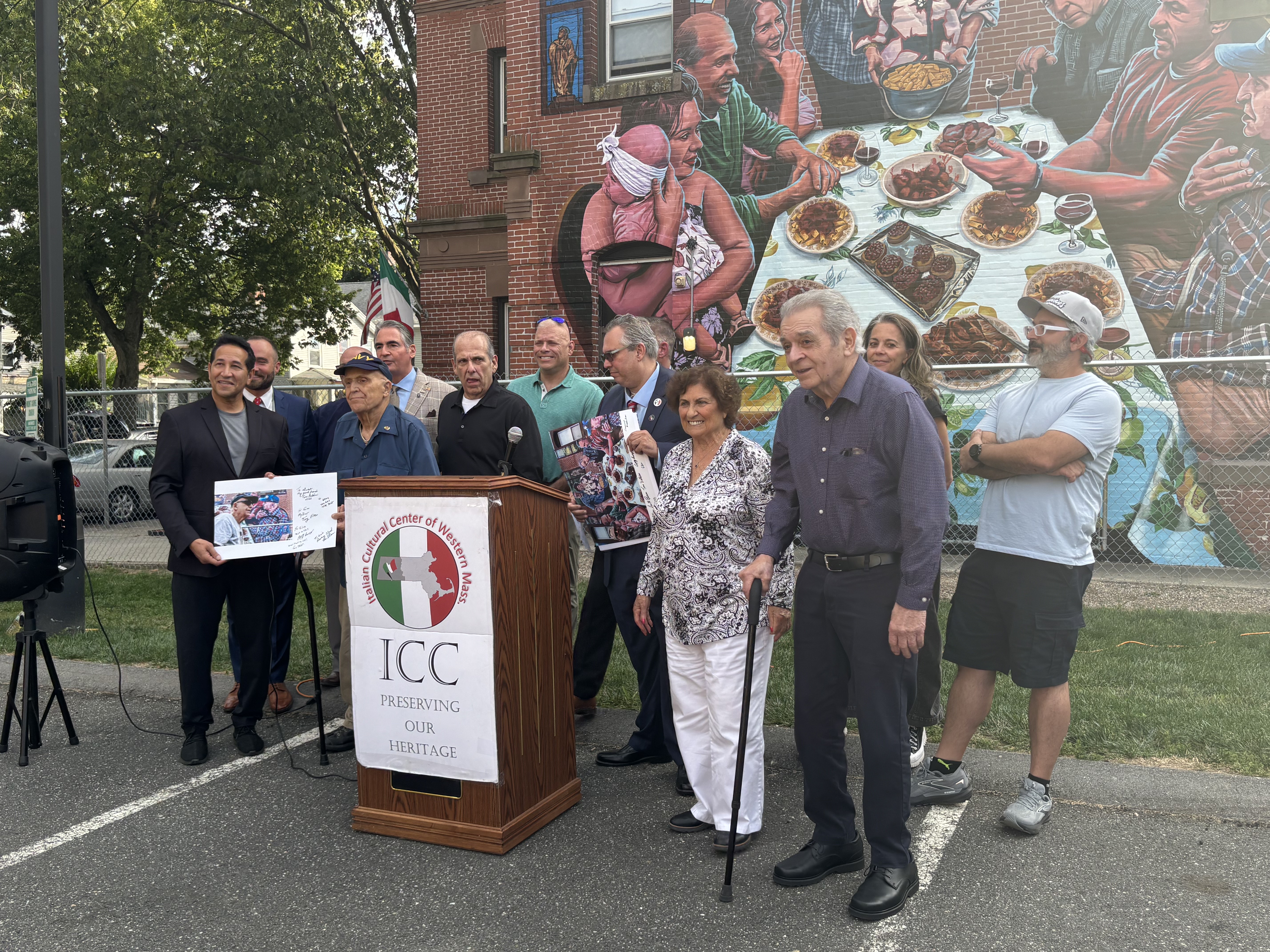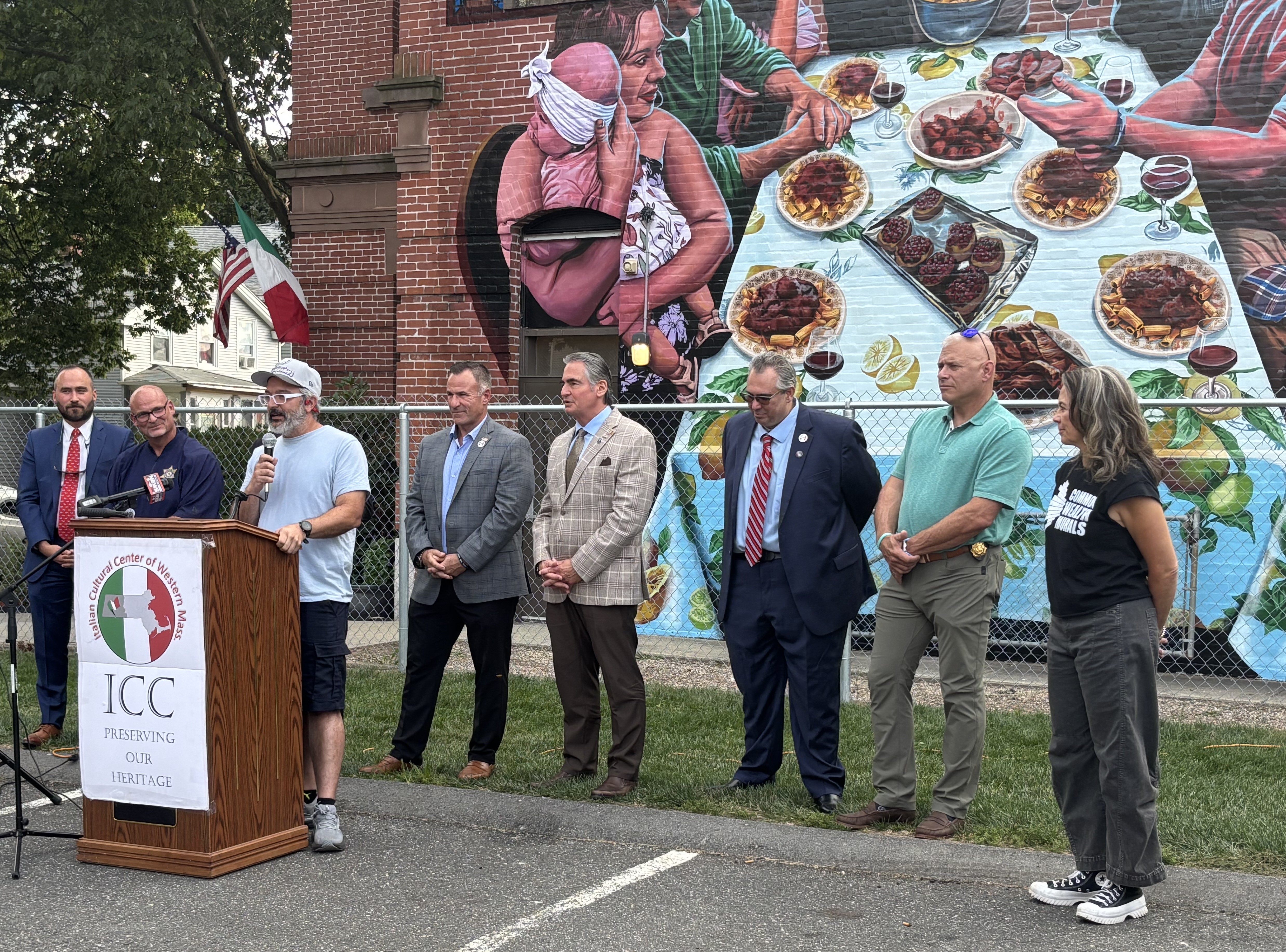 Mayor Sarno was honored to be in Springfield’s South End neighborhood with Common Wealth Murals Director Britt Ruhe, President of Italian Cultural Center of Western Massachusetts Charles Becker, the mural artist Eric Okdeh, local officials including City Council President Attorney Michael Fenton, Hampden County Sherriff Nick Cocchi, State Representative Carlos Gonzalez, Fire Commissioner BJ Calvi, President of the South End Citizens Council Leo Florian, Agawam City Council Vice President Anthony Russo, along with members of the ICC and community.