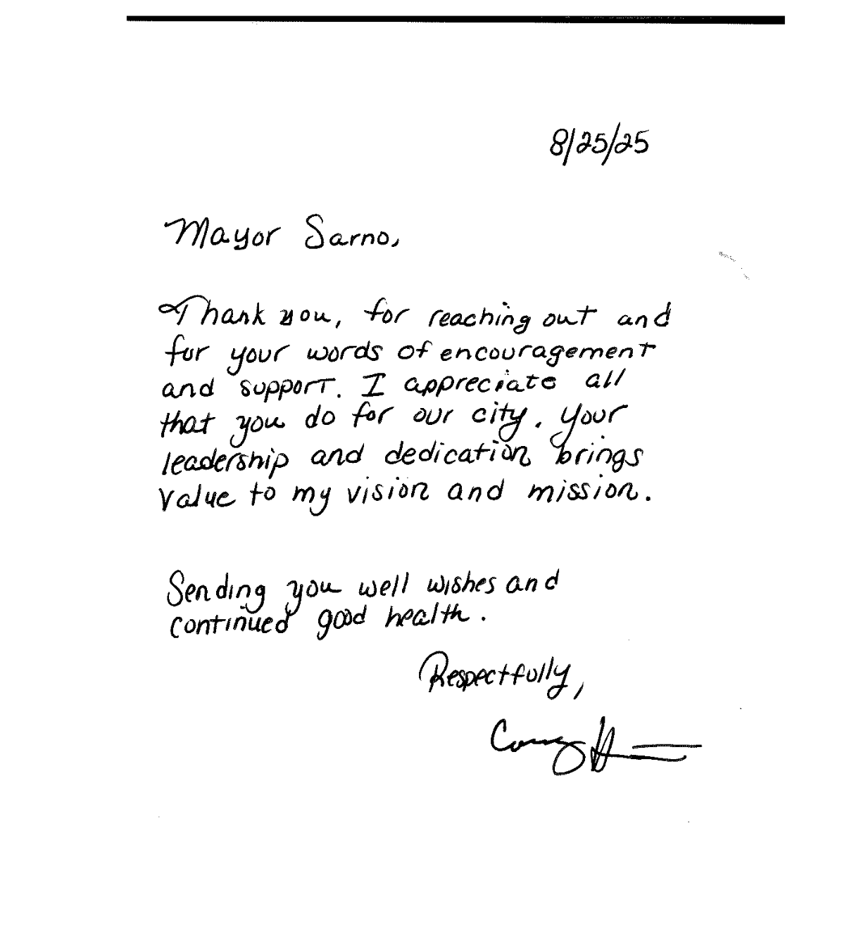 Mayor Sarno writes, “Mr. Houston’s story is very inspiring and important to share for others who may be struggling. I was so touched to receive a nice note of thanks and deeply appreciate Mr. Houston’s continued positive message of perseverance, hope, and not giving up in the face of adversity. Thank you, Mr. Houston – ‘Corey,’ and wishing you well. Good health and God Bless.”