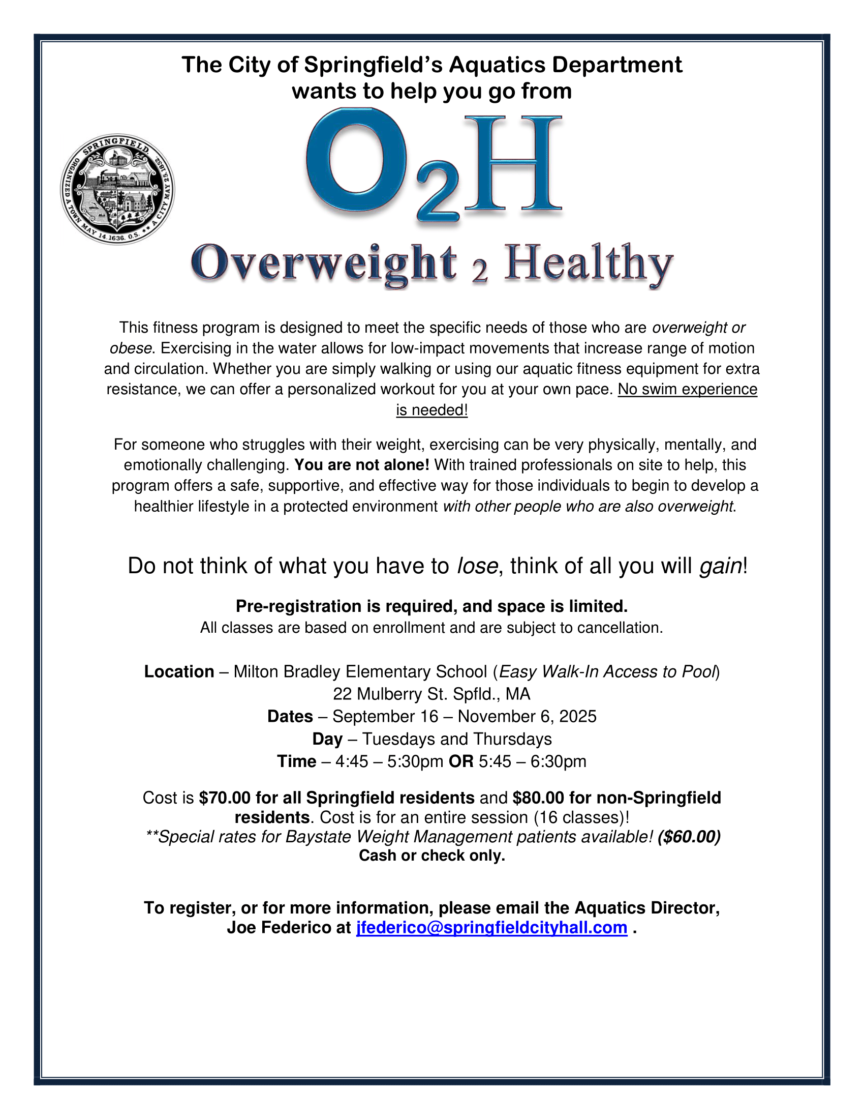 The O2H program will be offered at Milton Bradley School on 22 Mulberry St, Springfield, MA. There is a walk-in ramp for easy access to the pool. The program will run twice a week on Tuesday and Thursday from 4:45 – 5:30pm OR 5:45pm – 6:30pm beginning September 16, 2025 until November 6, 2025. Pre-registration is required, and there is a cash or check only fee of $70.00 per person for City residents and $80.00 per person for non-City residents. There is also a special rate for Baystate Weight Management patients, available at only $60.00 for the entire session (which includes 16 classes)! All fees are due on the first day of class. The capacity for the program will cap at 25 swimmers per class, so call to register soon!