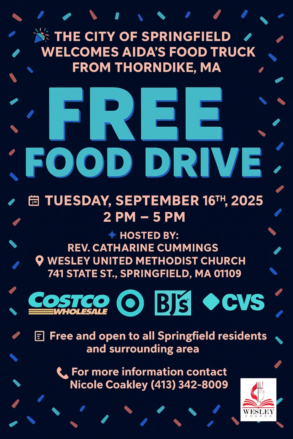 Mayor Domenic J. Sarno commends and thanks community leader and organizer Nicole Coakley for her collaboration with Rev. Catharine Cummings at Wesley United Methodist Church to bring a Free Food Drive to residents on Tuesday, September 16th, 2025, from 2:00 PM – 5:00 PM. The event will held at Wesley United Methodist Church, 741 State Street, Springfield, MA 01109.
