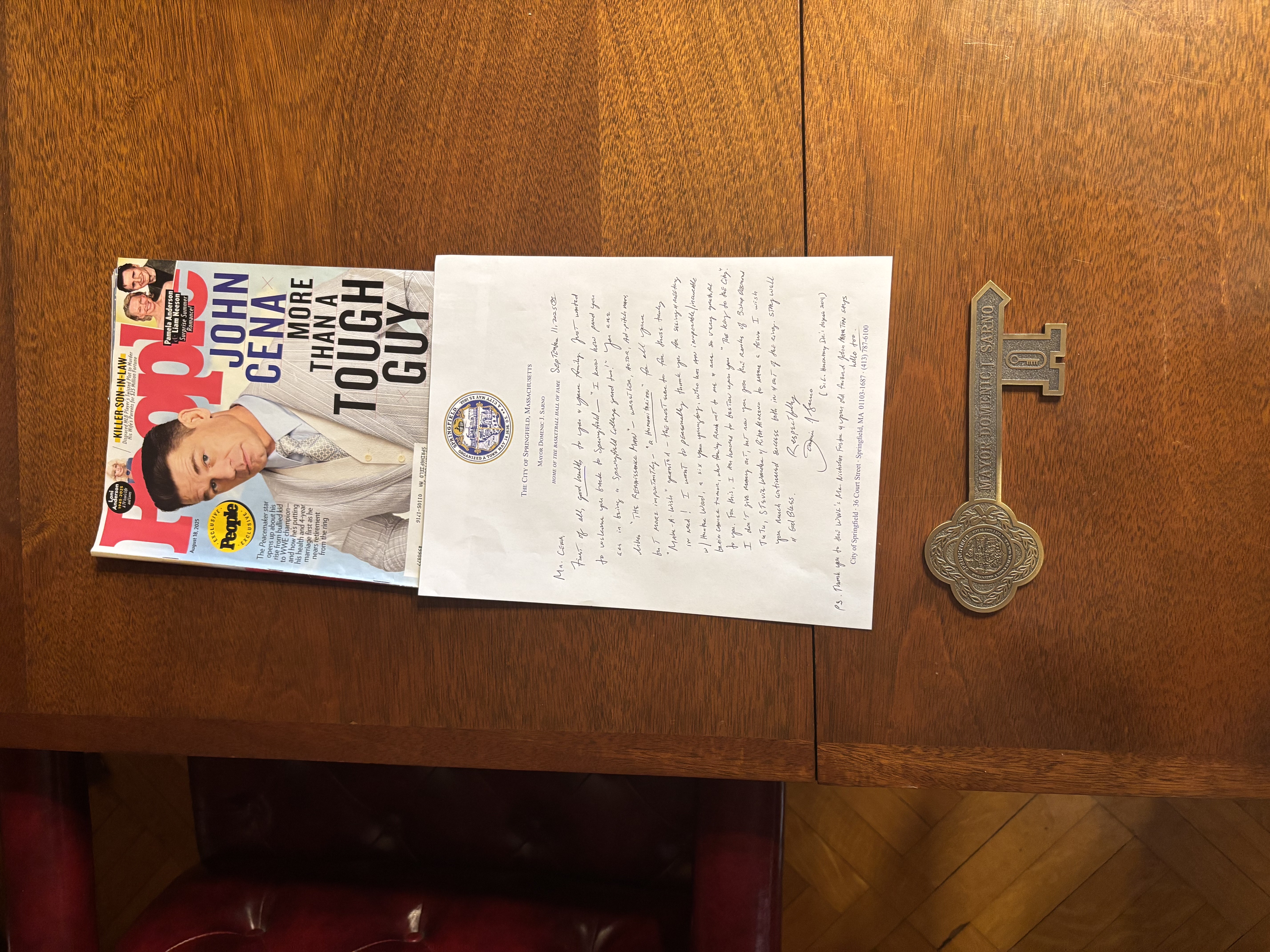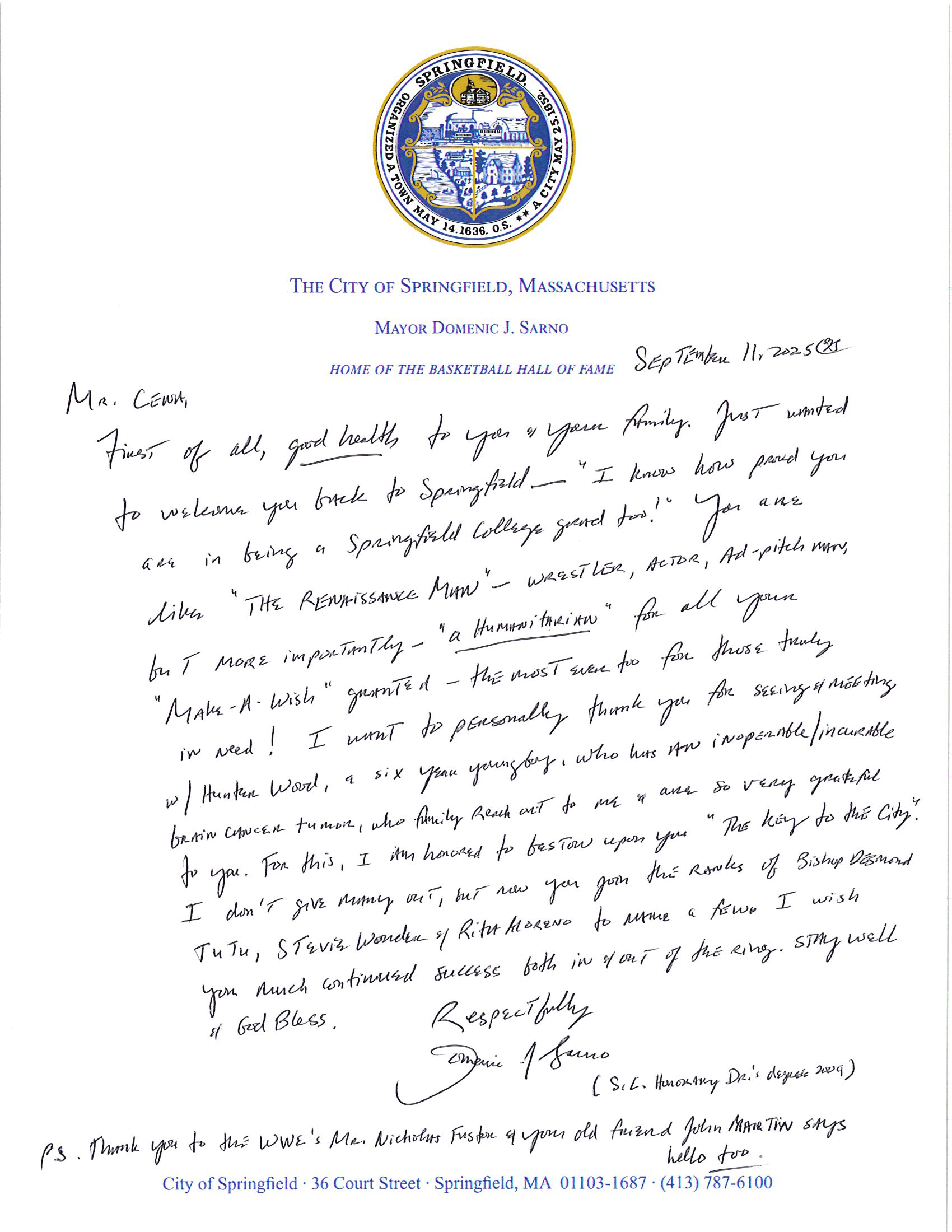 Mayor Sarno states, “We are thrilled to welcome World Wrestling Entertainment (WWE) to Springfield for their WWE Monday Night Raw show at the MassMutual Center tonight. There is excitement in the air downtown as we prepare for an action-packed evening. This event is extra-special as Springfield College grad/WWE legend John Cena is returning to Springfield for tonight's show on his “Last Time is Now” tour. I know 17-time WWE world champion John Cena plays the ‘heel’ these days, but his work outside of the ring with Make-A-Wish as the #1 Wish Granter in history is remarkable and something we are all proud to celebrate. We are thrilled to welcome John back to Springfield for this exciting stop on the tour. To celebrate and thank him for his boundless kindness, I bestowed to John a Key to the City. John – from wrestler, actor, ad-pitch man, and more importantly, Humanitarian – you are like ‘the Renaissance Man.’ On behalf of the City of Springfield, I commend you for your efforts to brighten the days of those truly in need. Thank you! Good health and God Bless.”