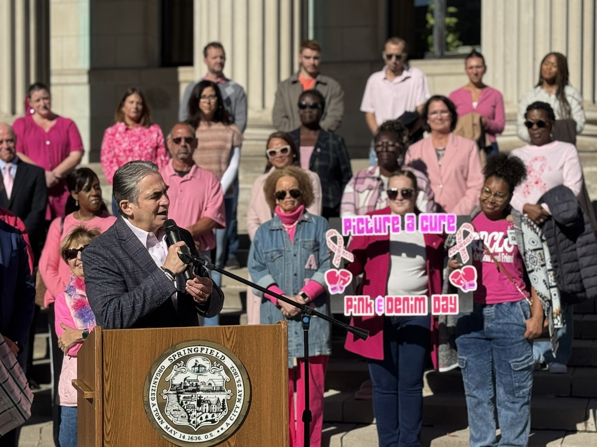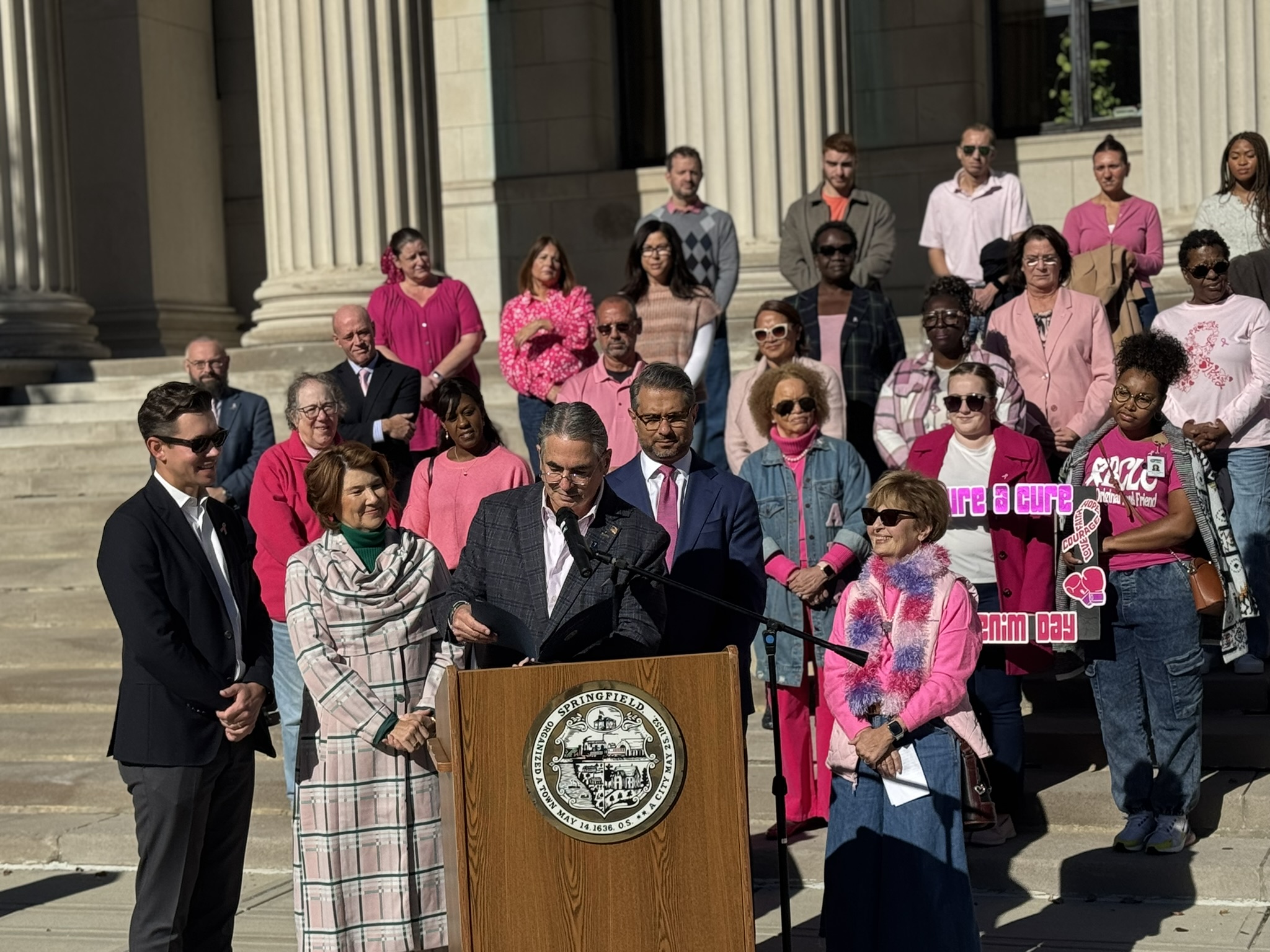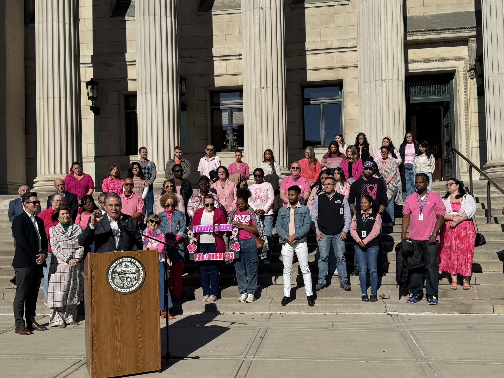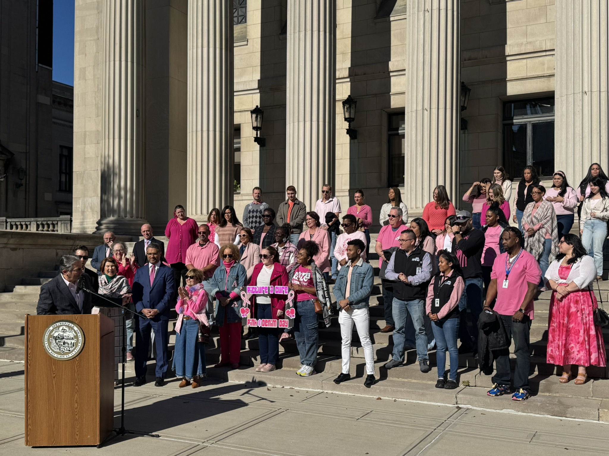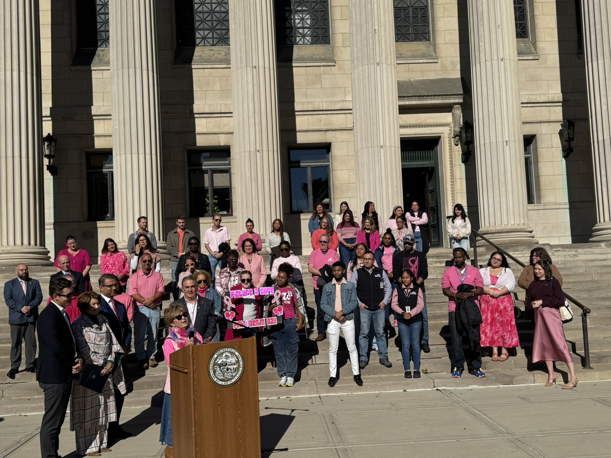 Mayor Domenic J. Sarno and City of Springfield and Springfield Public Schools - Massachusetts employees joined today to recognize and support Breast Cancer Awareness Month and the Rays of Hope with their annual “Pink & Denim Day” fundraising event on Thursday. The Pink & Denim Day event takes place each year ahead of the annual Rays of Hope - Walk & Run Toward the Cure of Breast Cancer taking place this Sunday, October 19, 2025.