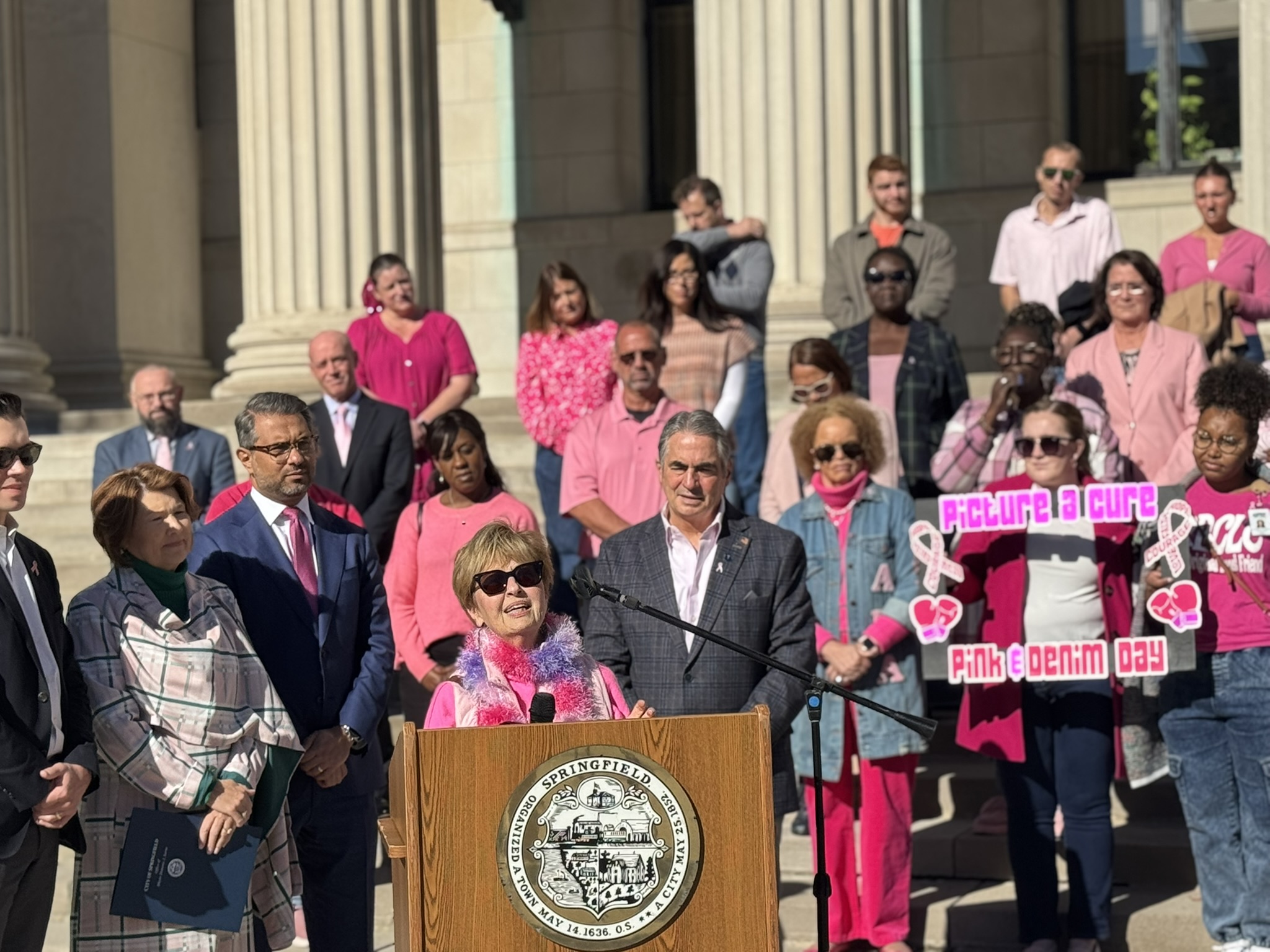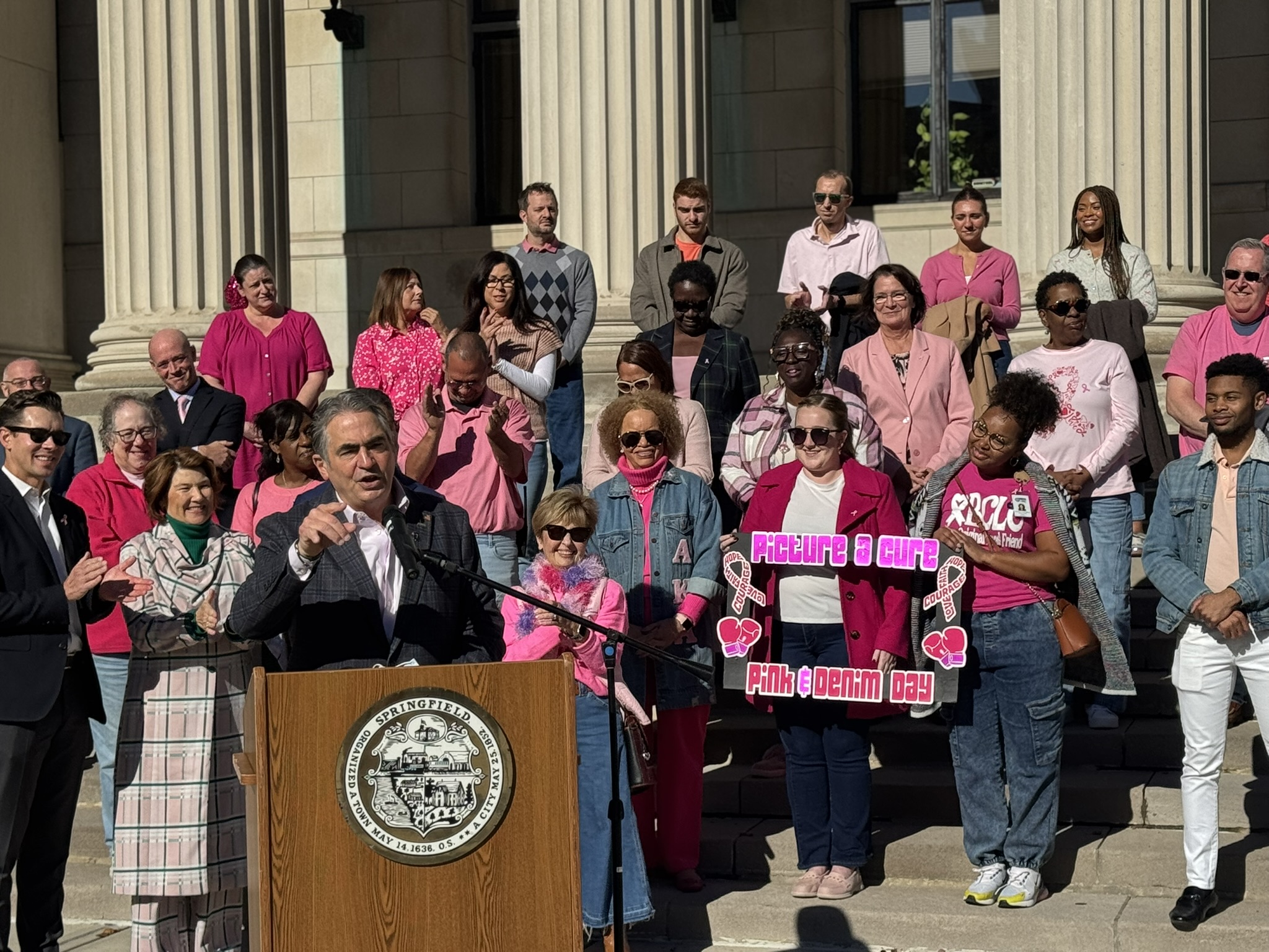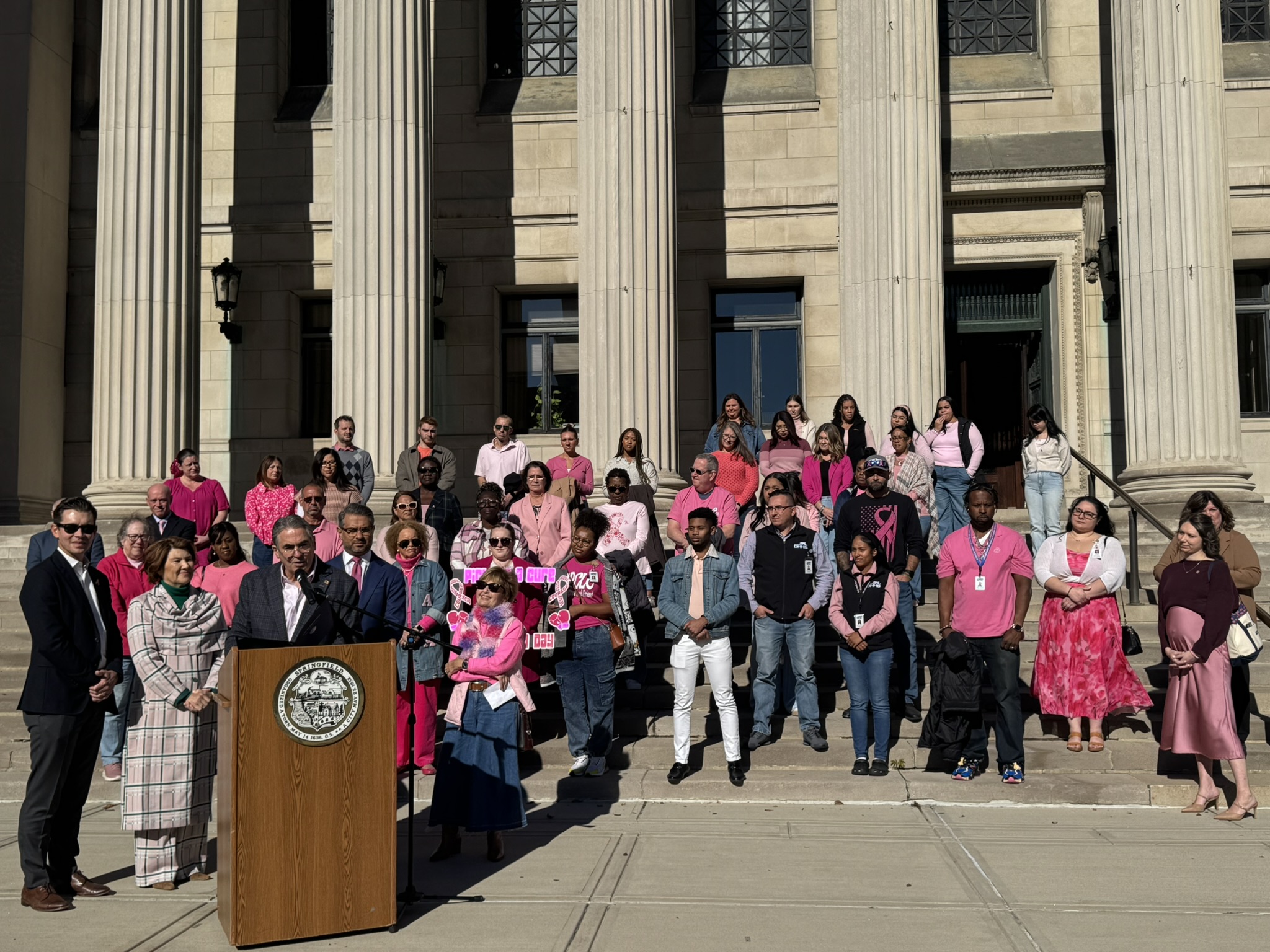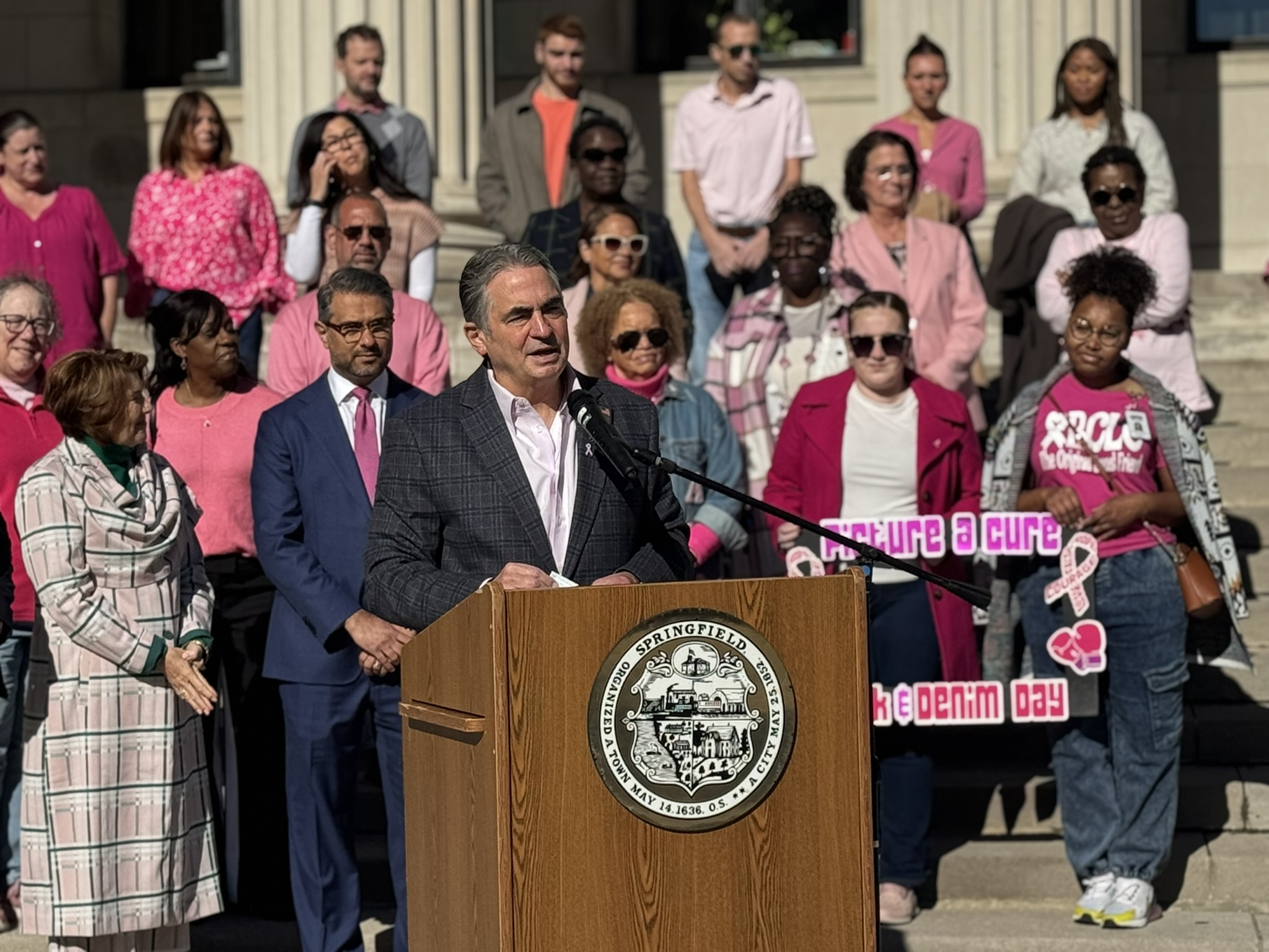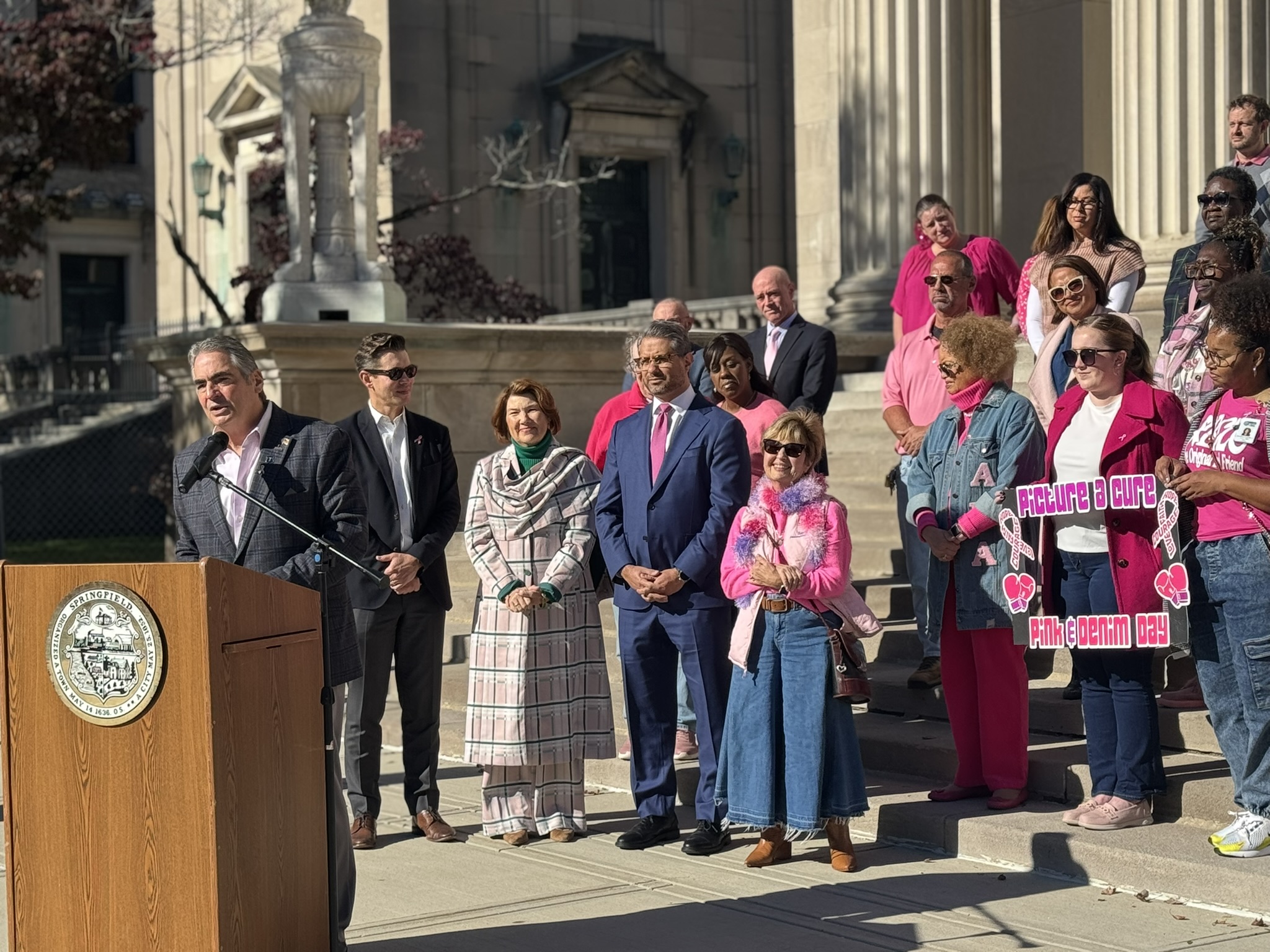 Mayor Domenic J. Sarno and City of Springfield and Springfield Public Schools - Massachusetts employees joined today to recognize and support Breast Cancer Awareness Month and the Rays of Hope with their annual “Pink & Denim Day” fundraising event on Thursday. The Pink & Denim Day event takes place each year ahead of the annual Rays of Hope - Walk & Run Toward the Cure of Breast Cancer taking place this Sunday, October 19, 2025.