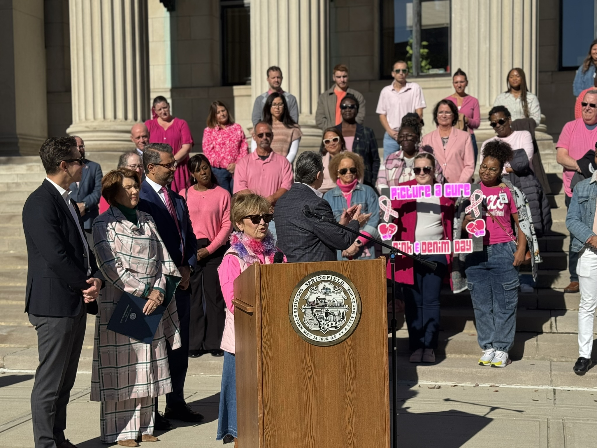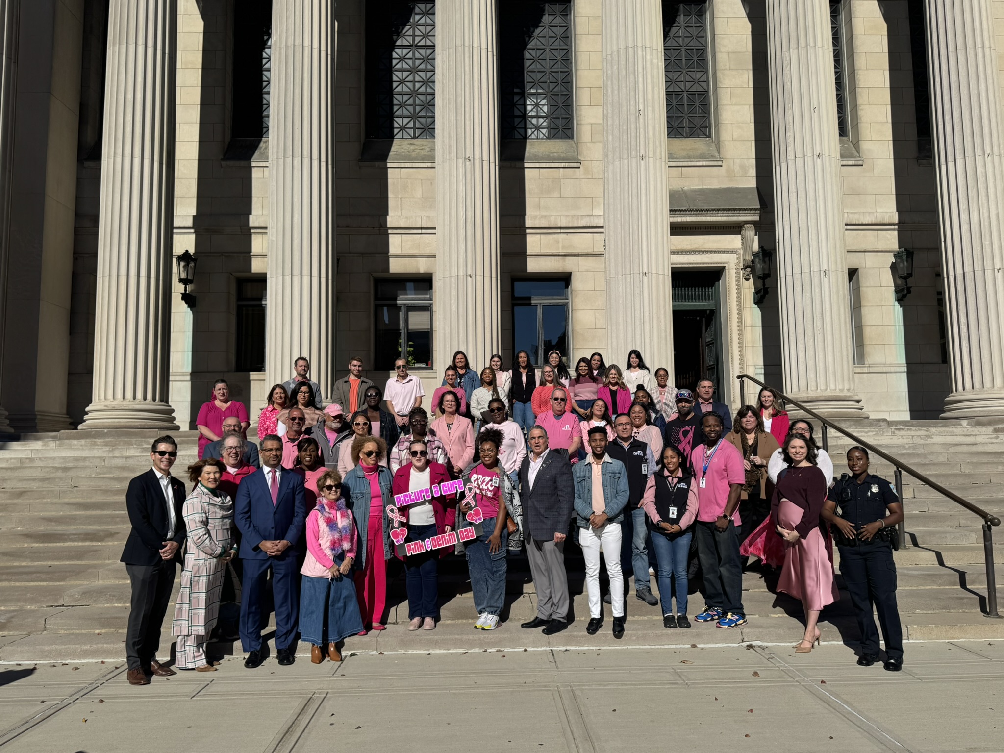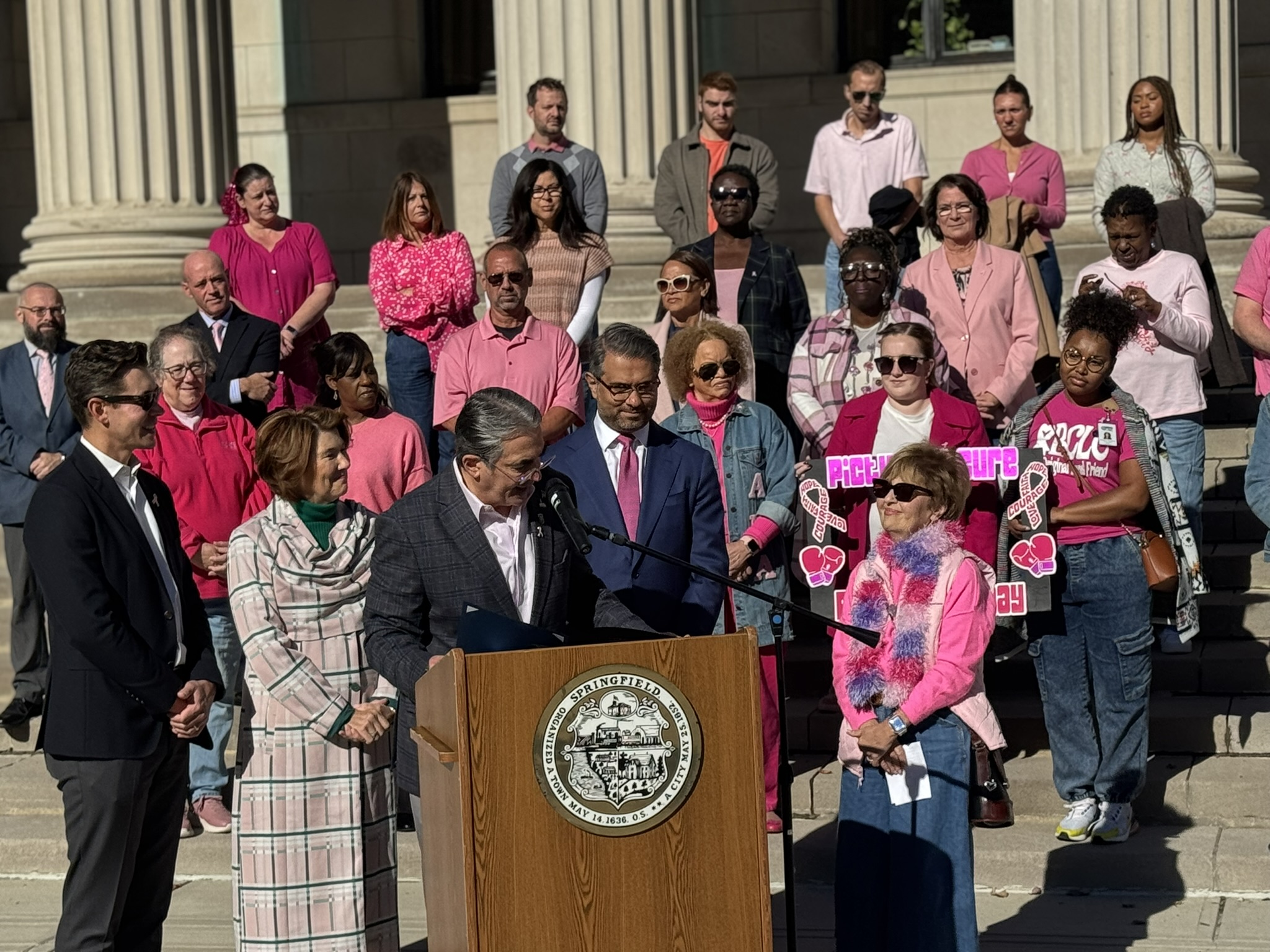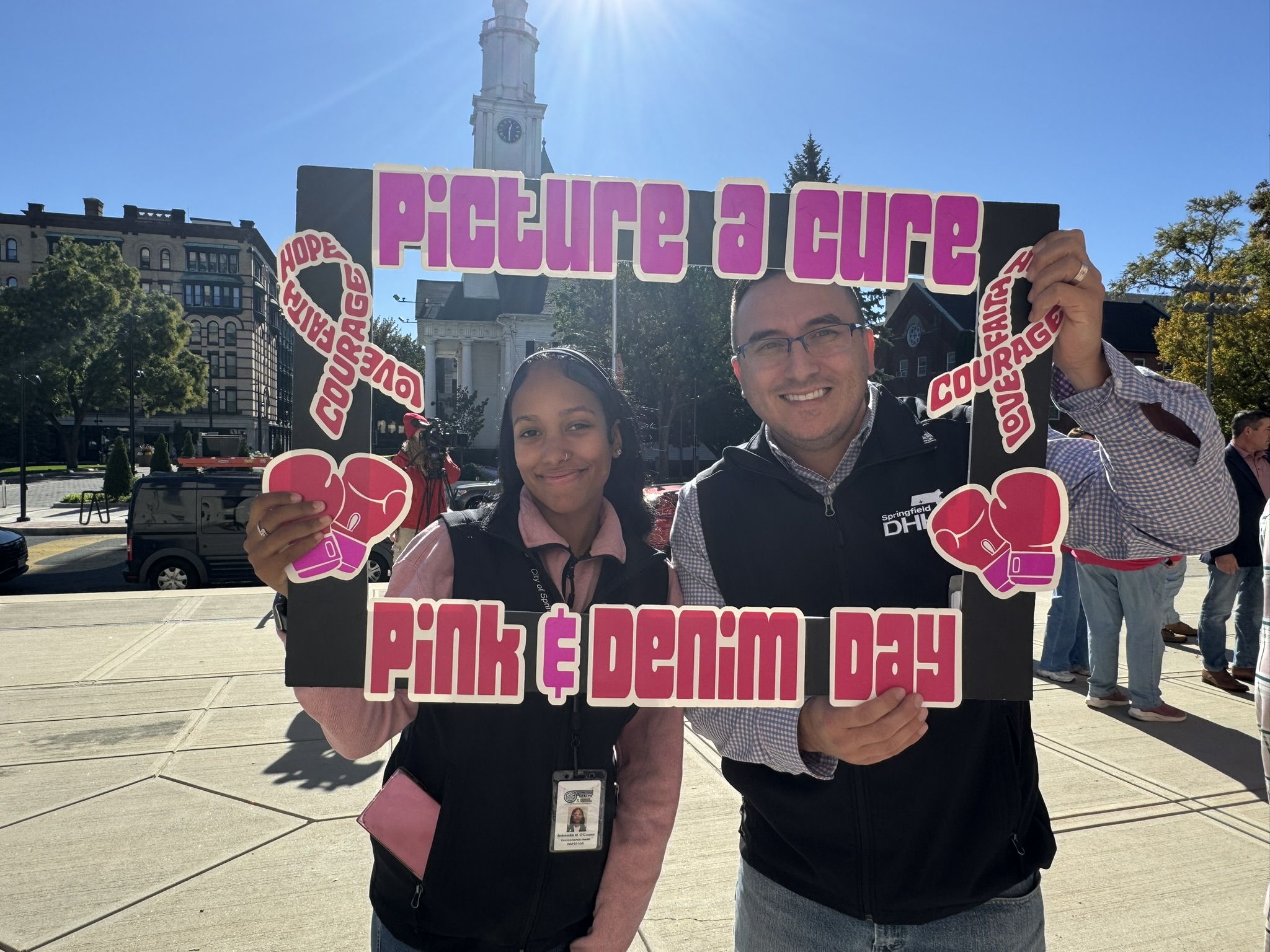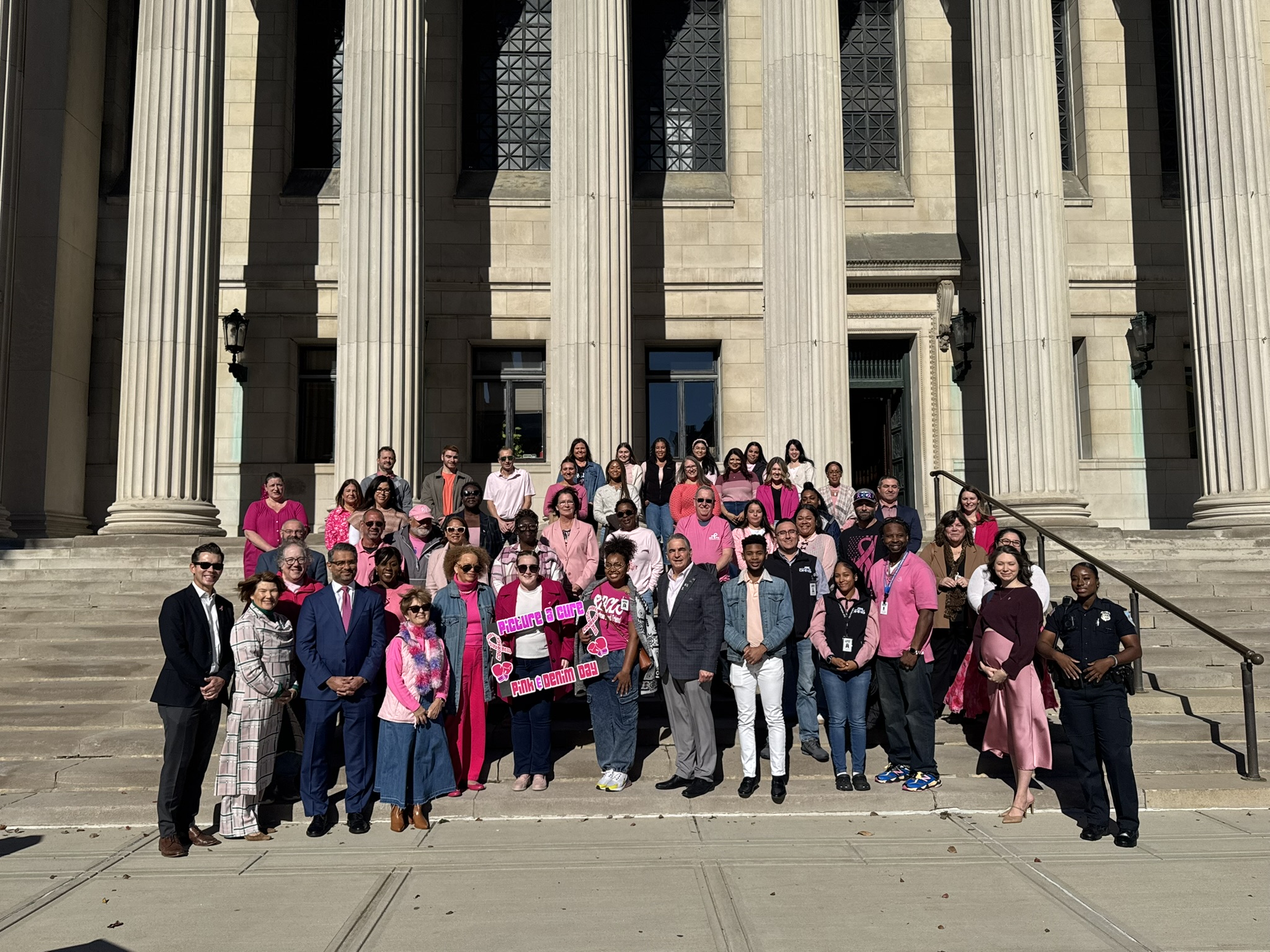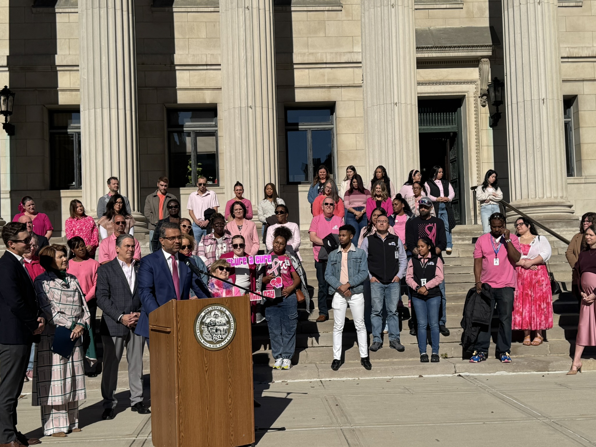 Mayor Domenic J. Sarno and City of Springfield and Springfield Public Schools - Massachusetts employees joined today to recognize and support Breast Cancer Awareness Month and the Rays of Hope with their annual “Pink & Denim Day” fundraising event on Thursday. The Pink & Denim Day event takes place each year ahead of the annual Rays of Hope - Walk & Run Toward the Cure of Breast Cancer taking place this Sunday, October 19, 2025.