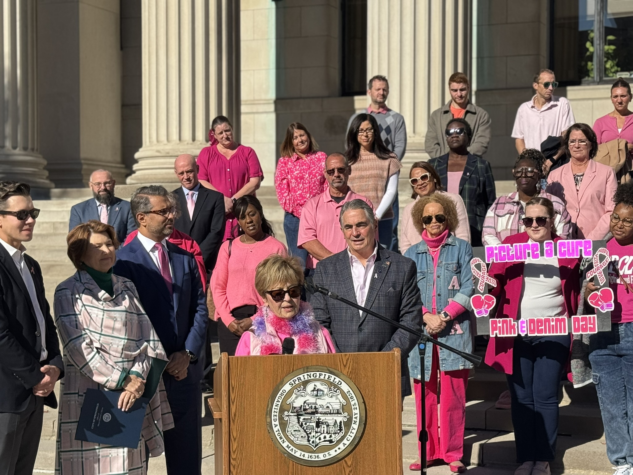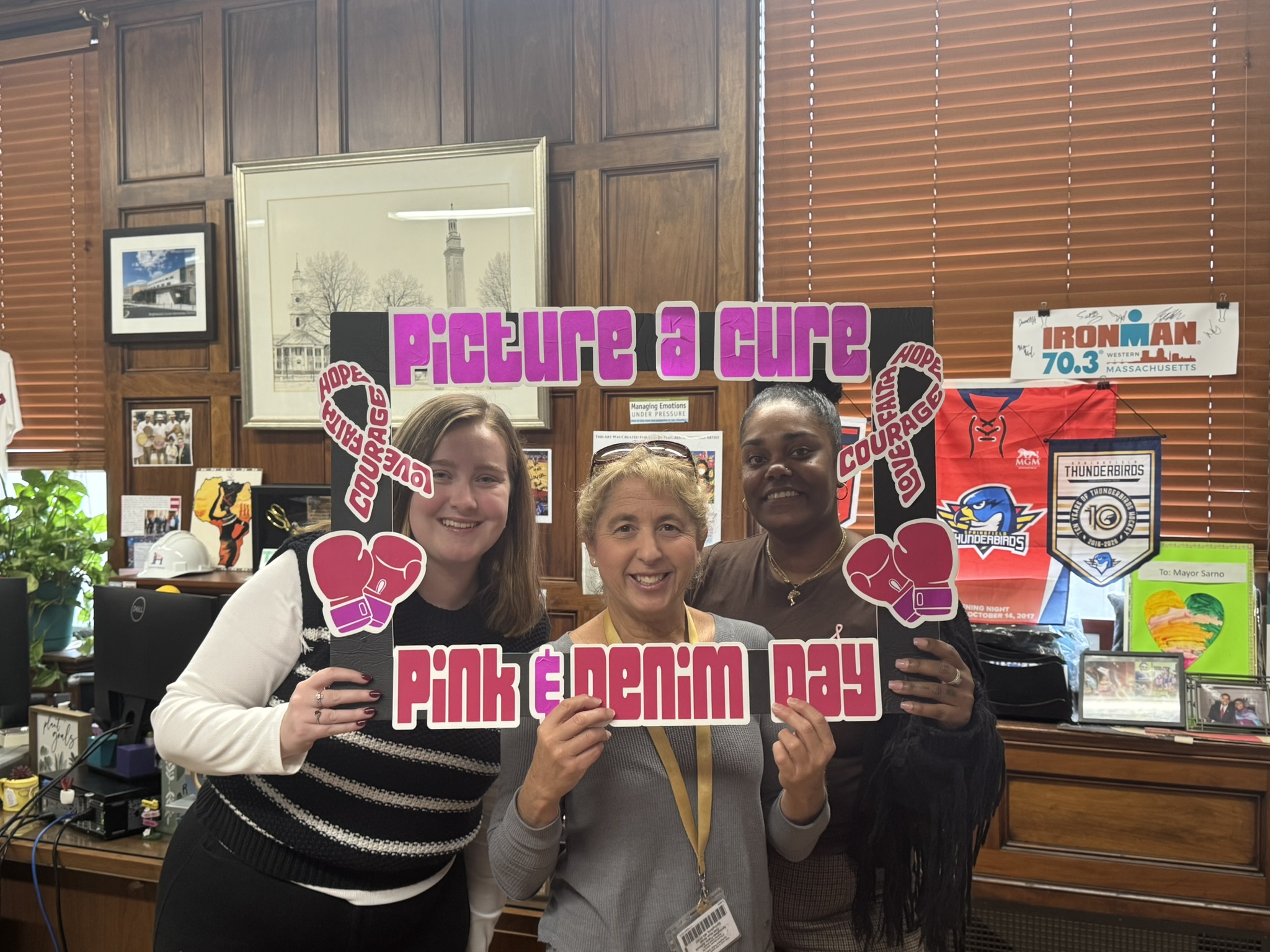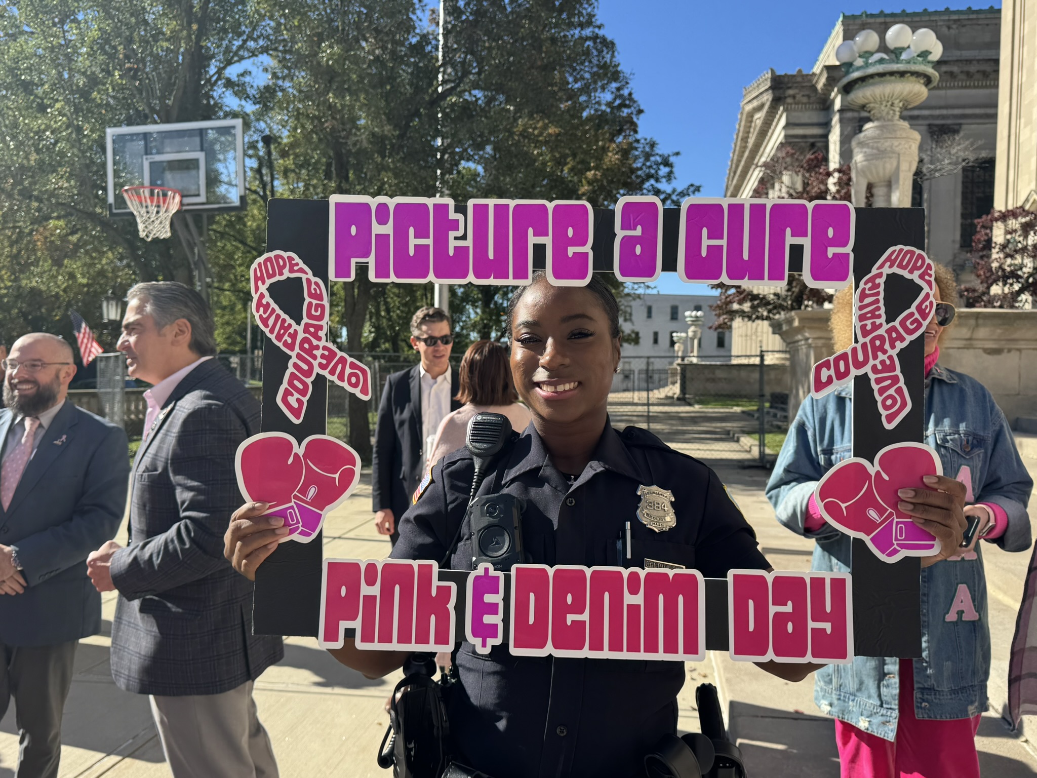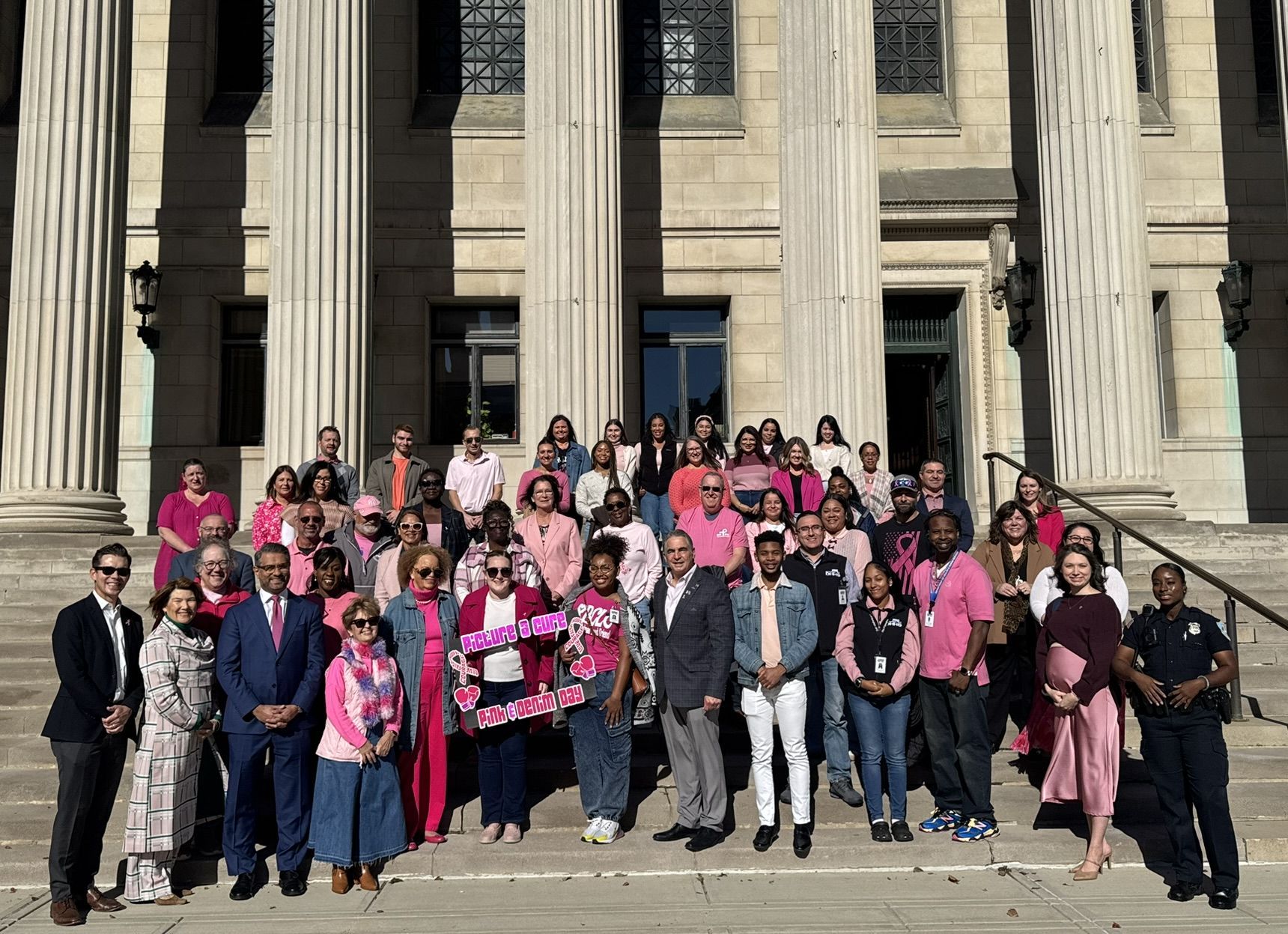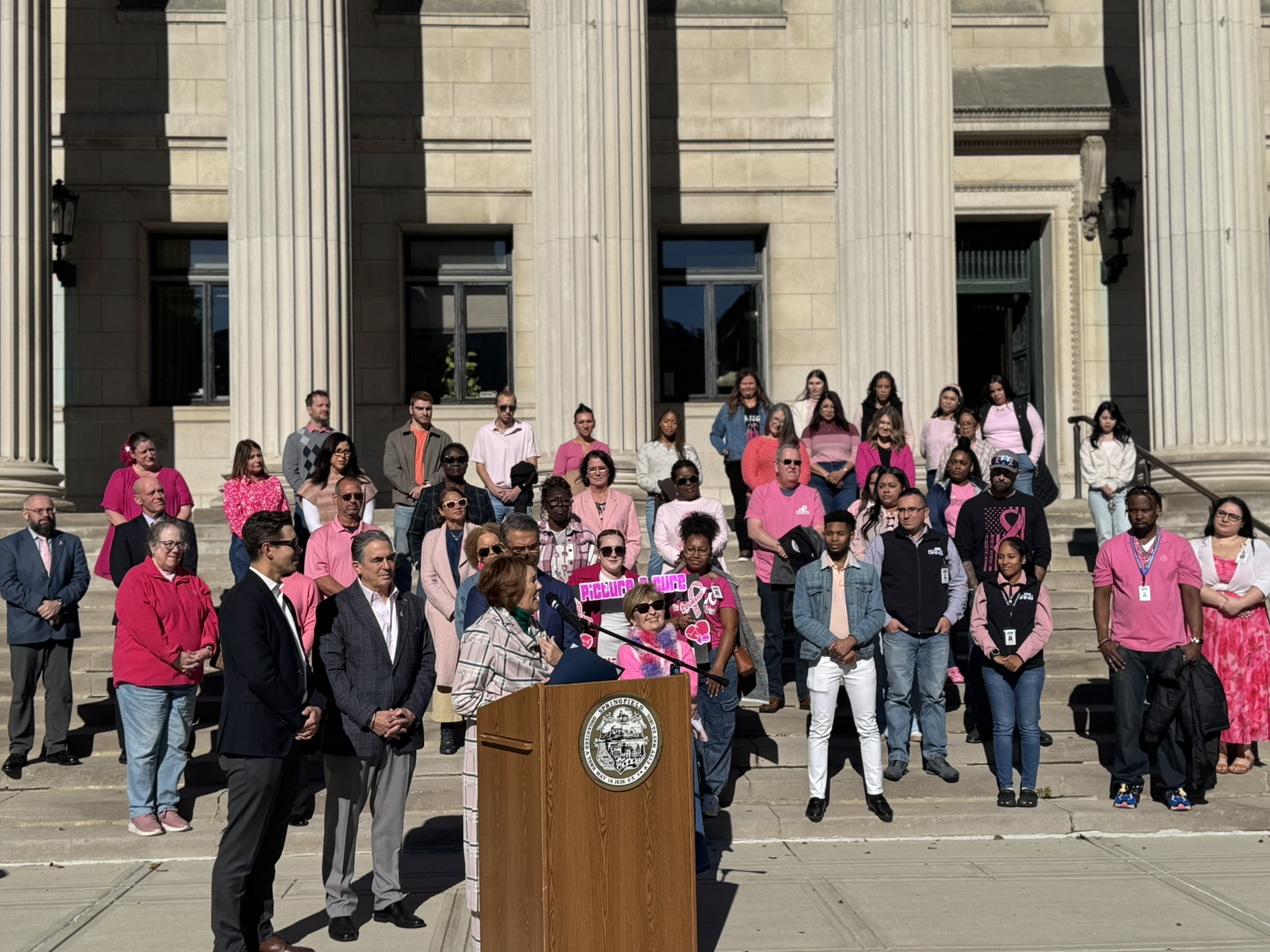 Mayor Domenic J. Sarno and City of Springfield and Springfield Public Schools - Massachusetts employees joined today to recognize and support Breast Cancer Awareness Month and the Rays of Hope with their annual “Pink & Denim Day” fundraising event on Thursday. The Pink & Denim Day event takes place each year ahead of the annual Rays of Hope - Walk & Run Toward the Cure of Breast Cancer taking place this Sunday, October 19, 2025.