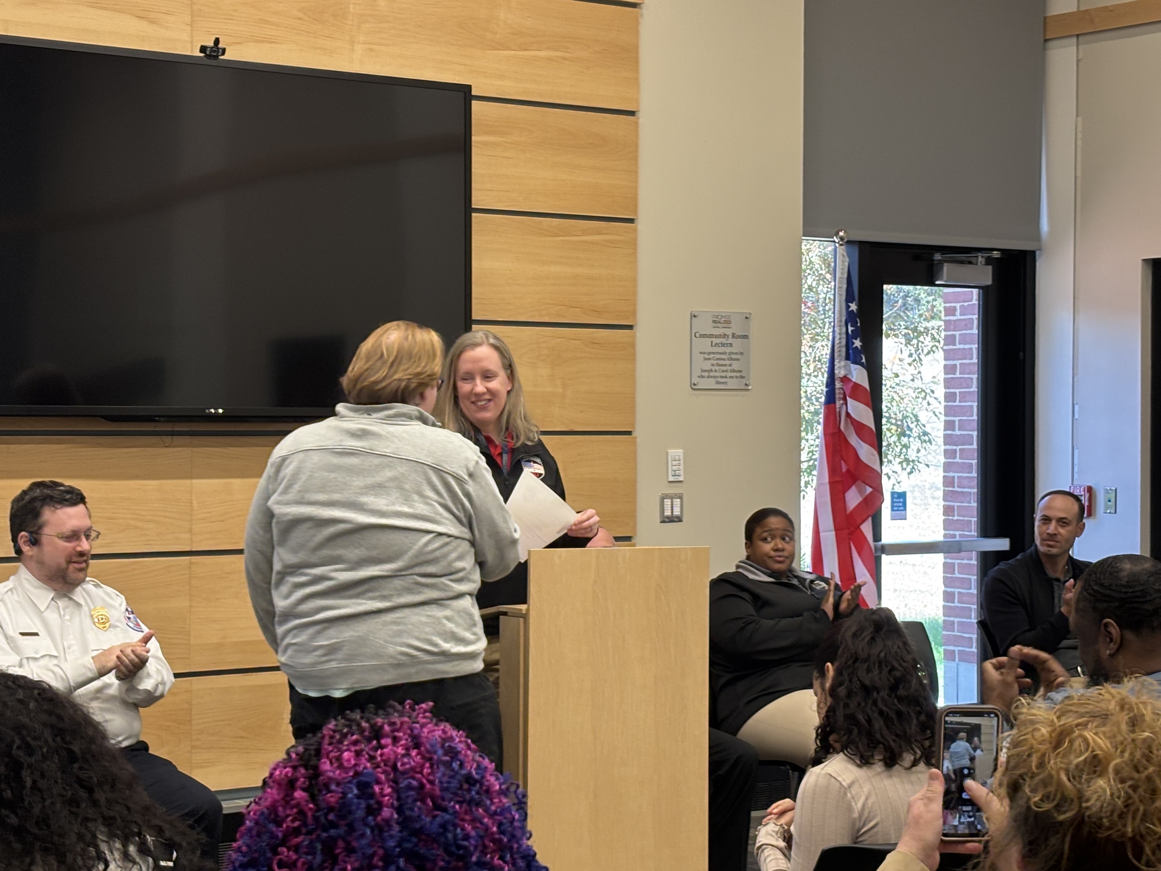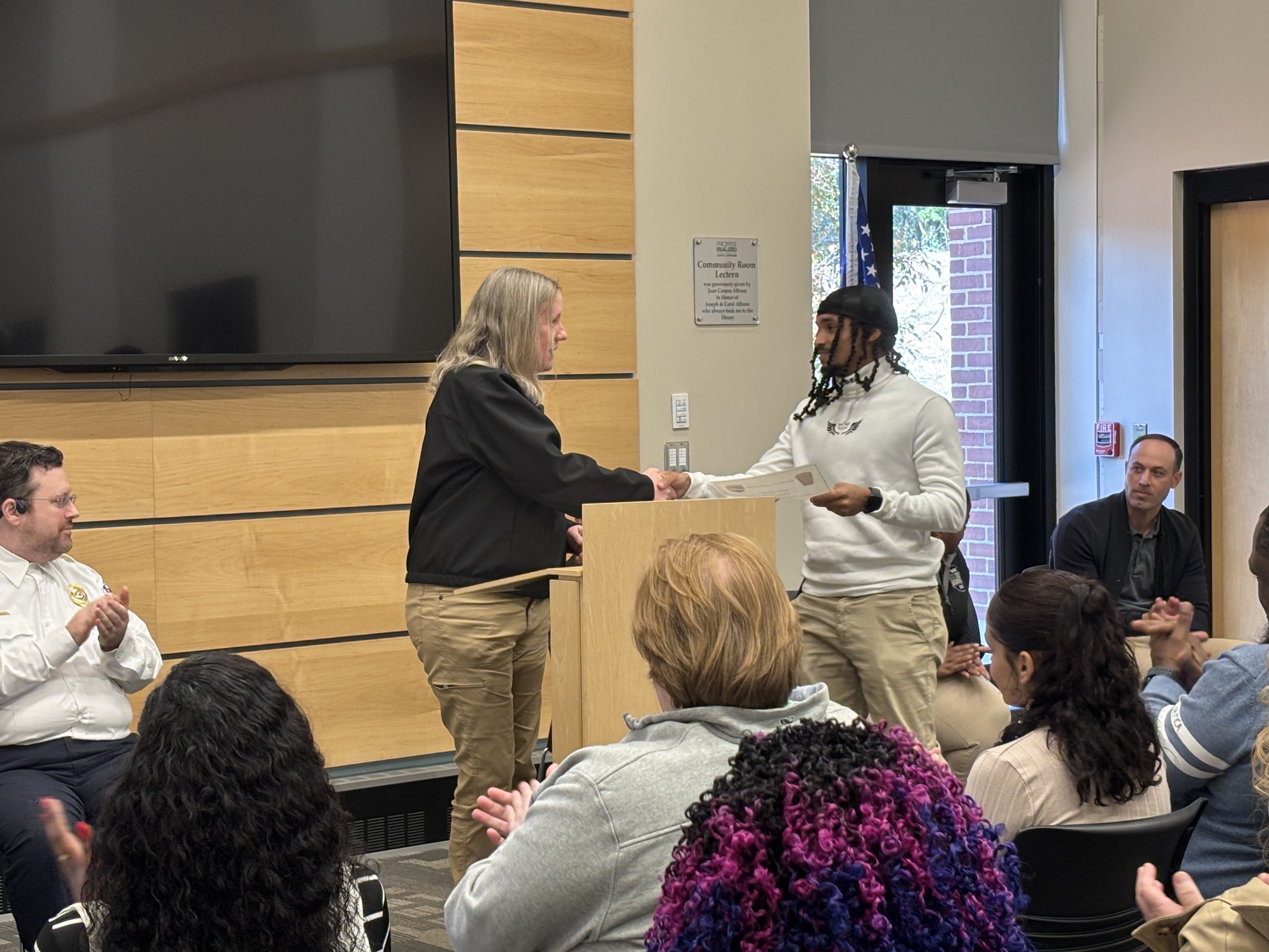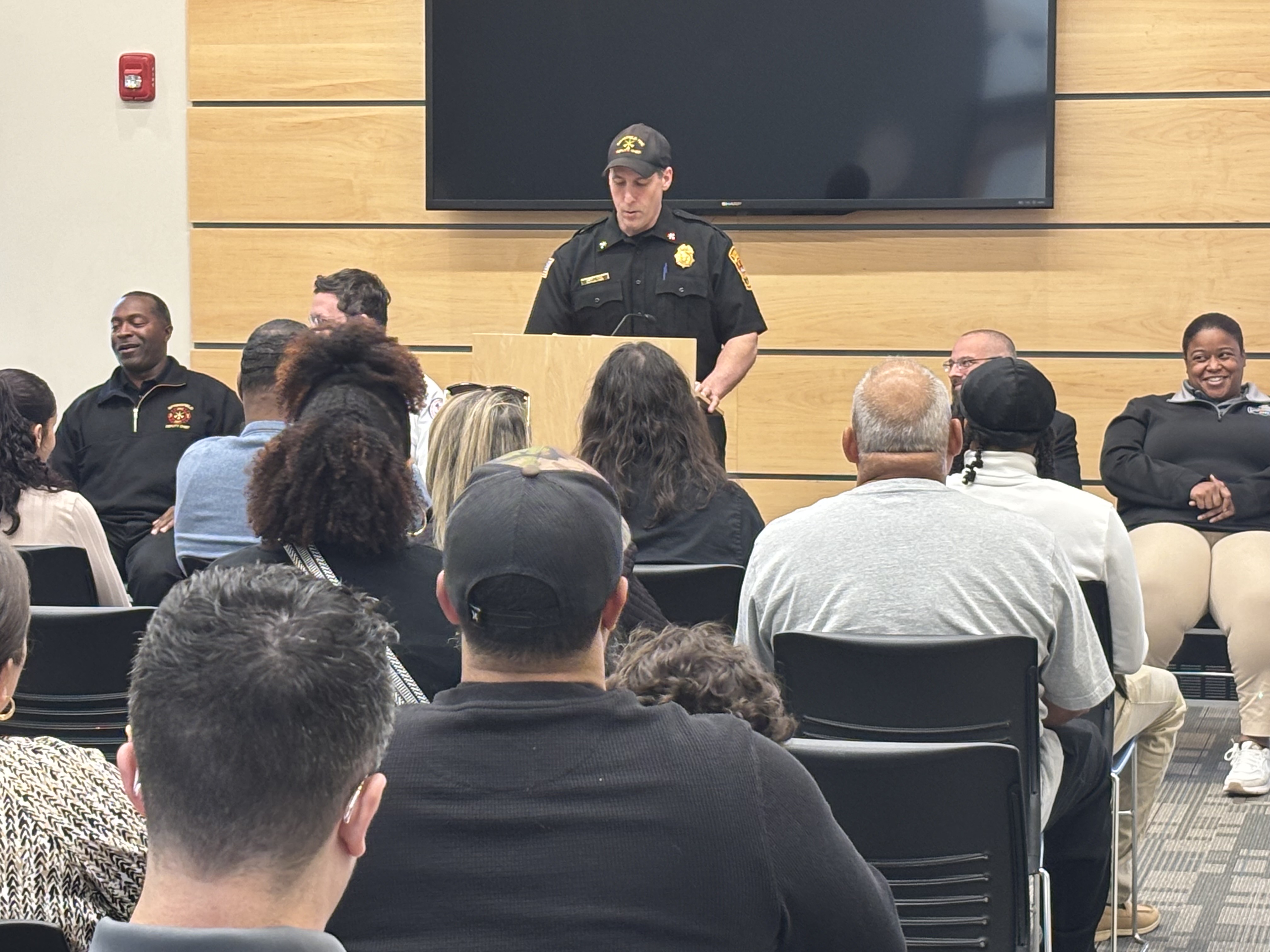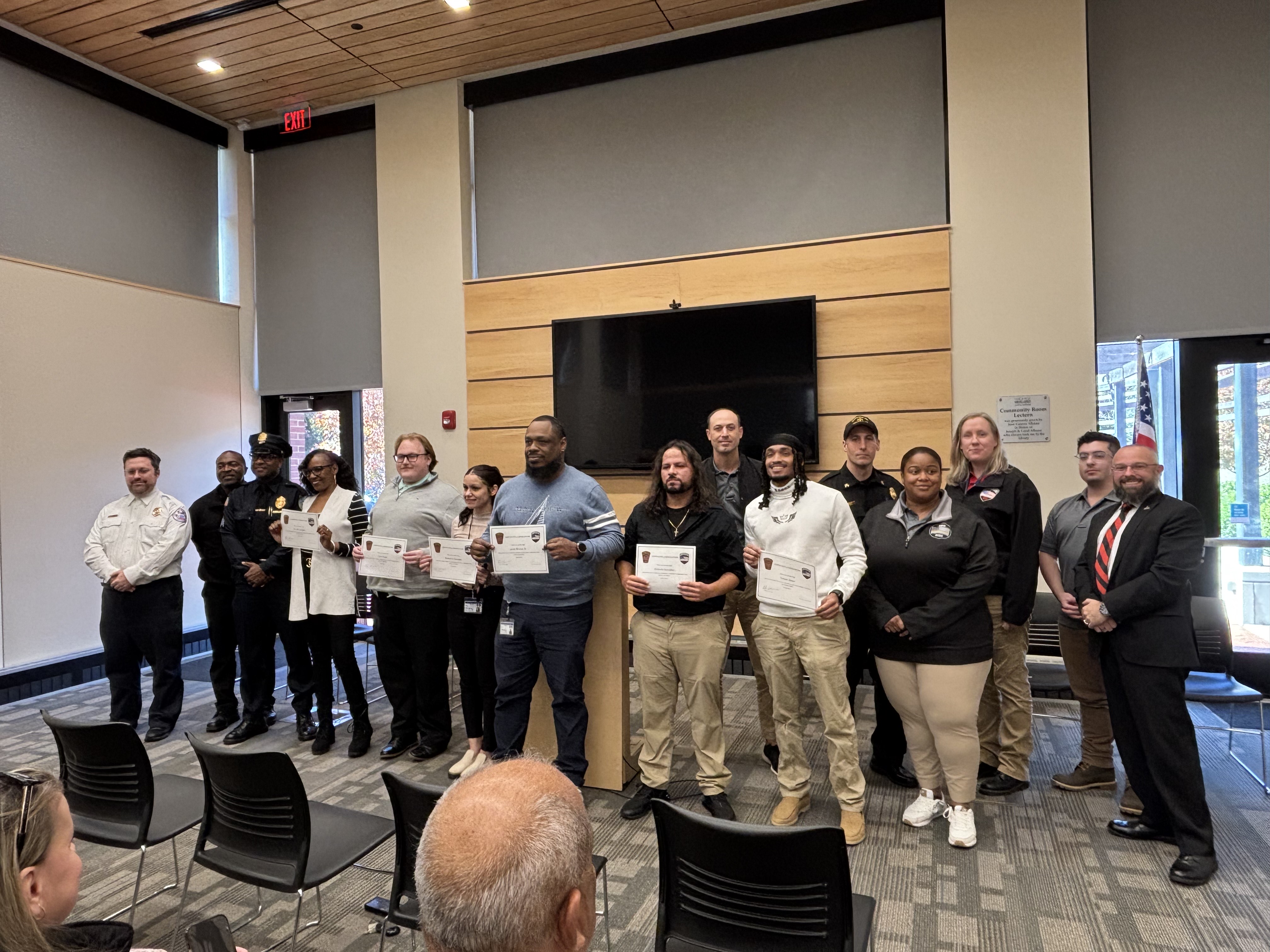 Chief of Staff Bill Baker, on behalf of Mayor Domenic J. Sarno, joined the Springfield Fire and Emergency Communications team today to congratulate the seven new Springfield Fire Department Emergency Communications Dispatch graduates at a special ceremony at the East Forest Park Library. Deputy Fire Chief Mike Hess, Deputy Fire Chief Tyrone Denson, 911 Dispatch Deputy Rebecca Ocasio, Police Sargent Orette Ho Sang, Tim Cunningham from AMR, and Jillian Madison-Wilson, who helps train new dispatchers, also joined. Orlando Gonzalez, spoke on behalf of the class of graduates.