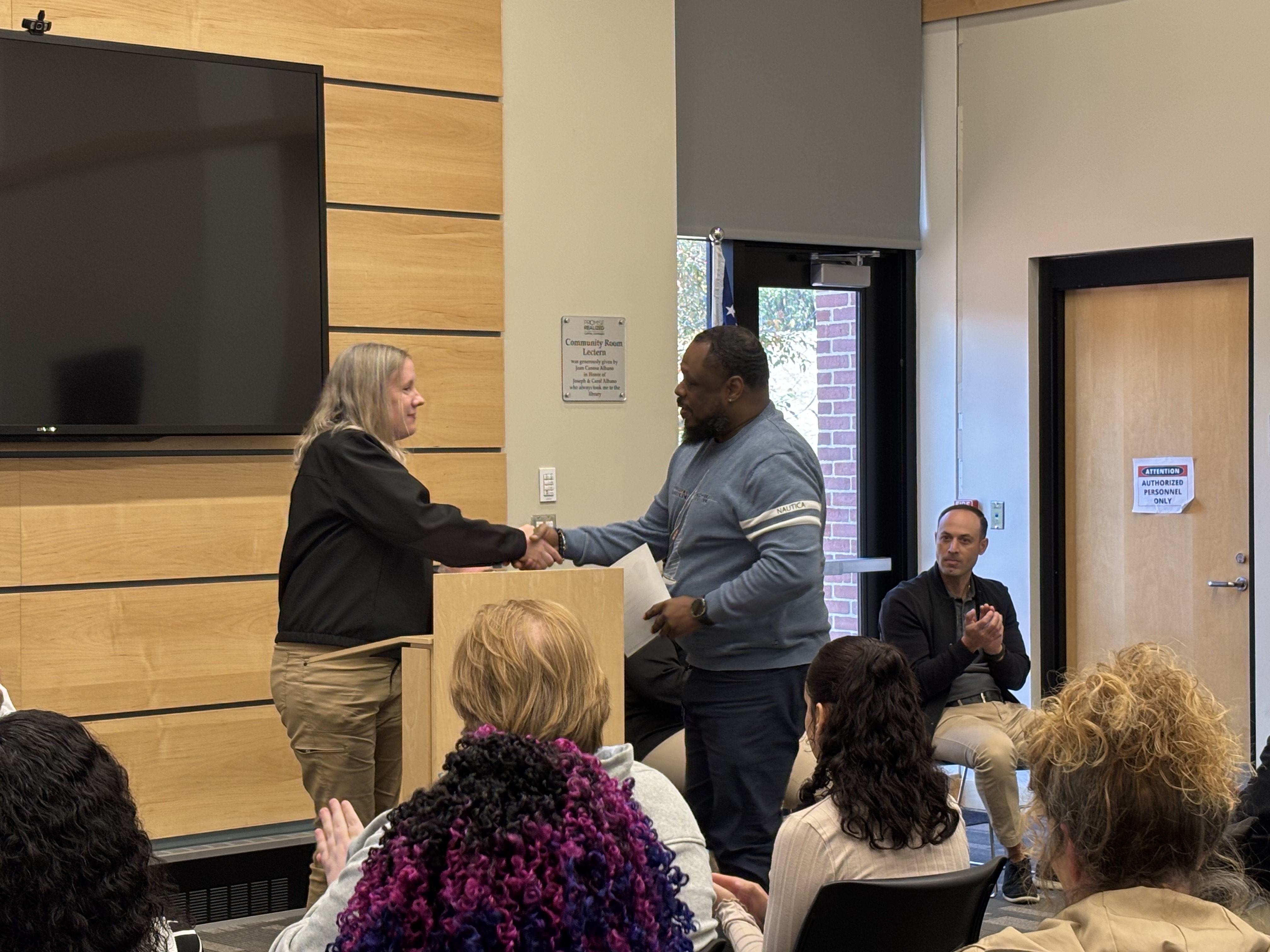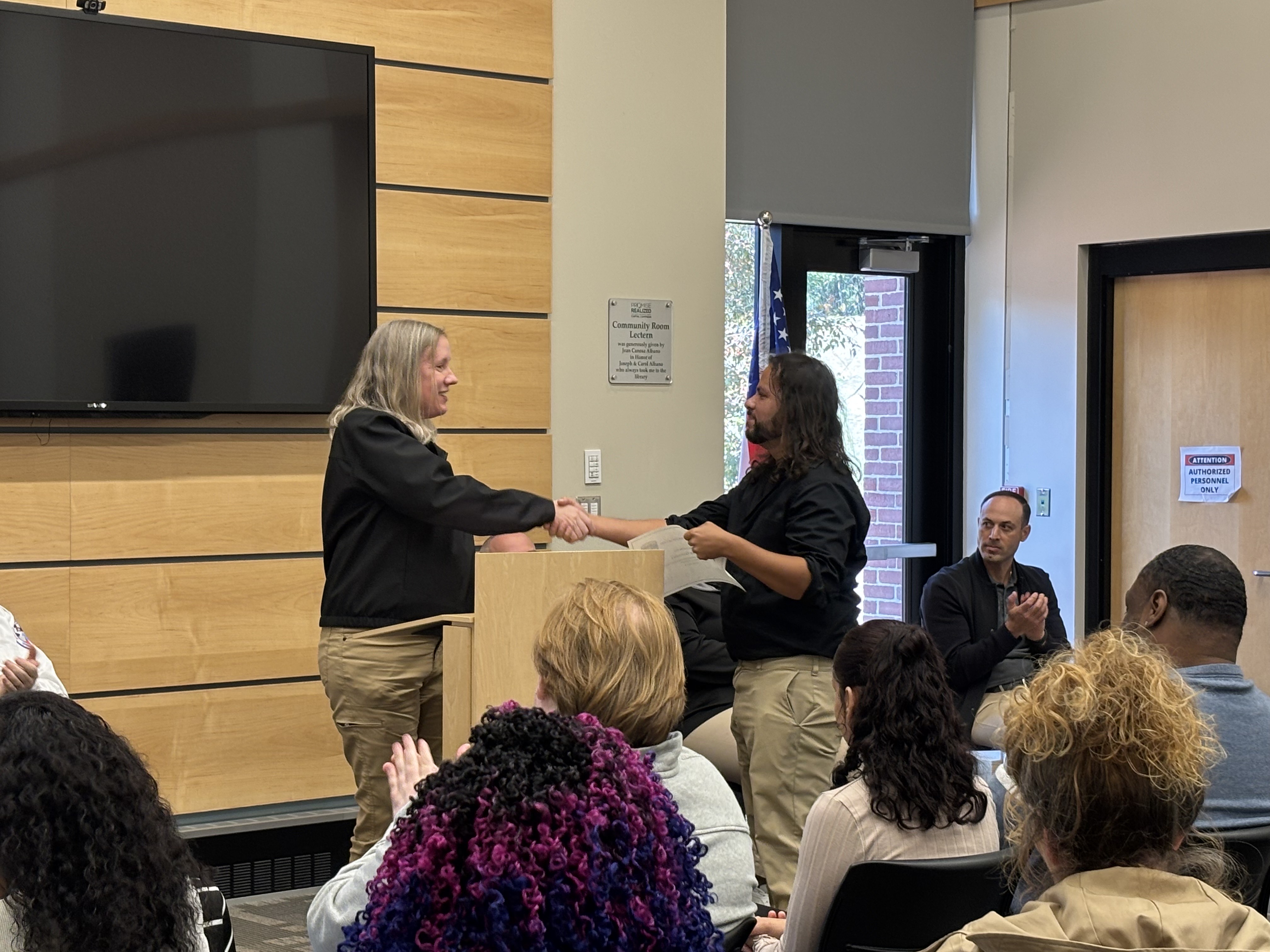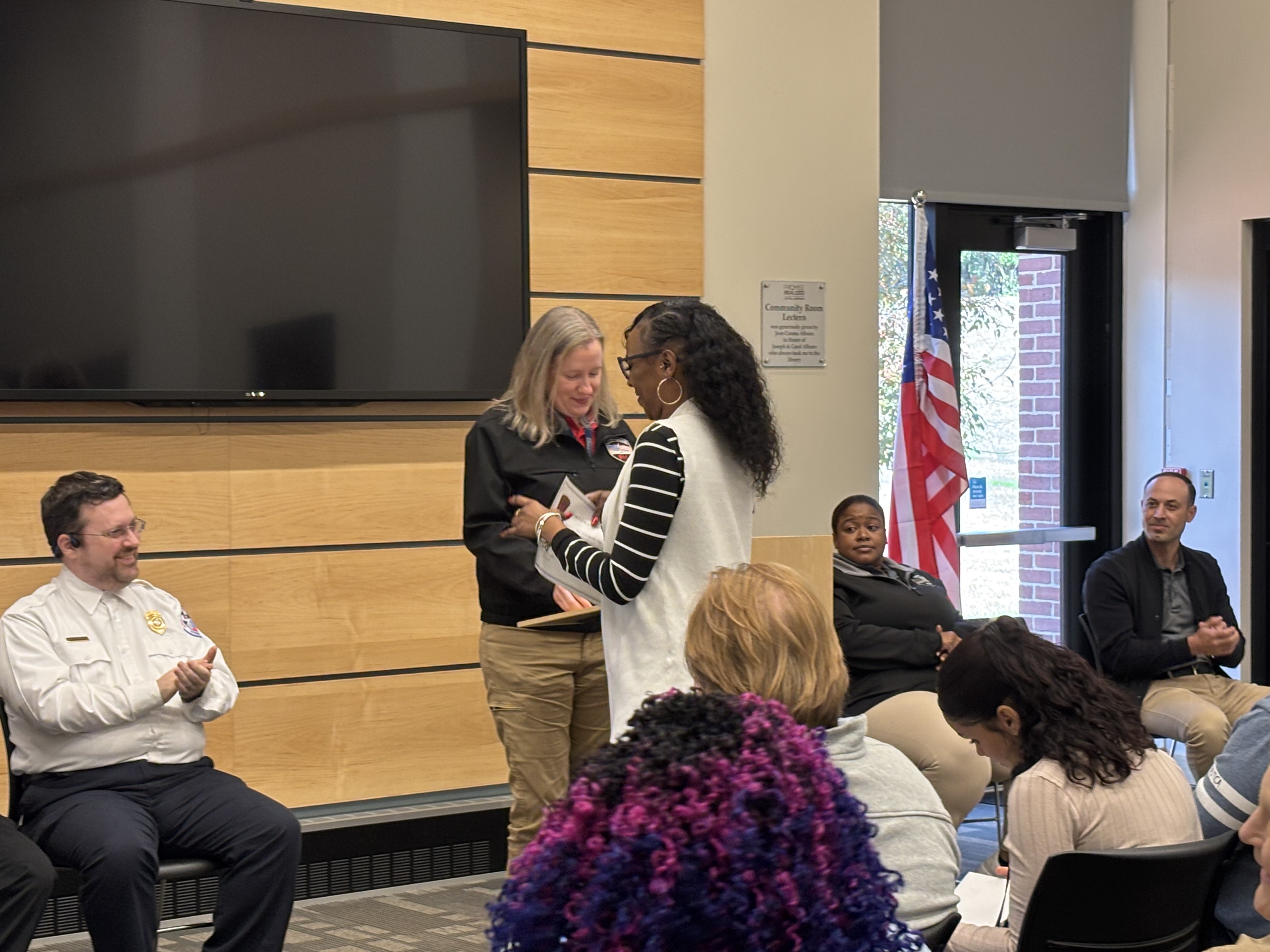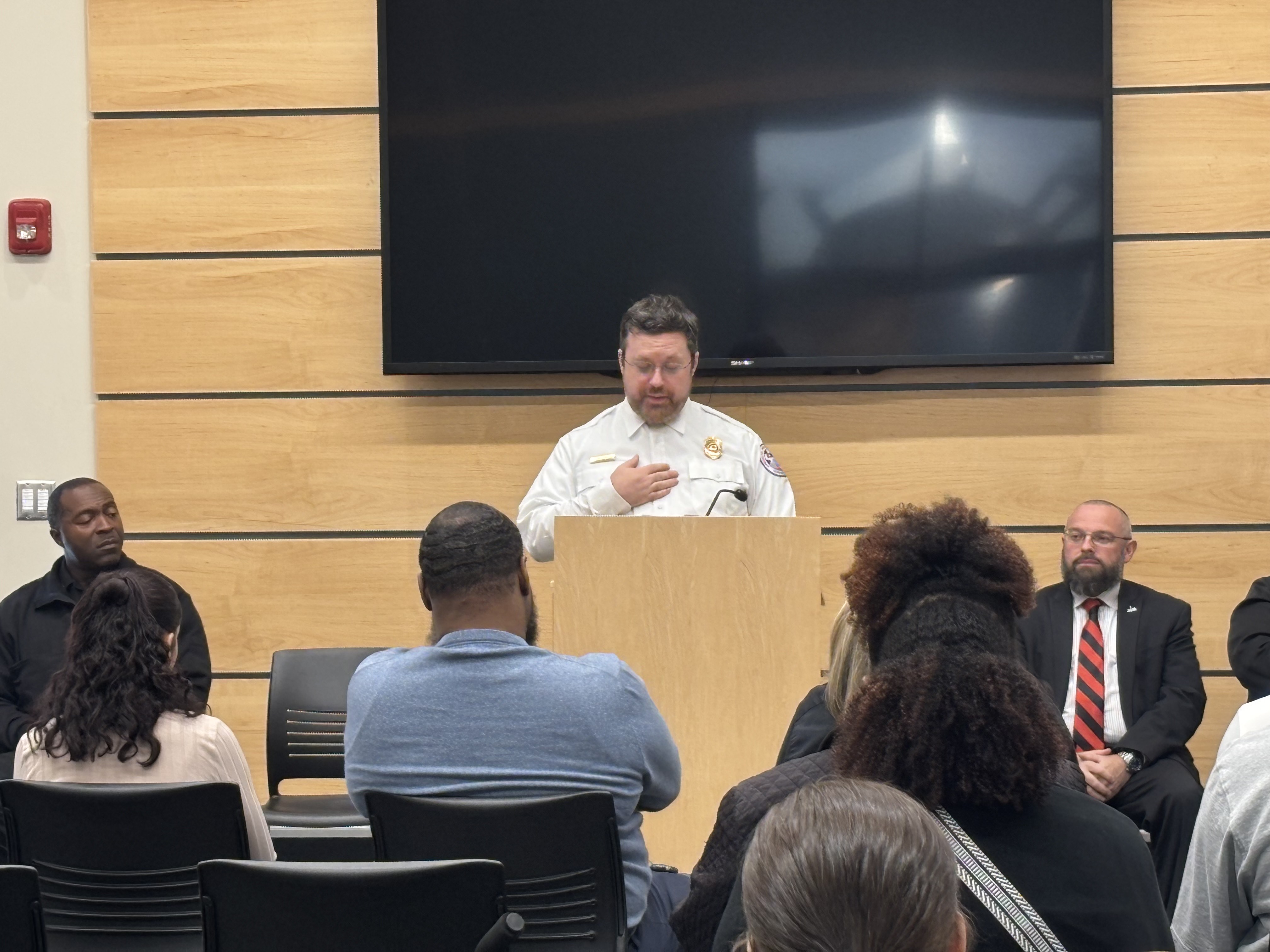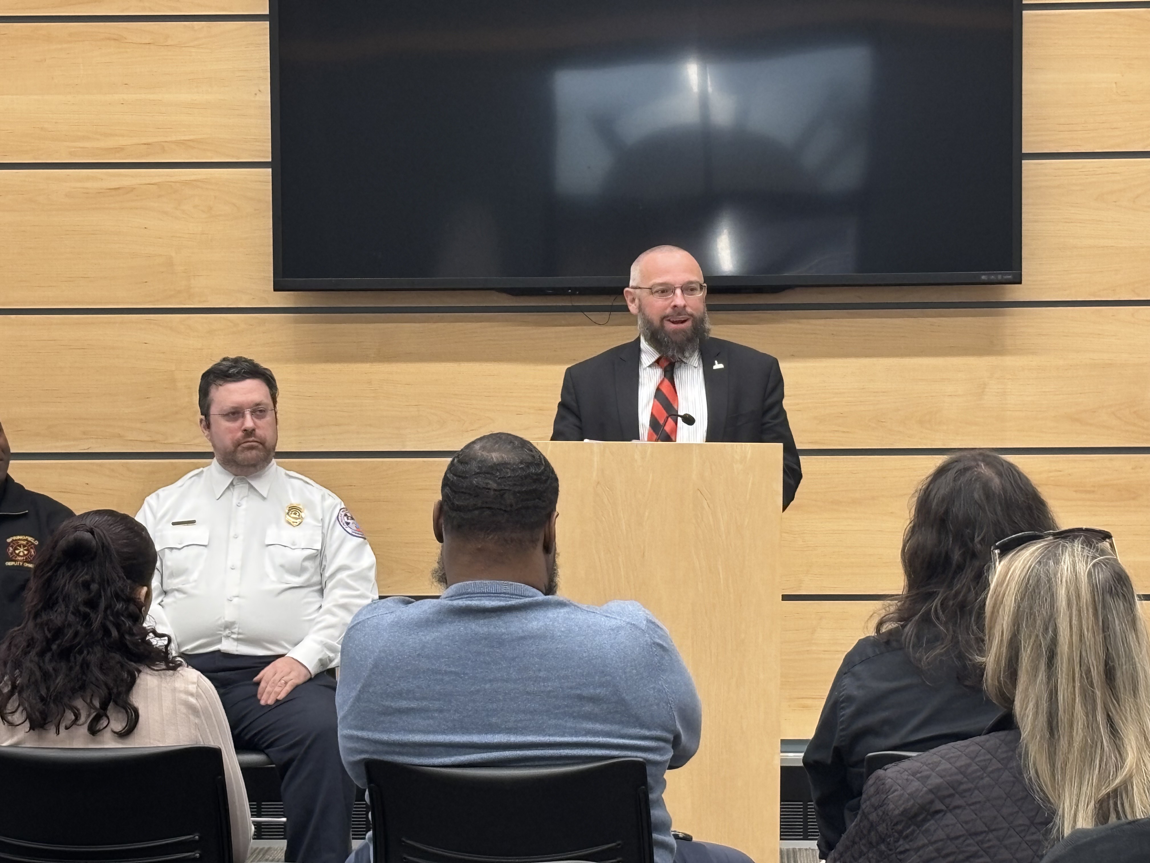 Chief of Staff Bill Baker, on behalf of Mayor Domenic J. Sarno, joined the Springfield Fire and Emergency Communications team today to congratulate the seven new Springfield Fire Department Emergency Communications Dispatch graduates at a special ceremony at the East Forest Park Library. Deputy Fire Chief Mike Hess, Deputy Fire Chief Tyrone Denson, 911 Dispatch Deputy Rebecca Ocasio, Police Sargent Orette Ho Sang, Tim Cunningham from AMR, and Jillian Madison-Wilson, who helps train new dispatchers, also joined. Orlando Gonzalez, spoke on behalf of the class of graduates.