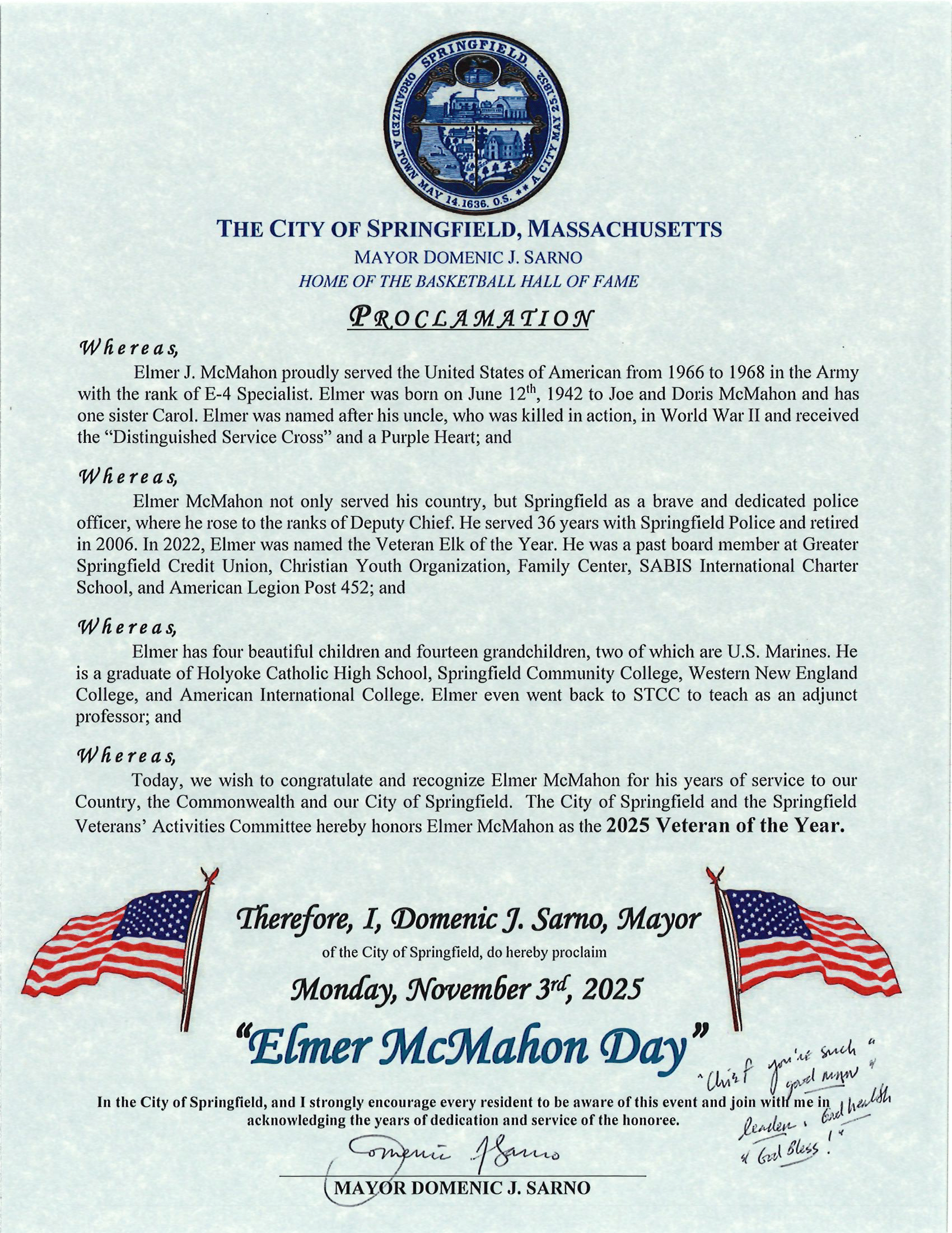 - United States Army Veteran, Elmer McMahon, as Springfield’s 2025 Veteran of the Year,