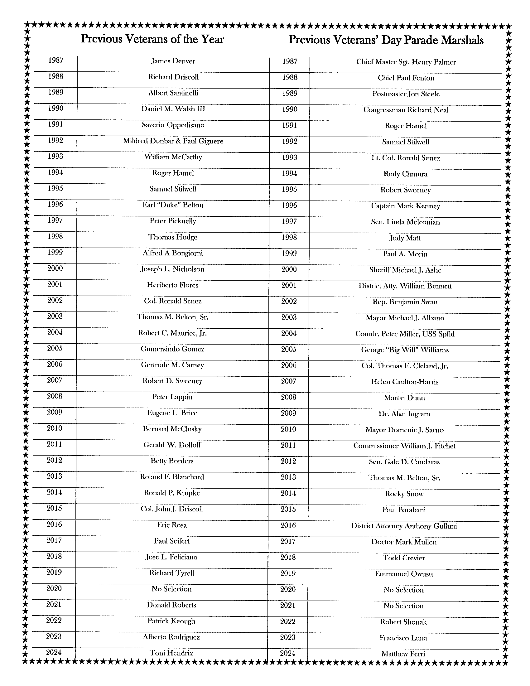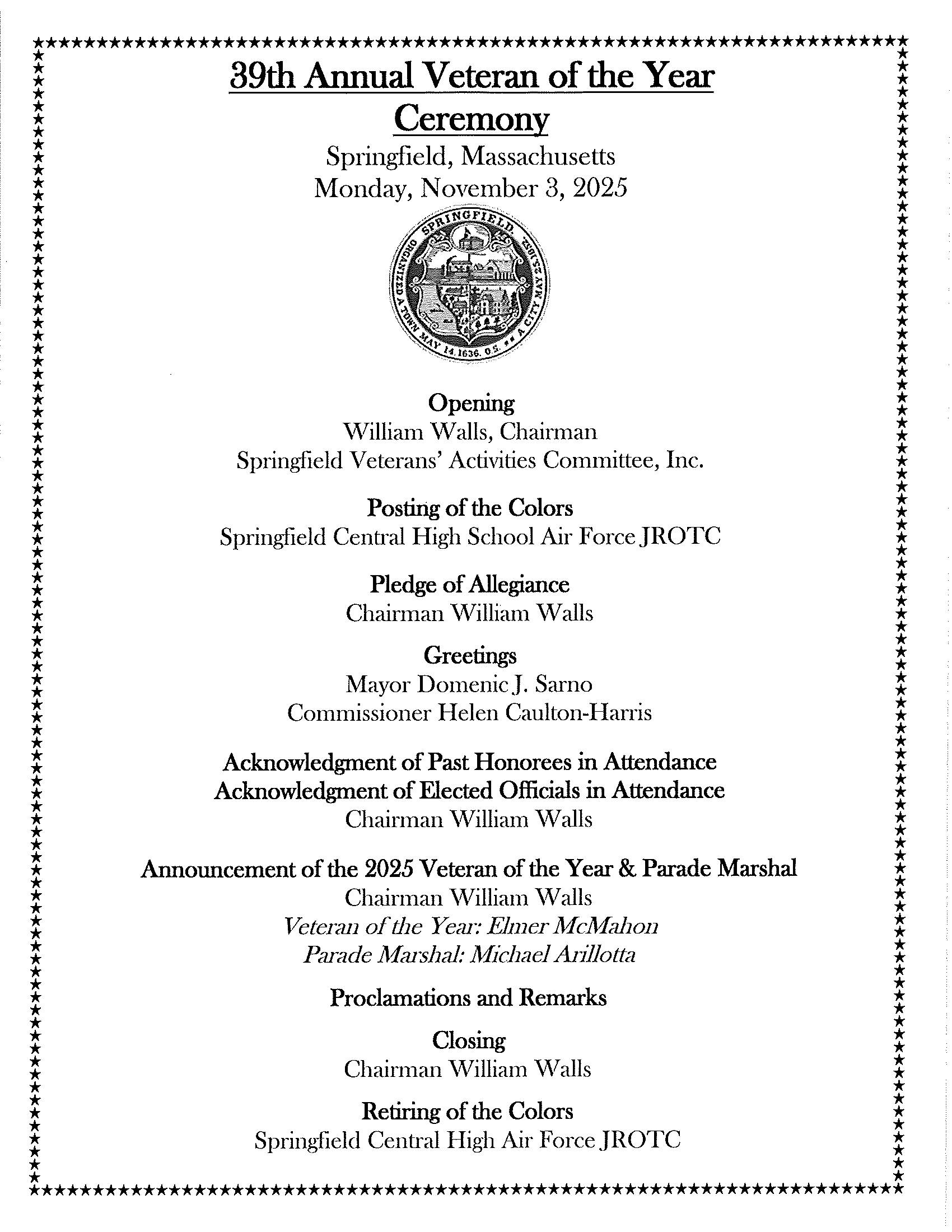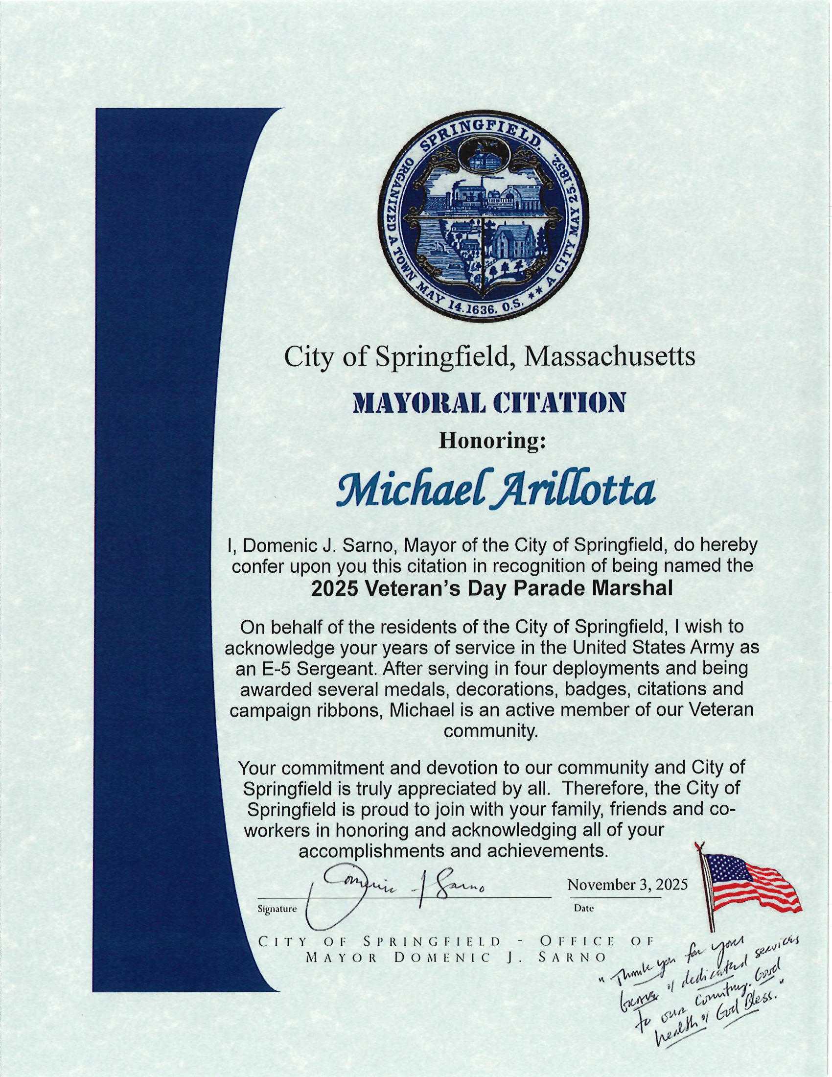 - And United States Army Veteran, Michael Arillotta, as Springfield’s 2025 Veterans’ Day Parade Marshal.