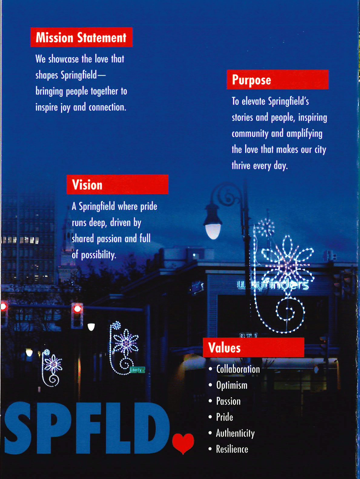 The Celebrate Springfield Committee’s Mission is to showcase the love that shapes Springfield—bringing people together to inspire joy and connection. The Vision is for a community where pride runs deep, driven by shared passion and full of possibility. The Purpose is to elevate Springfield’s stories and people, inspiring community and amplifying the love that makes the city thrive every day. The Values are collaboration, optimism, passion, pride, authenticity, and resilience.
