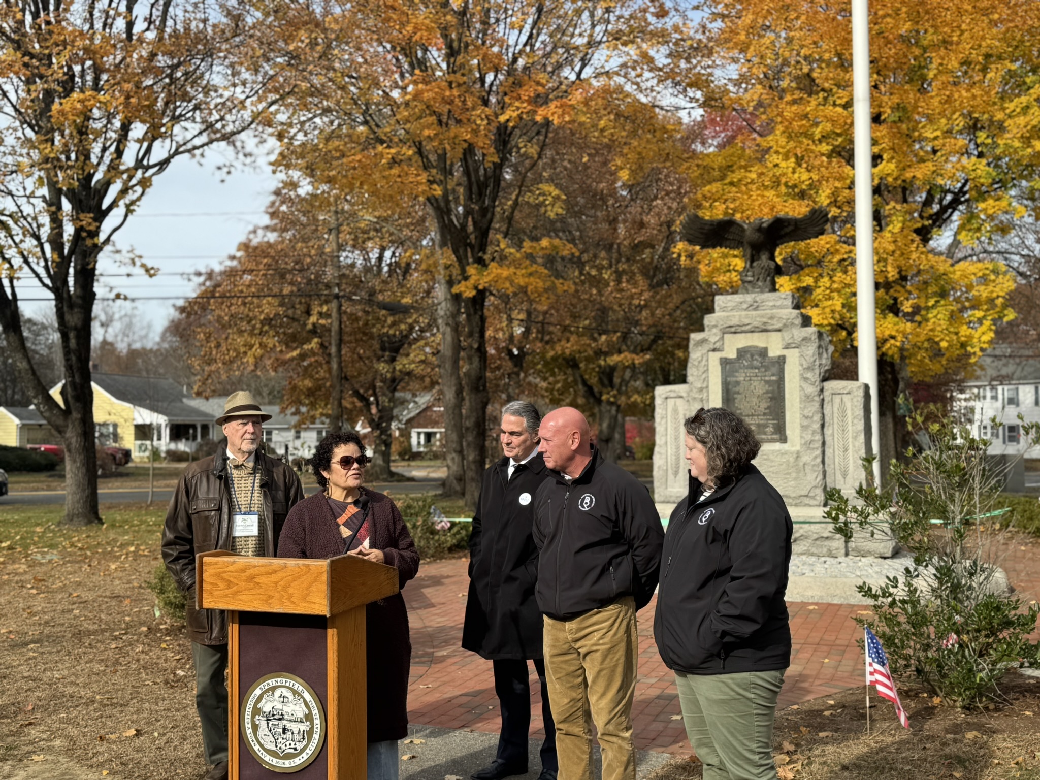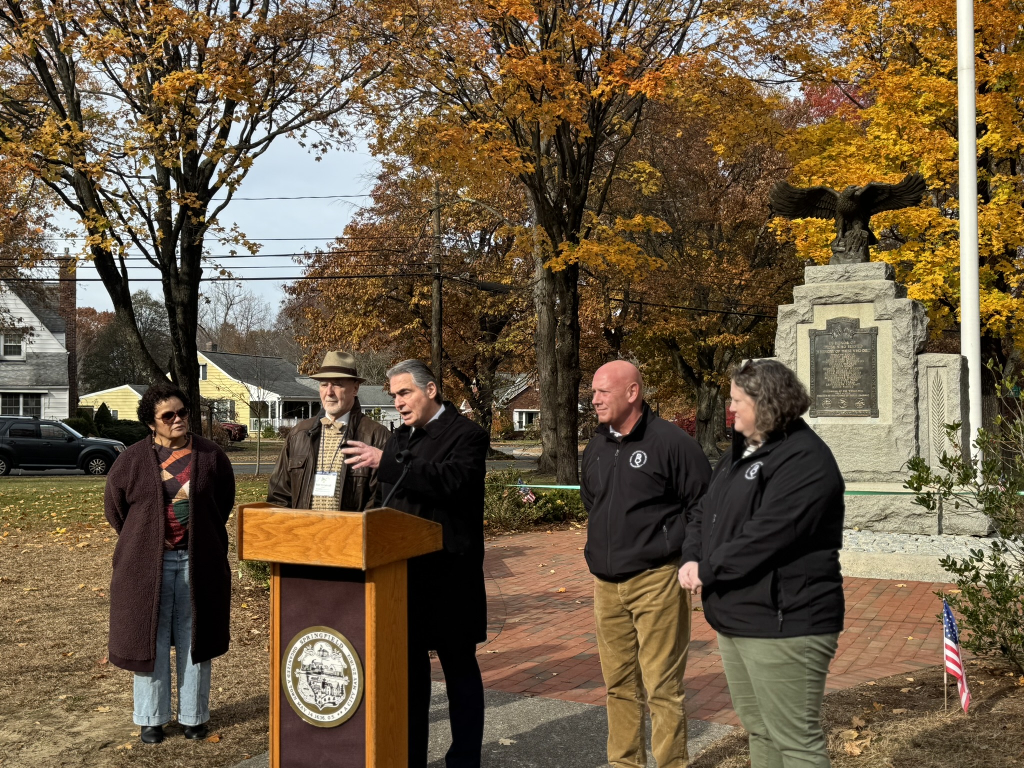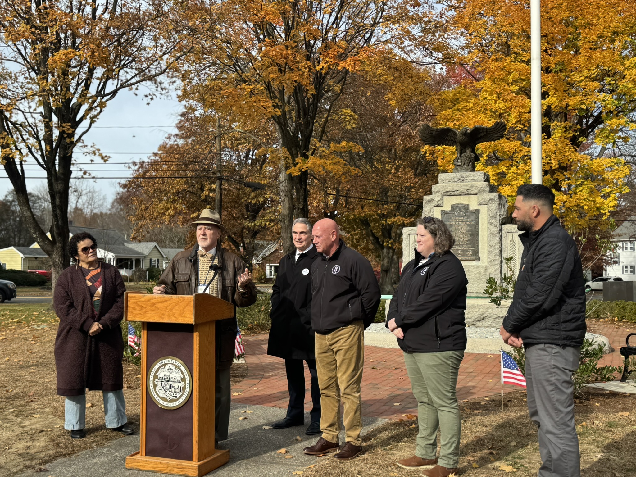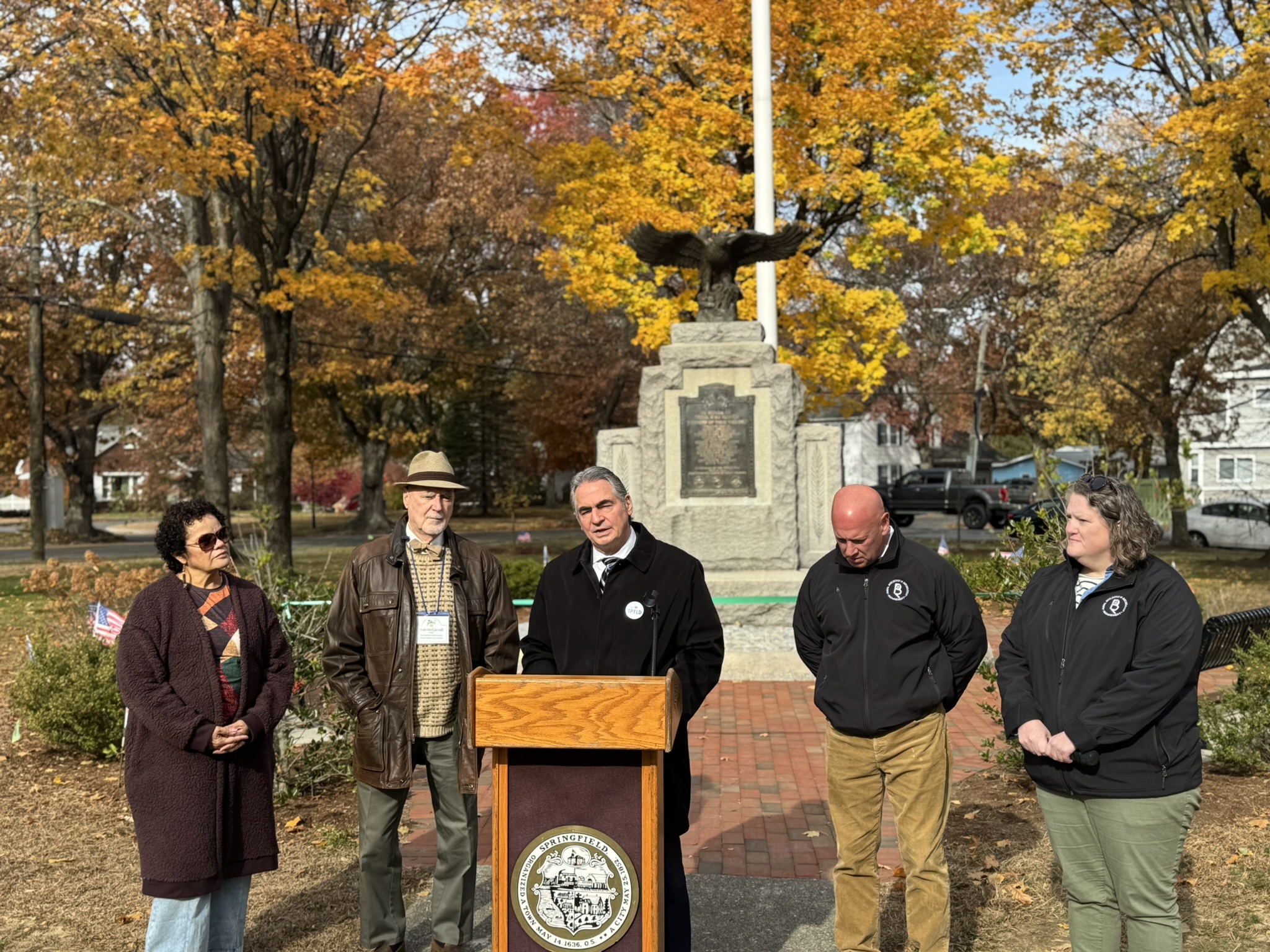 Mayor Domenic J. Sarno, Executive Director of Parks, Buildings, and Recreation Management (PBRM) Director Tom Ashe, Director of Veteran’s Services Joe DeCaro, City Councilor Zaida Govan, the Indian Orchard Citizens Council, members of the Community Preservation Committee (CPC) and CPC Chair Bob McCarroll joined on Friday morning for the unveiling of Godfrey Park Triangle upgrades, the completed restoration of a World War I Memorial, and replacement of the missing bronze eagle.
