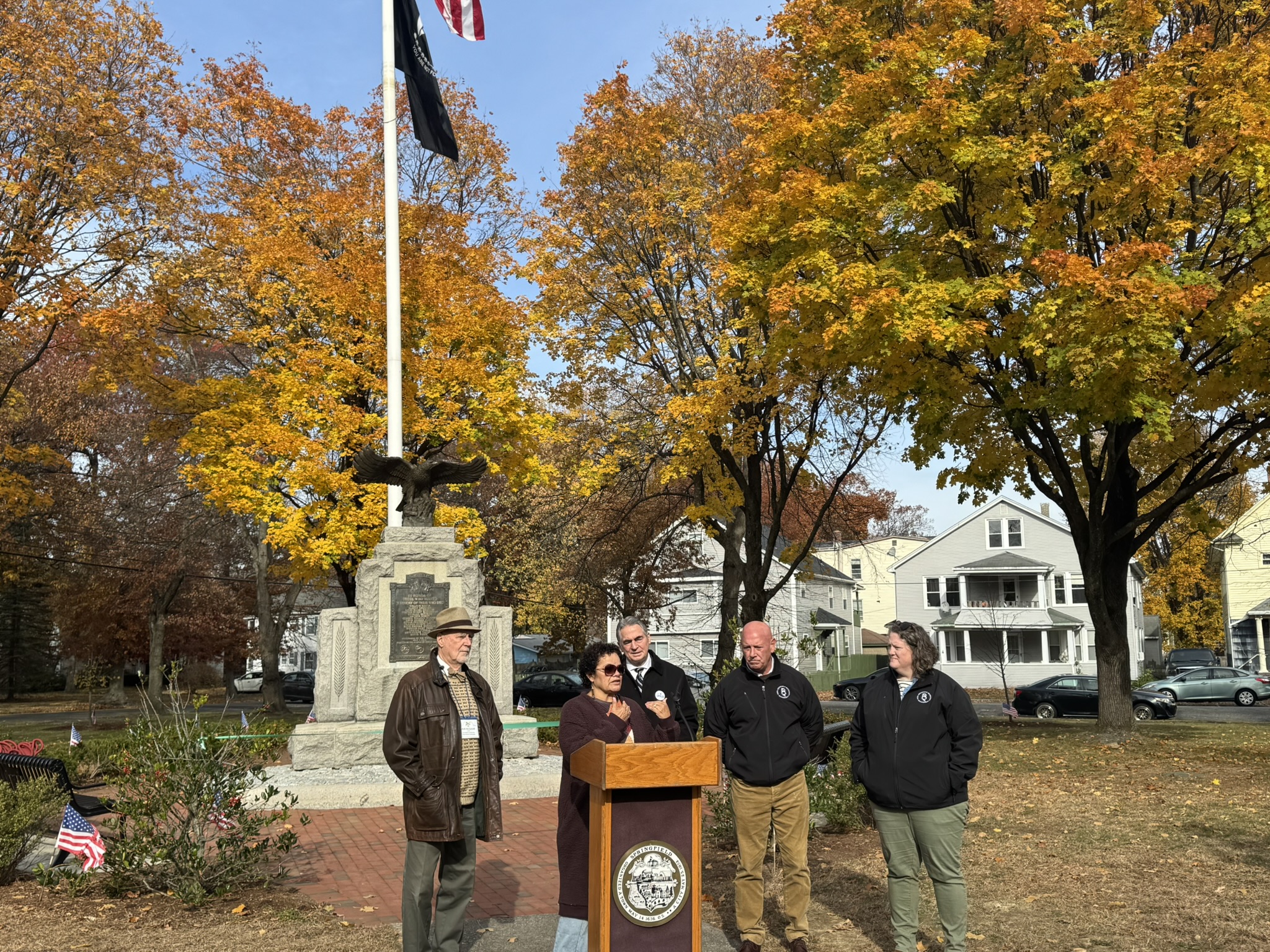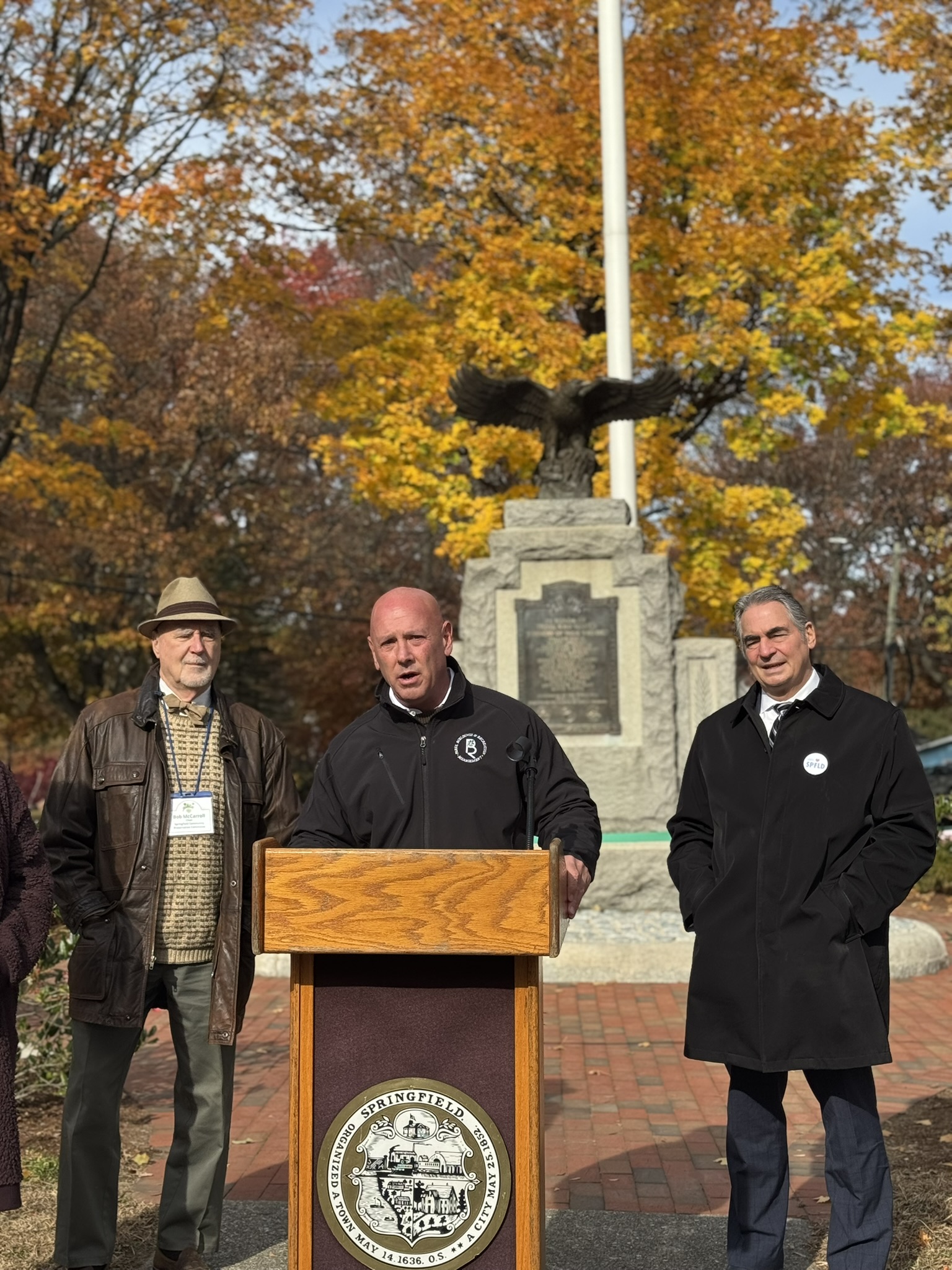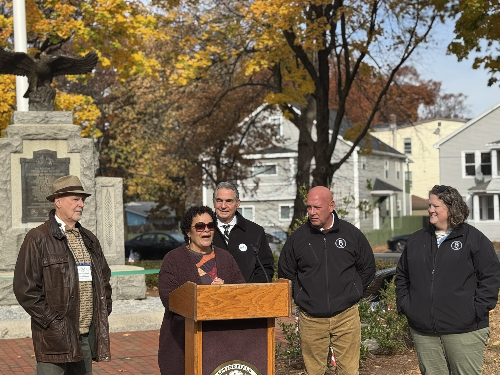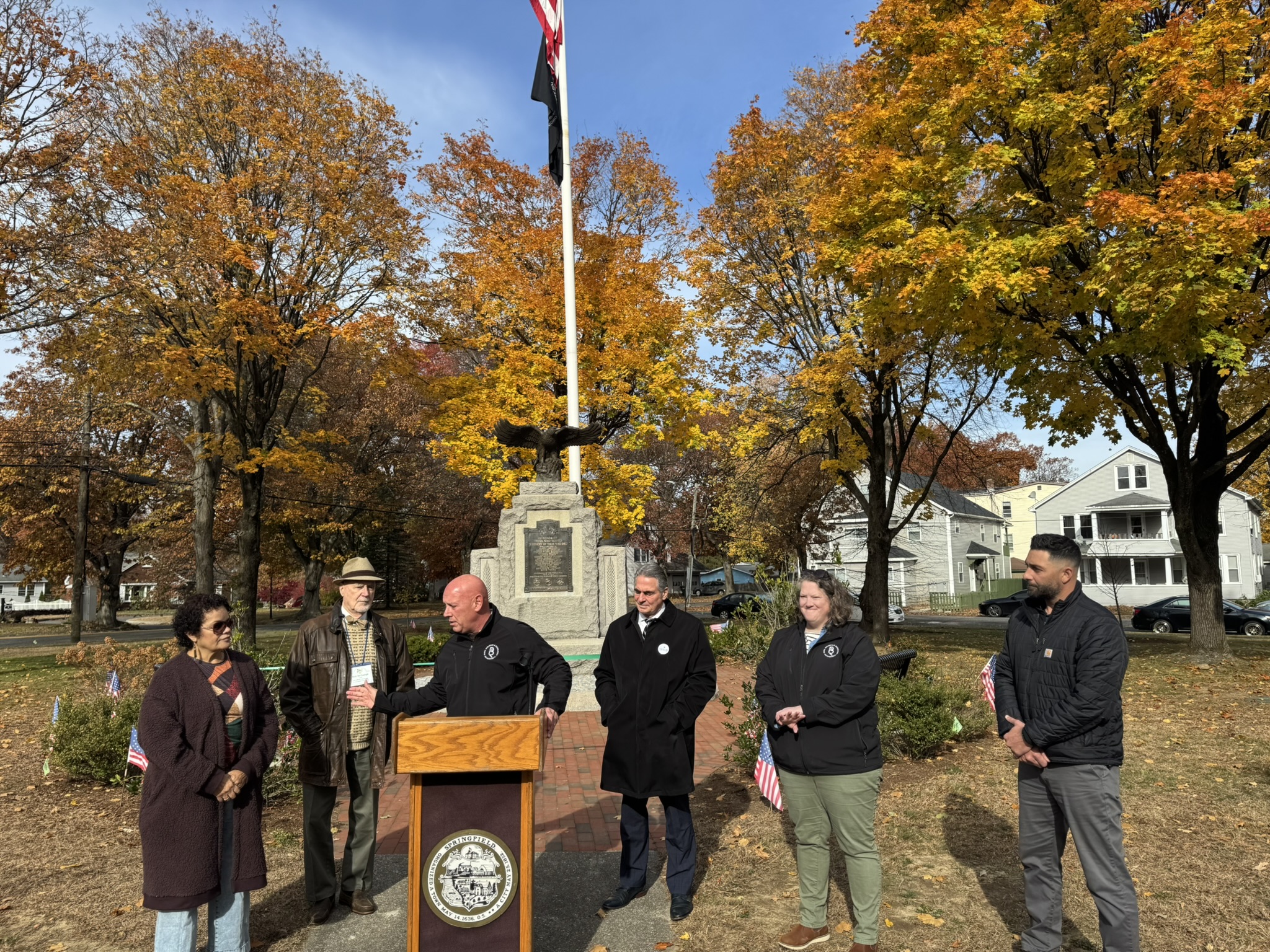 Mayor Domenic J. Sarno, Executive Director of Parks, Buildings, and Recreation Management (PBRM) Director Tom Ashe, Director of Veteran’s Services Joe DeCaro, City Councilor Zaida Govan, the Indian Orchard Citizens Council, members of the Community Preservation Committee (CPC) and CPC Chair Bob McCarroll joined on Friday morning for the unveiling of Godfrey Park Triangle upgrades, the completed restoration of a World War I Memorial, and replacement of the missing bronze eagle.