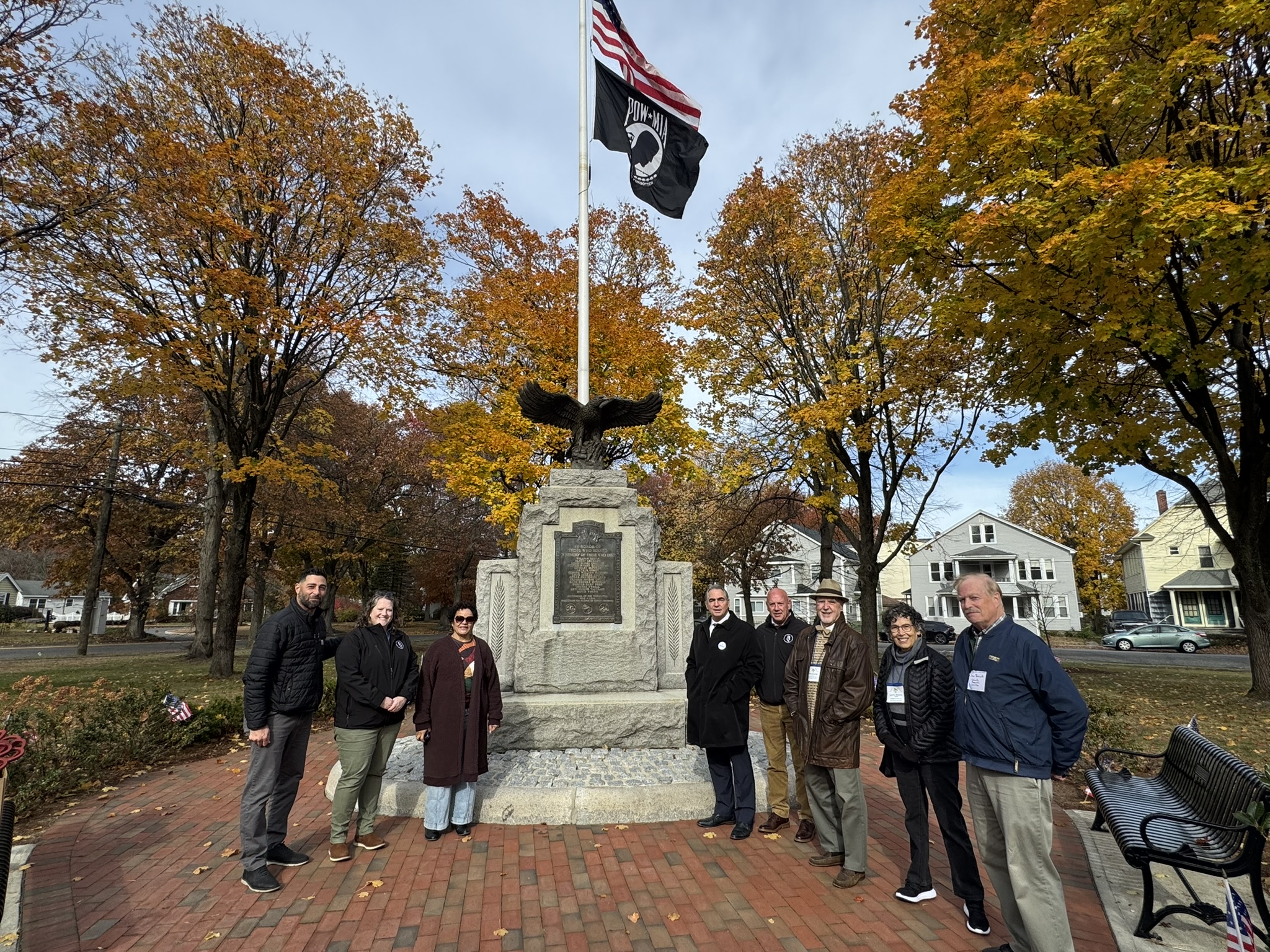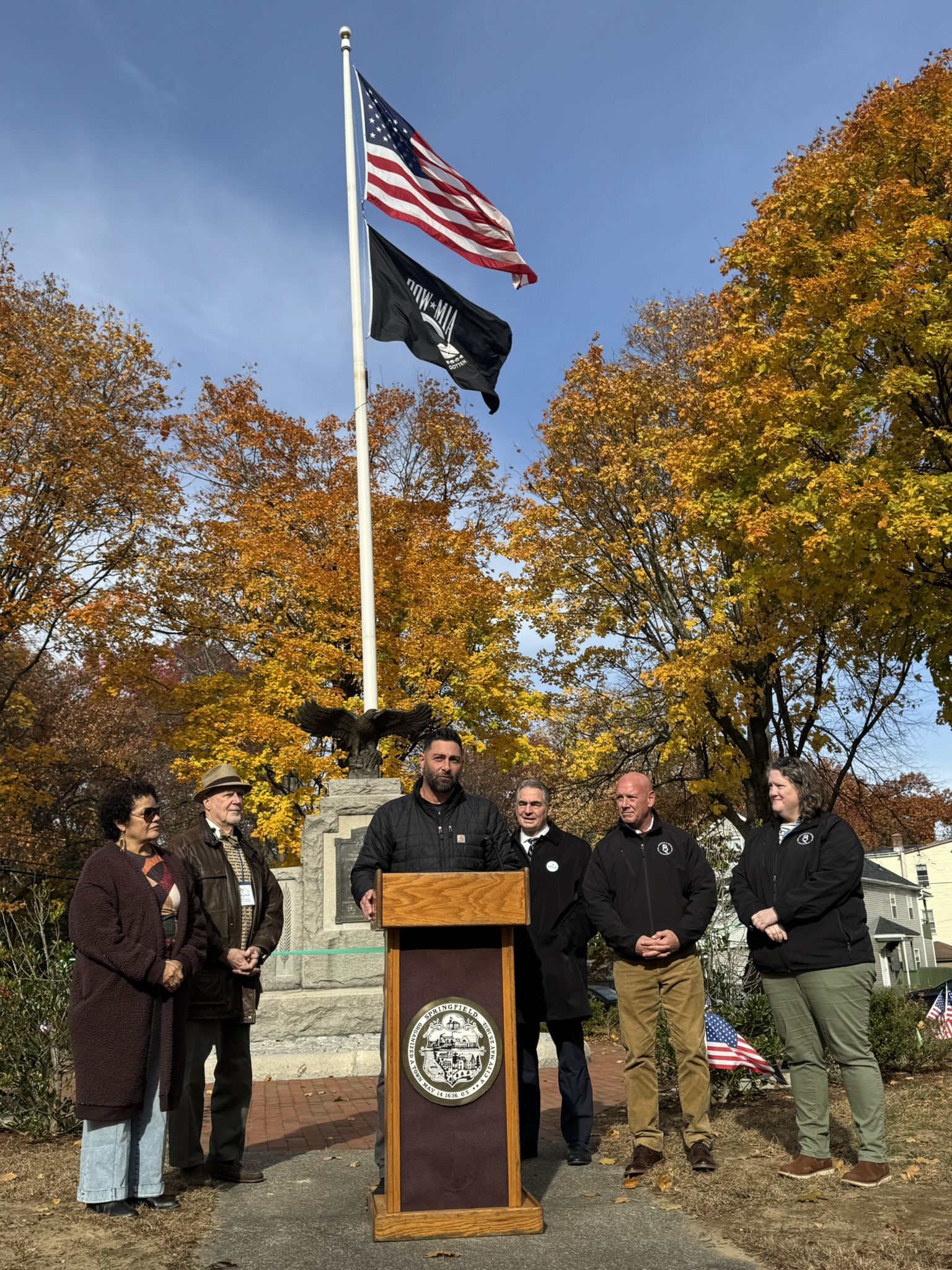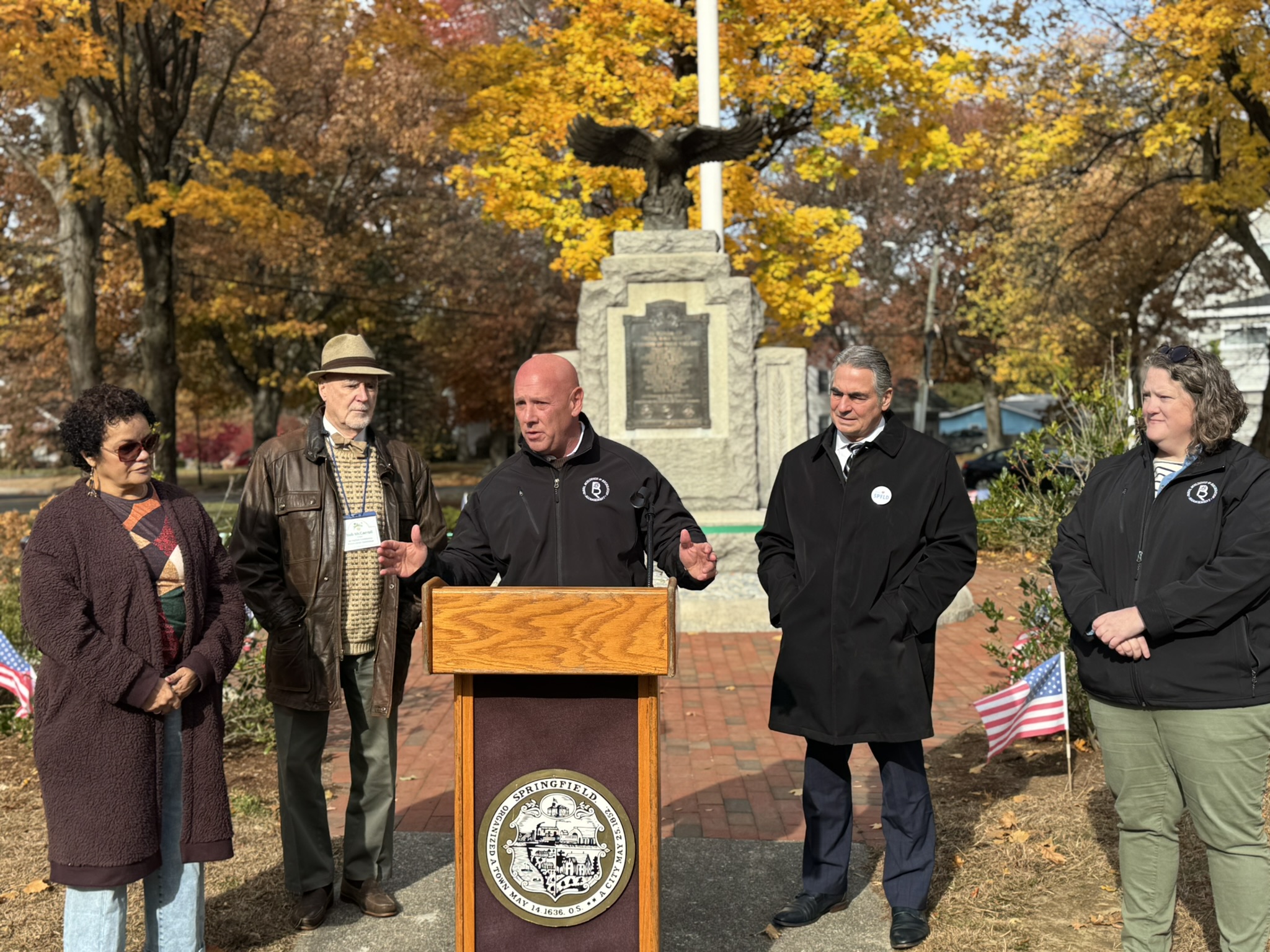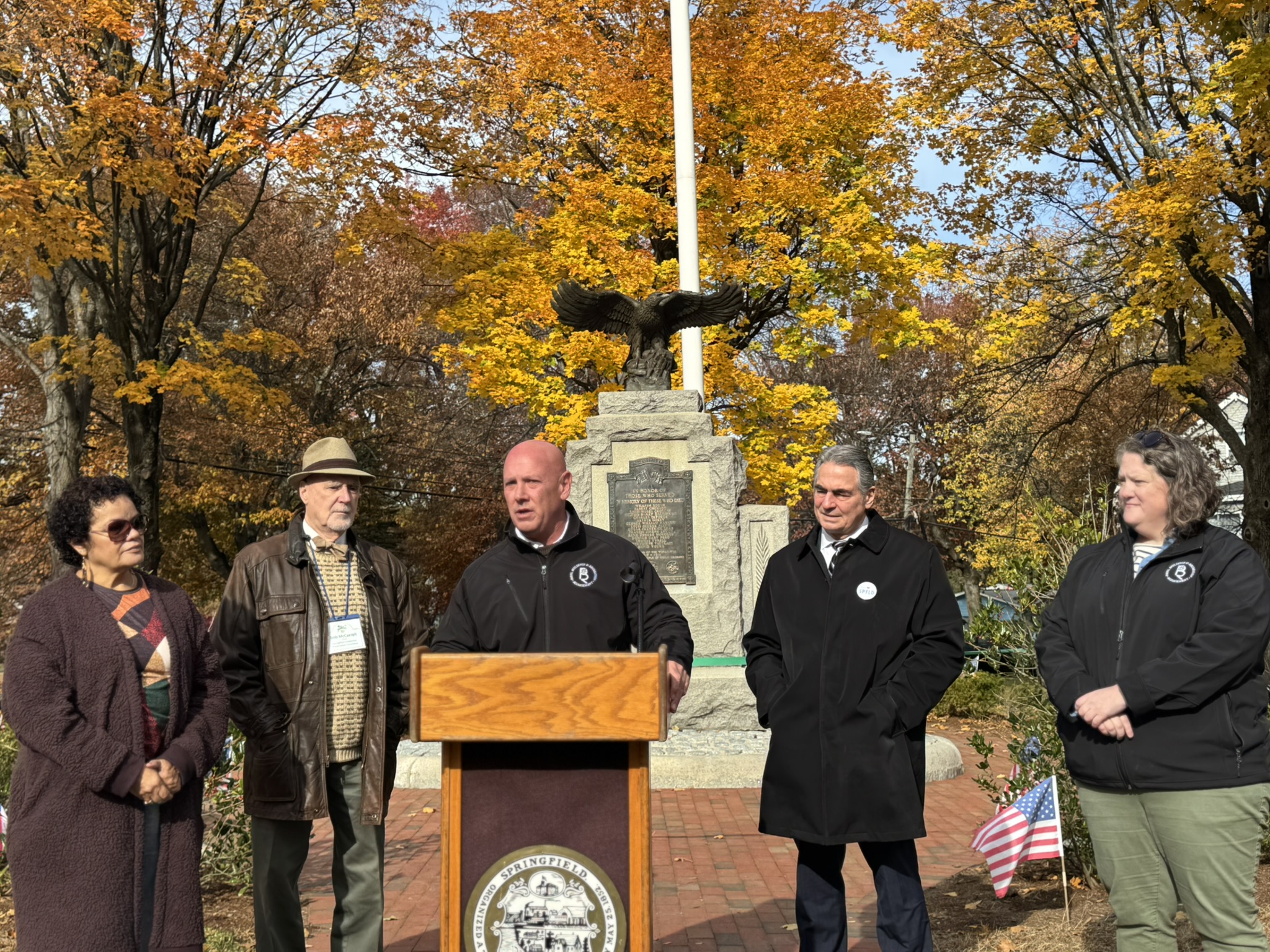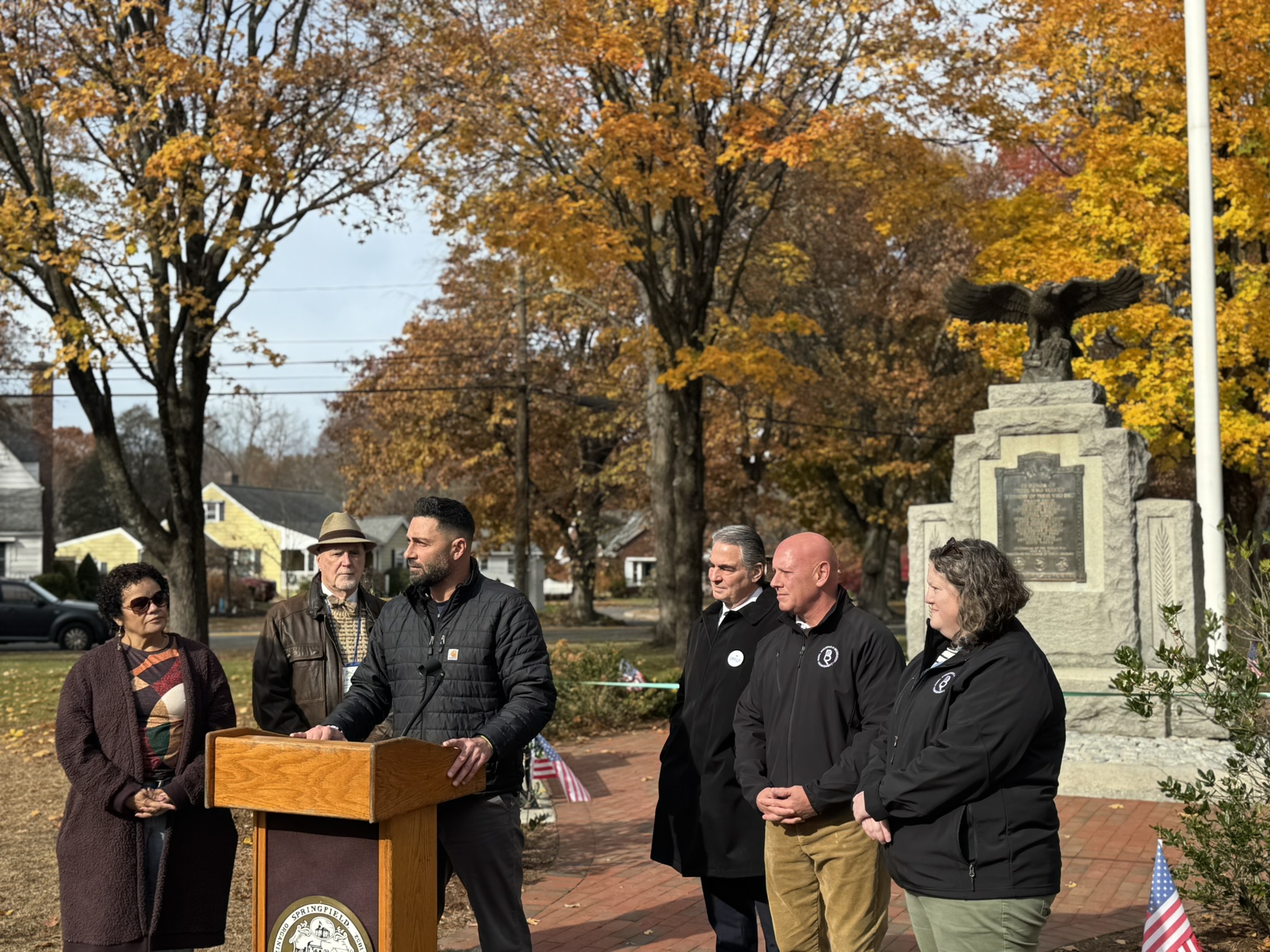Mayor Domenic J. Sarno, Executive Director of Parks, Buildings, and Recreation Management (PBRM) Director Tom Ashe, Director of Veteran’s Services Joe DeCaro, City Councilor Zaida Govan, the Indian Orchard Citizens Council, members of the Community Preservation Committee (CPC) and CPC Chair Bob McCarroll joined on Friday morning for the unveiling of Godfrey Park Triangle upgrades, the completed restoration of a World War I Memorial, and replacement of the missing bronze eagle.